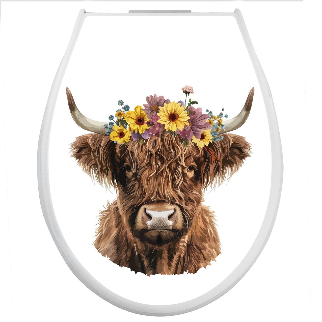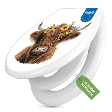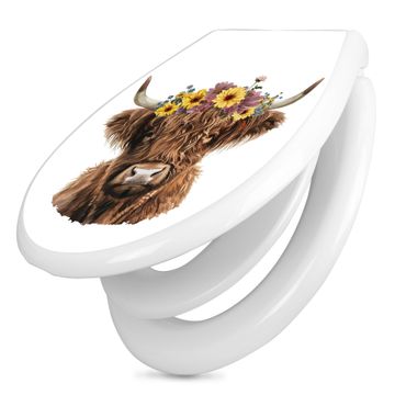 Toilettendeckel weiß mit Absenkautomatik Motiv Hochlandkuh mit Blumenkrone