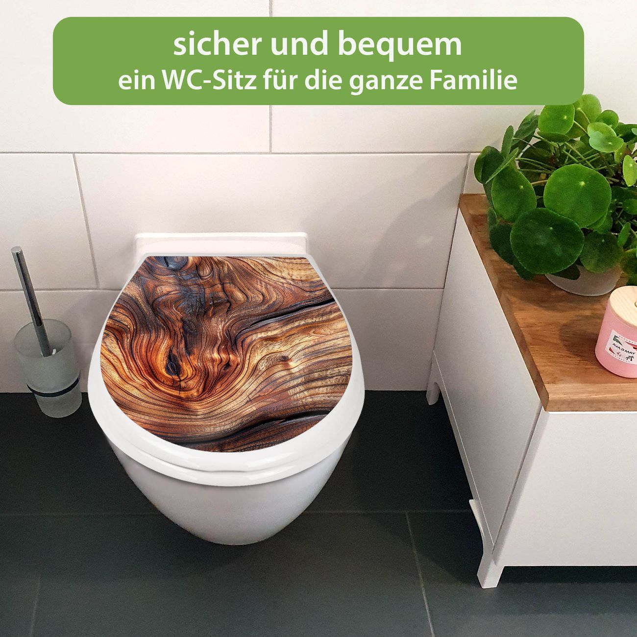 FUNKTION:Mit dem banjado Familien WC Sitz mit Absenkautomatik und dem Motiv Motiv Holz Gemasert Kurve verbinden Sie Design mit Funktionalität. Sie erhalten den Toilettendeckel in bewährt guter Qualität mit Montagematerial passend auf alle Euro-WC-Becken. Die Gesamtgröße beträgt 37,1cm x 44,9cm x 5cm, die Grundfarbe ist weiß.</p> DESIGN:Der Klodeckel in weiß mit Motiv Motiv Holz Gemasert Kurve hat eine ansprechende Optik, eine besondere Form und ist sehr stabil. Das Motiv besteht aus einer farbbrillianten Motivfolie, die durch ein Schutzlaminat zusätzlich vor Kratzern schützt. Der integrierte Kindersitz fügt sich harmonisch ein. DETAILS:Der Toilettensitz mit Soft Close besteht aus hochwertigem Polypropylen, ist geruchlos, ungiftig und kann mit handelsüblicher Seife gereinigt werden. Die Montage kann von von oben oder von unten erfolgen und ist kinderleicht. NUTZEN:Mit Hilfe der detaillierten Aufbauanleitung ermöglichen wir eine schnelle und unkomplizierte Montage. Die banjado Klobrille ist universell geeignet für alle Euro-WC-Schüsseln. Der Kindersitz kann unkompliziert entfernt werden. BANJADO:Ihr WC-Deckel wird in Sachsen in einer kleinen Manufaktur von Hand veredelt. Die Motivfolie ist lösungsmittelfrei und schutzlaminiert für einen langen Halt. Wir wünschen viel Freude bei der Auswahl eines schönen Motivs.