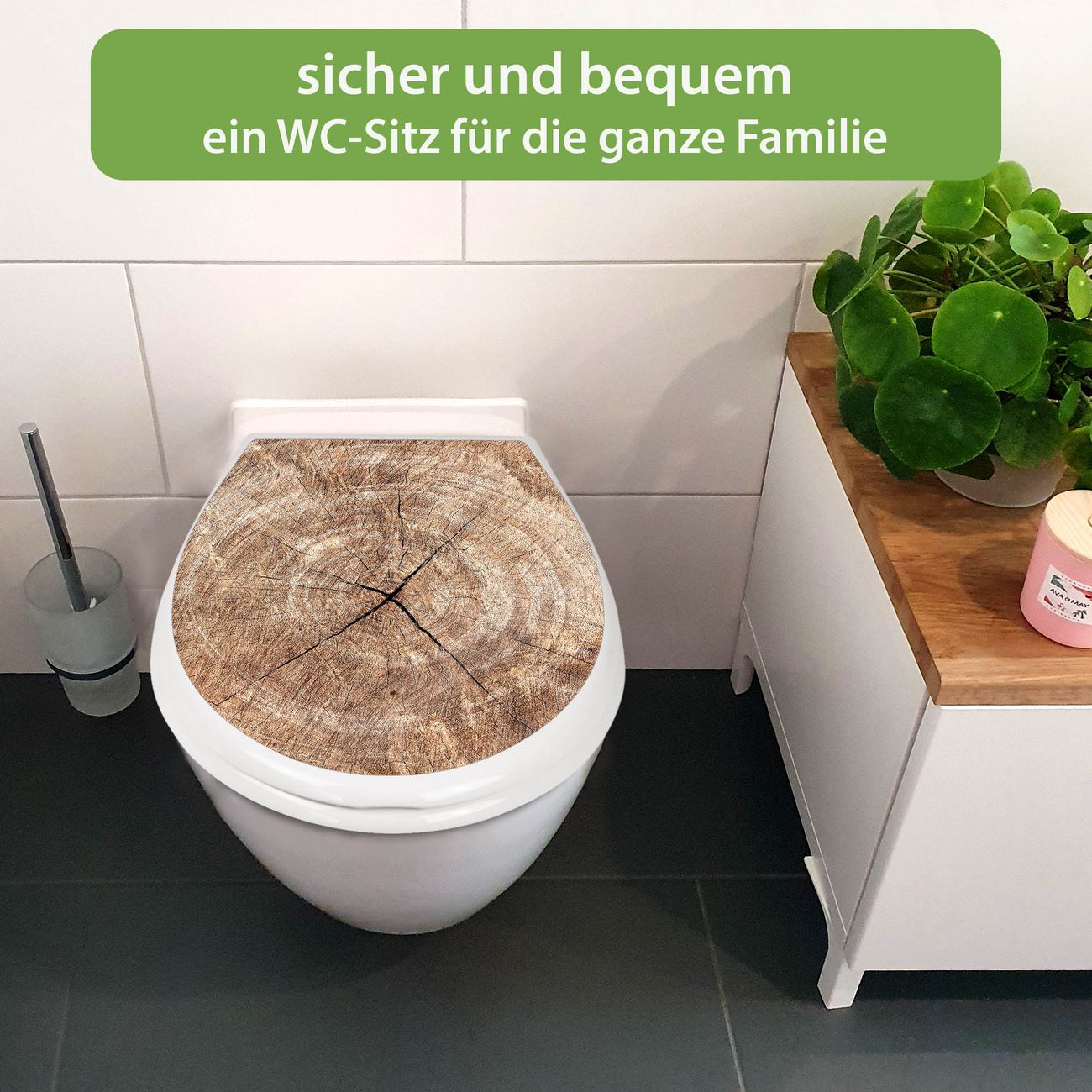 FUNKTION:Mit dem banjado Familien WC Sitz mit Absenkautomatik und dem Motiv Motiv Holzkreis mit Rissen verbinden Sie Design mit Funktionalität. Sie erhalten den Toilettendeckel in bewährt guter Qualität mit Montagematerial passend auf alle Euro-WC-Becken. Die Gesamtgröße beträgt 37,1cm x 44,9cm x 5cm, die Grundfarbe ist weiß.</p> DESIGN:Der Klodeckel in weiß mit Motiv Motiv Holzkreis mit Rissen hat eine ansprechende Optik, eine besondere Form und ist sehr stabil. Das Motiv besteht aus einer farbbrillianten Motivfolie, die durch ein Schutzlaminat zusätzlich vor Kratzern schützt. Der integrierte Kindersitz fügt sich harmonisch ein. DETAILS:Der Toilettensitz mit Soft Close besteht aus hochwertigem Polypropylen, ist geruchlos, ungiftig und kann mit handelsüblicher Seife gereinigt werden. Die Montage kann von von oben oder von unten erfolgen und ist kinderleicht. NUTZEN:Mit Hilfe der detaillierten Aufbauanleitung ermöglichen wir eine schnelle und unkomplizierte Montage. Die banjado Klobrille ist universell geeignet für alle Euro-WC-Schüsseln. Der Kindersitz kann unkompliziert entfernt werden. BANJADO:Ihr WC-Deckel wird in Sachsen in einer kleinen Manufaktur von Hand veredelt. Die Motivfolie ist lösungsmittelfrei und schutzlaminiert für einen langen Halt. Wir wünschen viel Freude bei der Auswahl eines schönen Motivs.