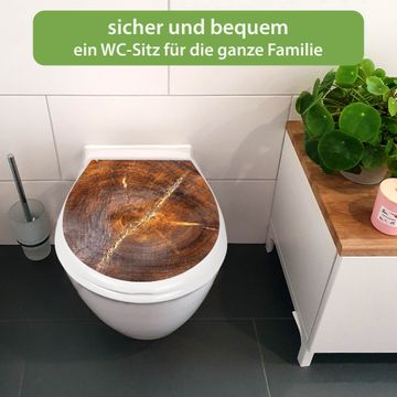 FUNKTION:Mit dem banjado Familien WC Sitz mit Absenkautomatik und dem Motiv Motiv Holzring mit Rissen verbinden Sie Design mit Funktionalität. Sie erhalten den Toilettendeckel in bewährt guter Qualität mit Montagematerial passend auf alle Euro-WC-Becken. Die Gesamtgröße beträgt 37,1cm x 44,9cm x 5cm, die Grundfarbe ist weiß.</p> DESIGN:Der Klodeckel in weiß mit Motiv Motiv Holzring mit Rissen hat eine ansprechende Optik, eine besondere Form und ist sehr stabil. Das Motiv besteht aus einer farbbrillianten Motivfolie, die durch ein Schutzlaminat zusätzlich vor Kratzern schützt. Der integrierte Kindersitz fügt sich harmonisch ein. DETAILS:Der Toilettensitz mit Soft Close besteht aus hochwertigem Polypropylen, ist geruchlos, ungiftig und kann mit handelsüblicher Seife gereinigt werden. Die Montage kann von von oben oder von unten erfolgen und ist kinderleicht. NUTZEN:Mit Hilfe der detaillierten Aufbauanleitung ermöglichen wir eine schnelle und unkomplizierte Montage. Die banjado Klobrille ist universell geeignet für alle Euro-WC-Schüsseln. Der Kindersitz kann unkompliziert entfernt werden. BANJADO:Ihr WC-Deckel wird in Sachsen in einer kleinen Manufaktur von Hand veredelt. Die Motivfolie ist lösungsmittelfrei und schutzlaminiert für einen langen Halt. Wir wünschen viel Freude bei der Auswahl eines schönen Motivs.