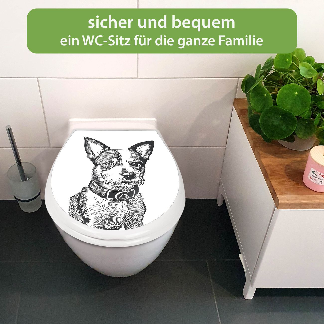FUNKTION:Mit dem banjado Familien WC Sitz mit Absenkautomatik und dem Motiv Motiv Hundeskizze 2 verbinden Sie Design mit Funktionalität. Sie erhalten den Toilettendeckel in bewährt guter Qualität mit Montagematerial passend auf alle Euro-WC-Becken. Die Gesamtgröße beträgt 37,1cm x 44,9cm x 5cm, die Grundfarbe ist weiß.</p> DESIGN:Der Klodeckel in weiß mit Motiv Motiv Hundeskizze 2 hat eine ansprechende Optik, eine besondere Form und ist sehr stabil. Das Motiv besteht aus einer farbbrillianten Motivfolie, die durch ein Schutzlaminat zusätzlich vor Kratzern schützt. Der integrierte Kindersitz fügt sich harmonisch ein. DETAILS:Der Toilettensitz mit Soft Close besteht aus hochwertigem Polypropylen, ist geruchlos, ungiftig und kann mit handelsüblicher Seife gereinigt werden. Die Montage kann von von oben oder von unten erfolgen und ist kinderleicht. NUTZEN:Mit Hilfe der detaillierten Aufbauanleitung ermöglichen wir eine schnelle und unkomplizierte Montage. Die banjado Klobrille ist universell geeignet für alle Euro-WC-Schüsseln. Der Kindersitz kann unkompliziert entfernt werden. BANJADO:Ihr WC-Deckel wird in Sachsen in einer kleinen Manufaktur von Hand veredelt. Die Motivfolie ist lösungsmittelfrei und schutzlaminiert für einen langen Halt. Wir wünschen viel Freude bei der Auswahl eines schönen Motivs.