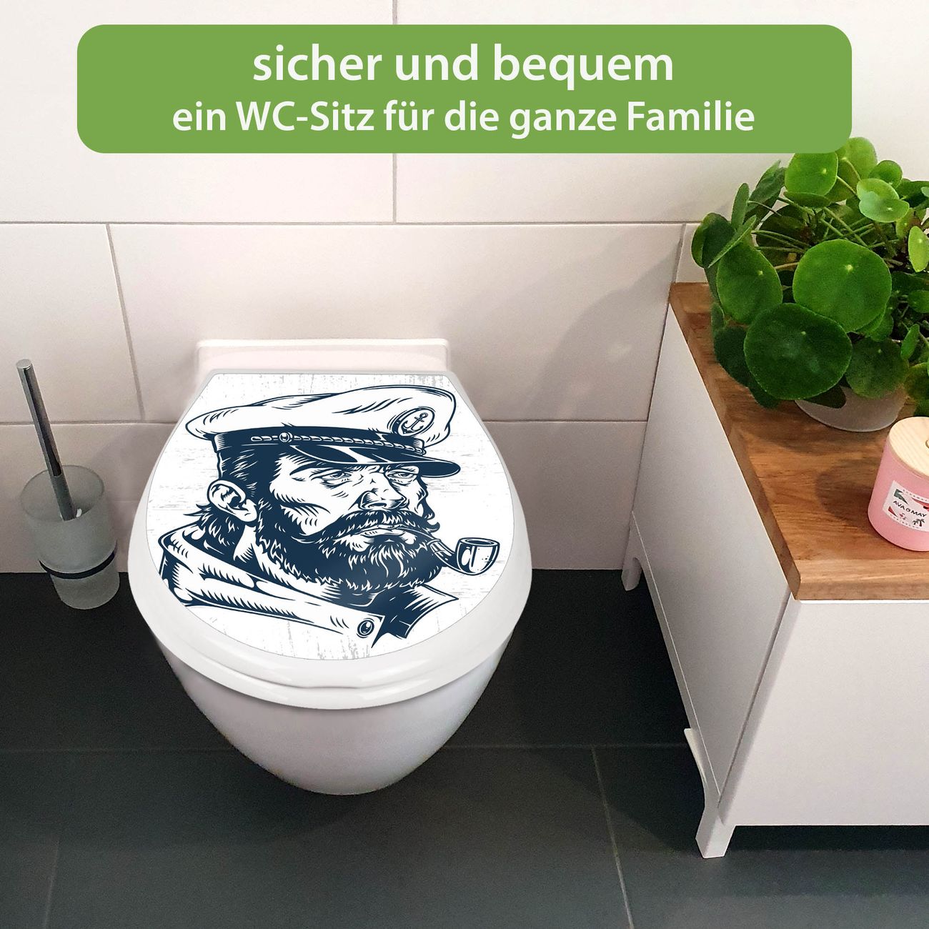 FUNKTION:Mit dem banjado Familien WC Sitz mit Absenkautomatik und dem Motiv Motiv Kapitän Portrait verbinden Sie Design mit Funktionalität. Sie erhalten den Toilettendeckel in bewährt guter Qualität mit Montagematerial passend auf alle Euro-WC-Becken. Die Gesamtgröße beträgt 37,1cm x 44,9cm x 5cm, die Grundfarbe ist weiß.</p> DESIGN:Der Klodeckel in weiß mit Motiv Motiv Kapitän Portrait hat eine ansprechende Optik, eine besondere Form und ist sehr stabil. Das Motiv besteht aus einer farbbrillianten Motivfolie, die durch ein Schutzlaminat zusätzlich vor Kratzern schützt. Der integrierte Kindersitz fügt sich harmonisch ein. DETAILS:Der Toilettensitz mit Soft Close besteht aus hochwertigem Polypropylen, ist geruchlos, ungiftig und kann mit handelsüblicher Seife gereinigt werden. Die Montage kann von von oben oder von unten erfolgen und ist kinderleicht. NUTZEN:Mit Hilfe der detaillierten Aufbauanleitung ermöglichen wir eine schnelle und unkomplizierte Montage. Die banjado Klobrille ist universell geeignet für alle Euro-WC-Schüsseln. Der Kindersitz kann unkompliziert entfernt werden. BANJADO:Ihr WC-Deckel wird in Sachsen in einer kleinen Manufaktur von Hand veredelt. Die Motivfolie ist lösungsmittelfrei und schutzlaminiert für einen langen Halt. Wir wünschen viel Freude bei der Auswahl eines schönen Motivs.