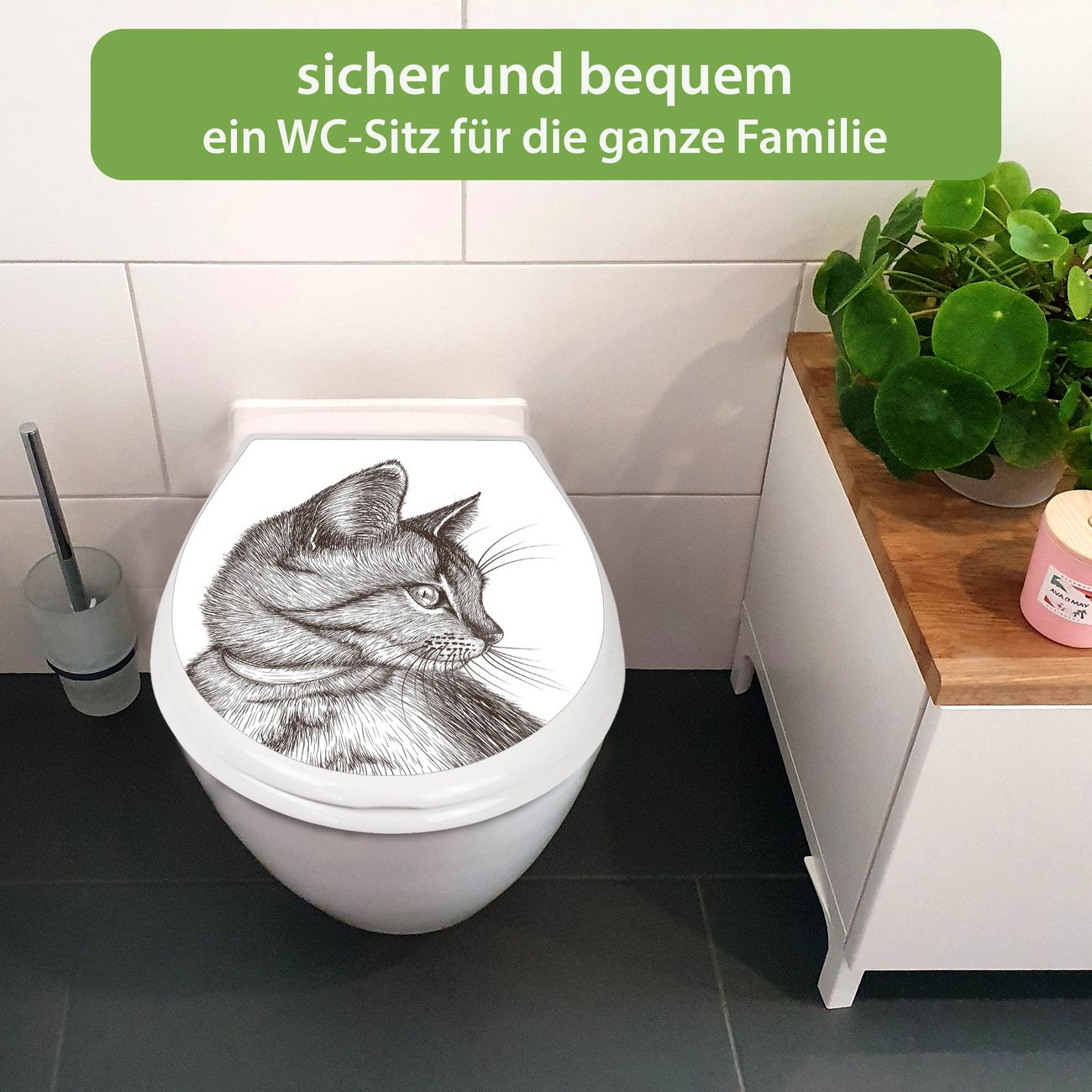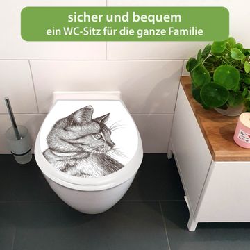 FUNKTION:Mit dem banjado Familien WC Sitz mit Absenkautomatik und dem Motiv Motiv Katzenillustration verbinden Sie Design mit Funktionalität. Sie erhalten den Toilettendeckel in bewährt guter Qualität mit Montagematerial passend auf alle Euro-WC-Becken. Die Gesamtgröße beträgt 37,1cm x 44,9cm x 5cm, die Grundfarbe ist weiß.</p> DESIGN:Der Klodeckel in weiß mit Motiv Motiv Katzenillustration hat eine ansprechende Optik, eine besondere Form und ist sehr stabil. Das Motiv besteht aus einer farbbrillianten Motivfolie, die durch ein Schutzlaminat zusätzlich vor Kratzern schützt. Der integrierte Kindersitz fügt sich harmonisch ein. DETAILS:Der Toilettensitz mit Soft Close besteht aus hochwertigem Polypropylen, ist geruchlos, ungiftig und kann mit handelsüblicher Seife gereinigt werden. Die Montage kann von von oben oder von unten erfolgen und ist kinderleicht. NUTZEN:Mit Hilfe der detaillierten Aufbauanleitung ermöglichen wir eine schnelle und unkomplizierte Montage. Die banjado Klobrille ist universell geeignet für alle Euro-WC-Schüsseln. Der Kindersitz kann unkompliziert entfernt werden. BANJADO:Ihr WC-Deckel wird in Sachsen in einer kleinen Manufaktur von Hand veredelt. Die Motivfolie ist lösungsmittelfrei und schutzlaminiert für einen langen Halt. Wir wünschen viel Freude bei der Auswahl eines schönen Motivs.