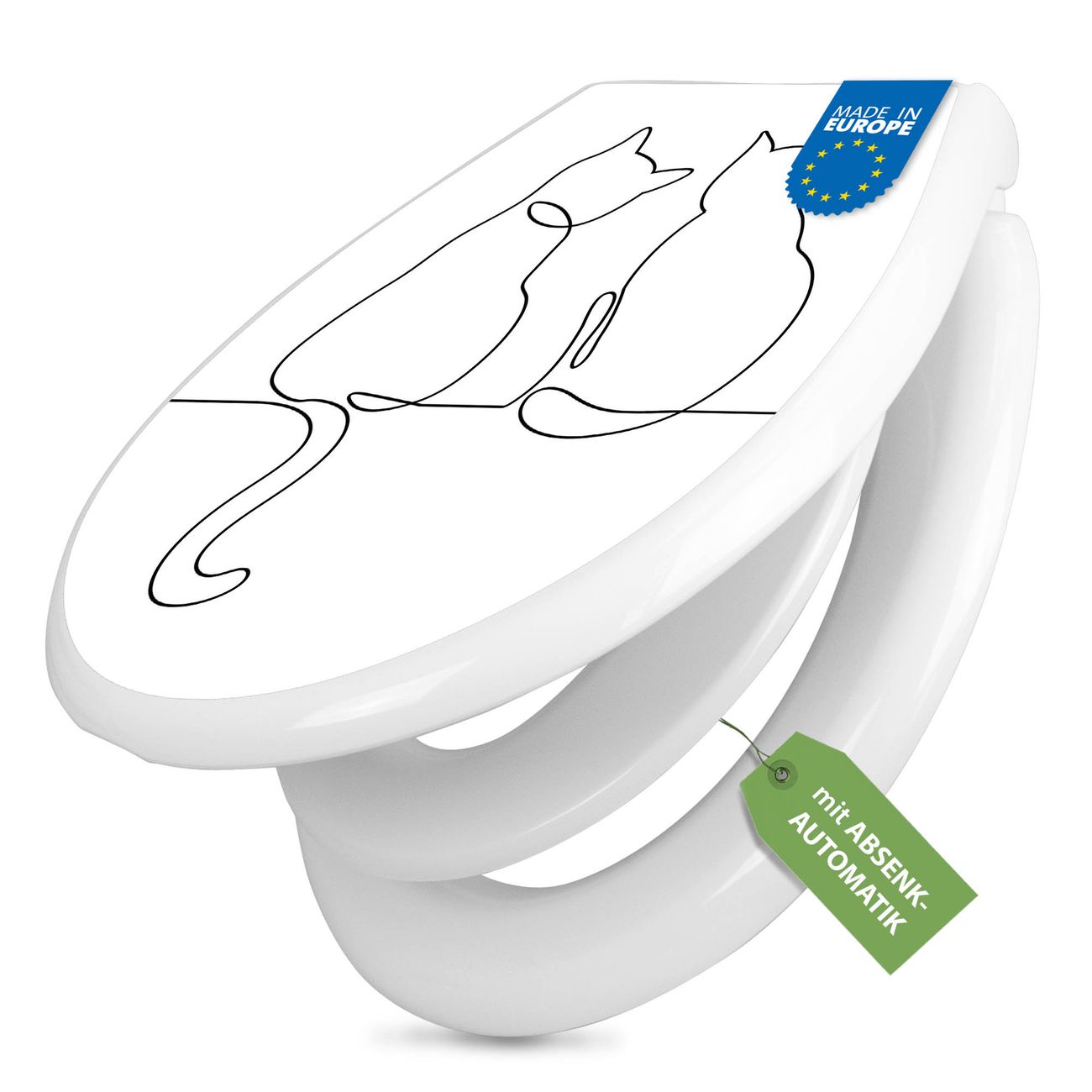 FUNKTION:Mit dem banjado Familien WC Sitz mit Absenkautomatik und dem Motiv Motiv Katzenliebe 2 verbinden Sie Design mit Funktionalität. Sie erhalten den Toilettendeckel in bewährt guter Qualität mit Montagematerial passend auf alle Euro-WC-Becken. Die Gesamtgröße beträgt 37,1cm x 44,9cm x 5cm, die Grundfarbe ist weiß.</p> DESIGN:Der Klodeckel in weiß mit Motiv Motiv Katzenliebe 2 hat eine ansprechende Optik, eine besondere Form und ist sehr stabil. Das Motiv besteht aus einer farbbrillianten Motivfolie, die durch ein Schutzlaminat zusätzlich vor Kratzern schützt. Der integrierte Kindersitz fügt sich harmonisch ein. DETAILS:Der Toilettensitz mit Soft Close besteht aus hochwertigem Polypropylen, ist geruchlos, ungiftig und kann mit handelsüblicher Seife gereinigt werden. Die Montage kann von von oben oder von unten erfolgen und ist kinderleicht. NUTZEN:Mit Hilfe der detaillierten Aufbauanleitung ermöglichen wir eine schnelle und unkomplizierte Montage. Die banjado Klobrille ist universell geeignet für alle Euro-WC-Schüsseln. Der Kindersitz kann unkompliziert entfernt werden. BANJADO:Ihr WC-Deckel wird in Sachsen in einer kleinen Manufaktur von Hand veredelt. Die Motivfolie ist lösungsmittelfrei und schutzlaminiert für einen langen Halt. Wir wünschen viel Freude bei der Auswahl eines schönen Motivs.