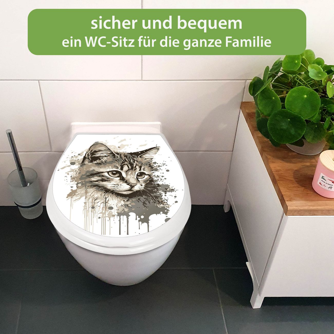 FUNKTION:Mit dem banjado Familien WC Sitz mit Absenkautomatik und dem Motiv Motiv Katzenportrait in Aquarell 3 verbinden Sie Design mit Funktionalität. Sie erhalten den Toilettendeckel in bewährt guter Qualität mit Montagematerial passend auf alle Euro-WC-Becken. Die Gesamtgröße beträgt 37,1cm x 44,9cm x 5cm, die Grundfarbe ist weiß.</p> DESIGN:Der Klodeckel in weiß mit Motiv Motiv Katzenportrait in Aquarell 3 hat eine ansprechende Optik, eine besondere Form und ist sehr stabil. Das Motiv besteht aus einer farbbrillianten Motivfolie, die durch ein Schutzlaminat zusätzlich vor Kratzern schützt. Der integrierte Kindersitz fügt sich harmonisch ein. DETAILS:Der Toilettensitz mit Soft Close besteht aus hochwertigem Polypropylen, ist geruchlos, ungiftig und kann mit handelsüblicher Seife gereinigt werden. Die Montage kann von von oben oder von unten erfolgen und ist kinderleicht. NUTZEN:Mit Hilfe der detaillierten Aufbauanleitung ermöglichen wir eine schnelle und unkomplizierte Montage. Die banjado Klobrille ist universell geeignet für alle Euro-WC-Schüsseln. Der Kindersitz kann unkompliziert entfernt werden. BANJADO:Ihr WC-Deckel wird in Sachsen in einer kleinen Manufaktur von Hand veredelt. Die Motivfolie ist lösungsmittelfrei und schutzlaminiert für einen langen Halt. Wir wünschen viel Freude bei der Auswahl eines schönen Motivs.