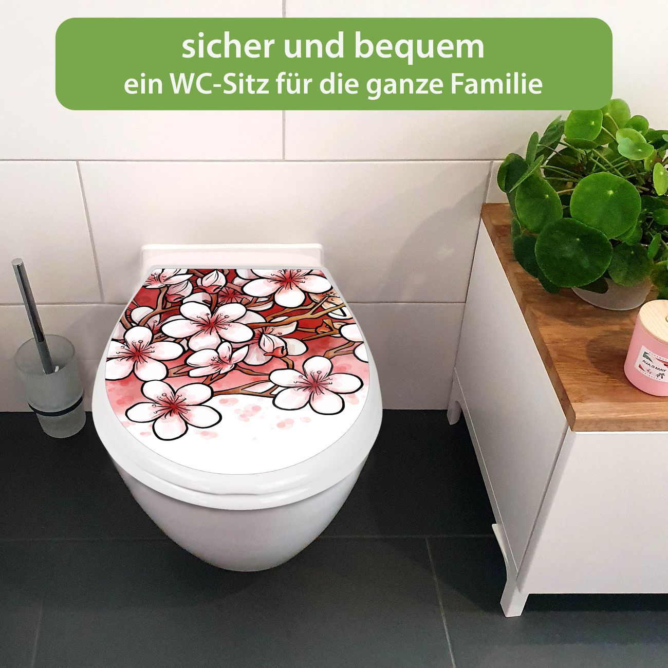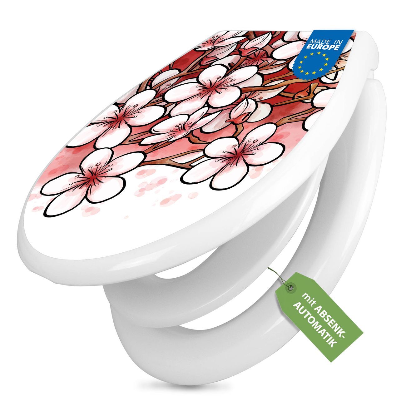 FUNKTION:Mit dem banjado Familien WC Sitz mit Absenkautomatik und dem Motiv Motiv Kirschblütentraum verbinden Sie Design mit Funktionalität. Sie erhalten den Toilettendeckel in bewährt guter Qualität mit Montagematerial passend auf alle Euro-WC-Becken. Die Gesamtgröße beträgt 37,1cm x 44,9cm x 5cm, die Grundfarbe ist weiß.</p> DESIGN:Der Klodeckel in weiß mit Motiv Motiv Kirschblütentraum hat eine ansprechende Optik, eine besondere Form und ist sehr stabil. Das Motiv besteht aus einer farbbrillianten Motivfolie, die durch ein Schutzlaminat zusätzlich vor Kratzern schützt. Der integrierte Kindersitz fügt sich harmonisch ein. DETAILS:Der Toilettensitz mit Soft Close besteht aus hochwertigem Polypropylen, ist geruchlos, ungiftig und kann mit handelsüblicher Seife gereinigt werden. Die Montage kann von von oben oder von unten erfolgen und ist kinderleicht. NUTZEN:Mit Hilfe der detaillierten Aufbauanleitung ermöglichen wir eine schnelle und unkomplizierte Montage. Die banjado Klobrille ist universell geeignet für alle Euro-WC-Schüsseln. Der Kindersitz kann unkompliziert entfernt werden. BANJADO:Ihr WC-Deckel wird in Sachsen in einer kleinen Manufaktur von Hand veredelt. Die Motivfolie ist lösungsmittelfrei und schutzlaminiert für einen langen Halt. Wir wünschen viel Freude bei der Auswahl eines schönen Motivs.