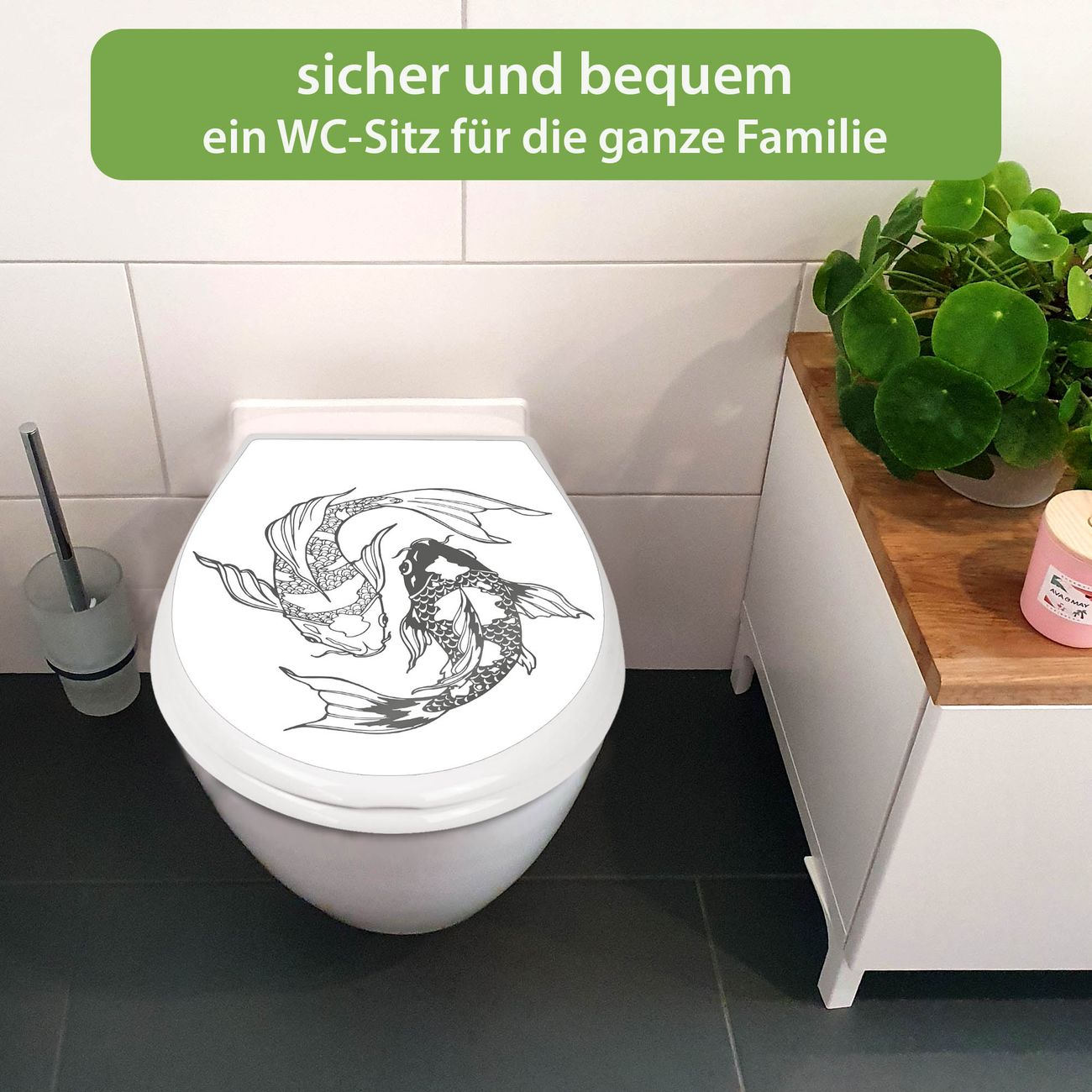 FUNKTION:Mit dem banjado Familien WC Sitz mit Absenkautomatik und dem Motiv Motiv Koi Paar 3 verbinden Sie Design mit Funktionalität. Sie erhalten den Toilettendeckel in bewährt guter Qualität mit Montagematerial passend auf alle Euro-WC-Becken. Die Gesamtgröße beträgt 37,1cm x 44,9cm x 5cm, die Grundfarbe ist weiß.</p> DESIGN:Der Klodeckel in weiß mit Motiv Motiv Koi Paar 3 hat eine ansprechende Optik, eine besondere Form und ist sehr stabil. Das Motiv besteht aus einer farbbrillianten Motivfolie, die durch ein Schutzlaminat zusätzlich vor Kratzern schützt. Der integrierte Kindersitz fügt sich harmonisch ein. DETAILS:Der Toilettensitz mit Soft Close besteht aus hochwertigem Polypropylen, ist geruchlos, ungiftig und kann mit handelsüblicher Seife gereinigt werden. Die Montage kann von von oben oder von unten erfolgen und ist kinderleicht. NUTZEN:Mit Hilfe der detaillierten Aufbauanleitung ermöglichen wir eine schnelle und unkomplizierte Montage. Die banjado Klobrille ist universell geeignet für alle Euro-WC-Schüsseln. Der Kindersitz kann unkompliziert entfernt werden. BANJADO:Ihr WC-Deckel wird in Sachsen in einer kleinen Manufaktur von Hand veredelt. Die Motivfolie ist lösungsmittelfrei und schutzlaminiert für einen langen Halt. Wir wünschen viel Freude bei der Auswahl eines schönen Motivs.