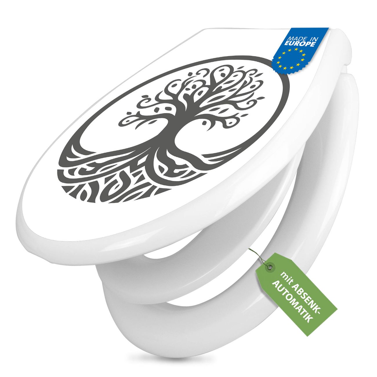 FUNKTION:Mit dem banjado Familien WC Sitz mit Absenkautomatik und dem Motiv Motiv Lebensbaum Silhouette 2 verbinden Sie Design mit Funktionalität. Sie erhalten den Toilettendeckel in bewährt guter Qualität mit Montagematerial passend auf alle Euro-WC-Becken. Die Gesamtgröße beträgt 37,1cm x 44,9cm x 5cm, die Grundfarbe ist weiß.</p> DESIGN:Der Klodeckel in weiß mit Motiv Motiv Lebensbaum Silhouette 2 hat eine ansprechende Optik, eine besondere Form und ist sehr stabil. Das Motiv besteht aus einer farbbrillianten Motivfolie, die durch ein Schutzlaminat zusätzlich vor Kratzern schützt. Der integrierte Kindersitz fügt sich harmonisch ein. DETAILS:Der Toilettensitz mit Soft Close besteht aus hochwertigem Polypropylen, ist geruchlos, ungiftig und kann mit handelsüblicher Seife gereinigt werden. Die Montage kann von von oben oder von unten erfolgen und ist kinderleicht. NUTZEN:Mit Hilfe der detaillierten Aufbauanleitung ermöglichen wir eine schnelle und unkomplizierte Montage. Die banjado Klobrille ist universell geeignet für alle Euro-WC-Schüsseln. Der Kindersitz kann unkompliziert entfernt werden. BANJADO:Ihr WC-Deckel wird in Sachsen in einer kleinen Manufaktur von Hand veredelt. Die Motivfolie ist lösungsmittelfrei und schutzlaminiert für einen langen Halt. Wir wünschen viel Freude bei der Auswahl eines schönen Motivs.