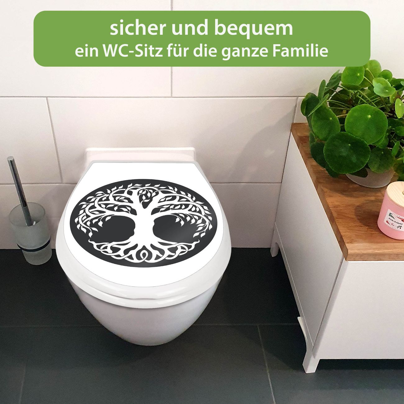 FUNKTION:Mit dem banjado Familien WC Sitz mit Absenkautomatik und dem Motiv Motiv Lebensbaum Silhouette verbinden Sie Design mit Funktionalität. Sie erhalten den Toilettendeckel in bewährt guter Qualität mit Montagematerial passend auf alle Euro-WC-Becken. Die Gesamtgröße beträgt 37,1cm x 44,9cm x 5cm, die Grundfarbe ist weiß.</p> DESIGN:Der Klodeckel in weiß mit Motiv Motiv Lebensbaum Silhouette hat eine ansprechende Optik, eine besondere Form und ist sehr stabil. Das Motiv besteht aus einer farbbrillianten Motivfolie, die durch ein Schutzlaminat zusätzlich vor Kratzern schützt. Der integrierte Kindersitz fügt sich harmonisch ein. DETAILS:Der Toilettensitz mit Soft Close besteht aus hochwertigem Polypropylen, ist geruchlos, ungiftig und kann mit handelsüblicher Seife gereinigt werden. Die Montage kann von von oben oder von unten erfolgen und ist kinderleicht. NUTZEN:Mit Hilfe der detaillierten Aufbauanleitung ermöglichen wir eine schnelle und unkomplizierte Montage. Die banjado Klobrille ist universell geeignet für alle Euro-WC-Schüsseln. Der Kindersitz kann unkompliziert entfernt werden. BANJADO:Ihr WC-Deckel wird in Sachsen in einer kleinen Manufaktur von Hand veredelt. Die Motivfolie ist lösungsmittelfrei und schutzlaminiert für einen langen Halt. Wir wünschen viel Freude bei der Auswahl eines schönen Motivs.