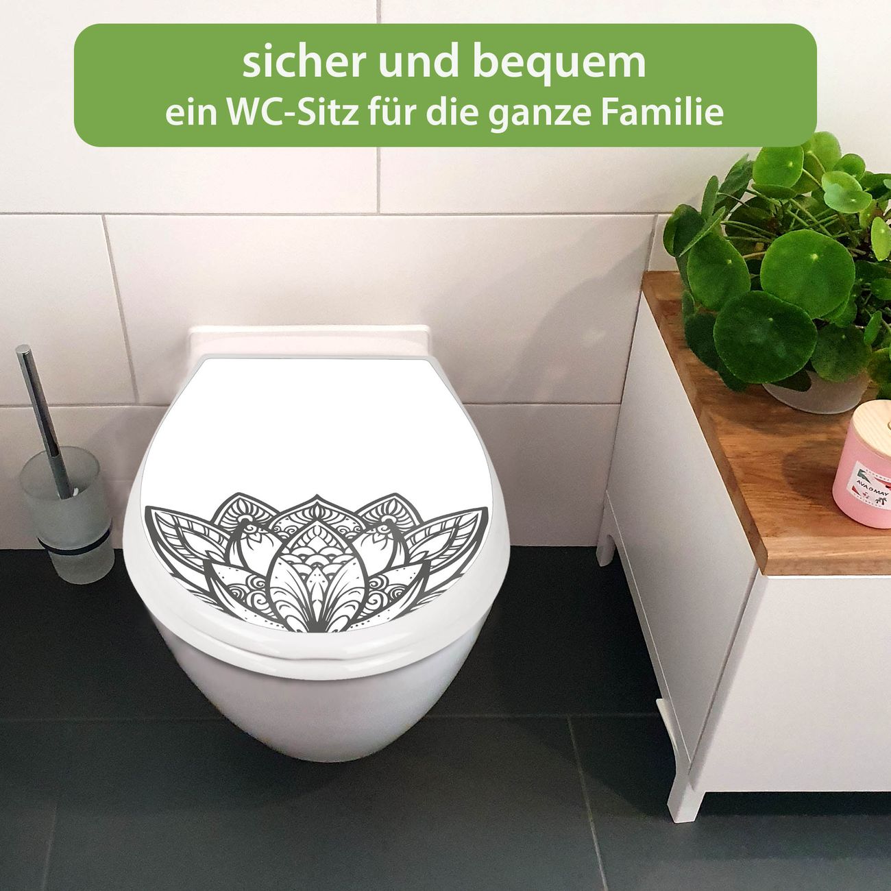 FUNKTION:Mit dem banjado Familien WC Sitz mit Absenkautomatik und dem Motiv Motiv Lotusblüte 8 verbinden Sie Design mit Funktionalität. Sie erhalten den Toilettendeckel in bewährt guter Qualität mit Montagematerial passend auf alle Euro-WC-Becken. Die Gesamtgröße beträgt 37,1cm x 44,9cm x 5cm, die Grundfarbe ist weiß.</p> DESIGN:Der Klodeckel in weiß mit Motiv Motiv Lotusblüte 8 hat eine ansprechende Optik, eine besondere Form und ist sehr stabil. Das Motiv besteht aus einer farbbrillianten Motivfolie, die durch ein Schutzlaminat zusätzlich vor Kratzern schützt. Der integrierte Kindersitz fügt sich harmonisch ein. DETAILS:Der Toilettensitz mit Soft Close besteht aus hochwertigem Polypropylen, ist geruchlos, ungiftig und kann mit handelsüblicher Seife gereinigt werden. Die Montage kann von von oben oder von unten erfolgen und ist kinderleicht. NUTZEN:Mit Hilfe der detaillierten Aufbauanleitung ermöglichen wir eine schnelle und unkomplizierte Montage. Die banjado Klobrille ist universell geeignet für alle Euro-WC-Schüsseln. Der Kindersitz kann unkompliziert entfernt werden. BANJADO:Ihr WC-Deckel wird in Sachsen in einer kleinen Manufaktur von Hand veredelt. Die Motivfolie ist lösungsmittelfrei und schutzlaminiert für einen langen Halt. Wir wünschen viel Freude bei der Auswahl eines schönen Motivs.