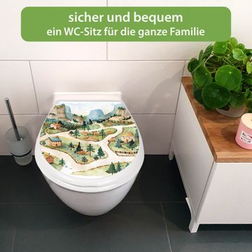 FUNKTION:Mit dem banjado Familien WC Sitz mit Absenkautomatik und dem Motiv Motiv Märchendorf 3 verbinden Sie Design mit Funktionalität. Sie erhalten den Toilettendeckel in bewährt guter Qualität mit Montagematerial passend auf alle Euro-WC-Becken. Die Gesamtgröße beträgt 37,1cm x 44,9cm x 5cm, die Grundfarbe ist weiß.</p> DESIGN:Der Klodeckel in weiß mit Motiv Motiv Märchendorf 3 hat eine ansprechende Optik, eine besondere Form und ist sehr stabil. Das Motiv besteht aus einer farbbrillianten Motivfolie, die durch ein Schutzlaminat zusätzlich vor Kratzern schützt. Der integrierte Kindersitz fügt sich harmonisch ein. DETAILS:Der Toilettensitz mit Soft Close besteht aus hochwertigem Polypropylen, ist geruchlos, ungiftig und kann mit handelsüblicher Seife gereinigt werden. Die Montage kann von von oben oder von unten erfolgen und ist kinderleicht. NUTZEN:Mit Hilfe der detaillierten Aufbauanleitung ermöglichen wir eine schnelle und unkomplizierte Montage. Die banjado Klobrille ist universell geeignet für alle Euro-WC-Schüsseln. Der Kindersitz kann unkompliziert entfernt werden. BANJADO:Ihr WC-Deckel wird in Sachsen in einer kleinen Manufaktur von Hand veredelt. Die Motivfolie ist lösungsmittelfrei und schutzlaminiert für einen langen Halt. Wir wünschen viel Freude bei der Auswahl eines schönen Motivs.