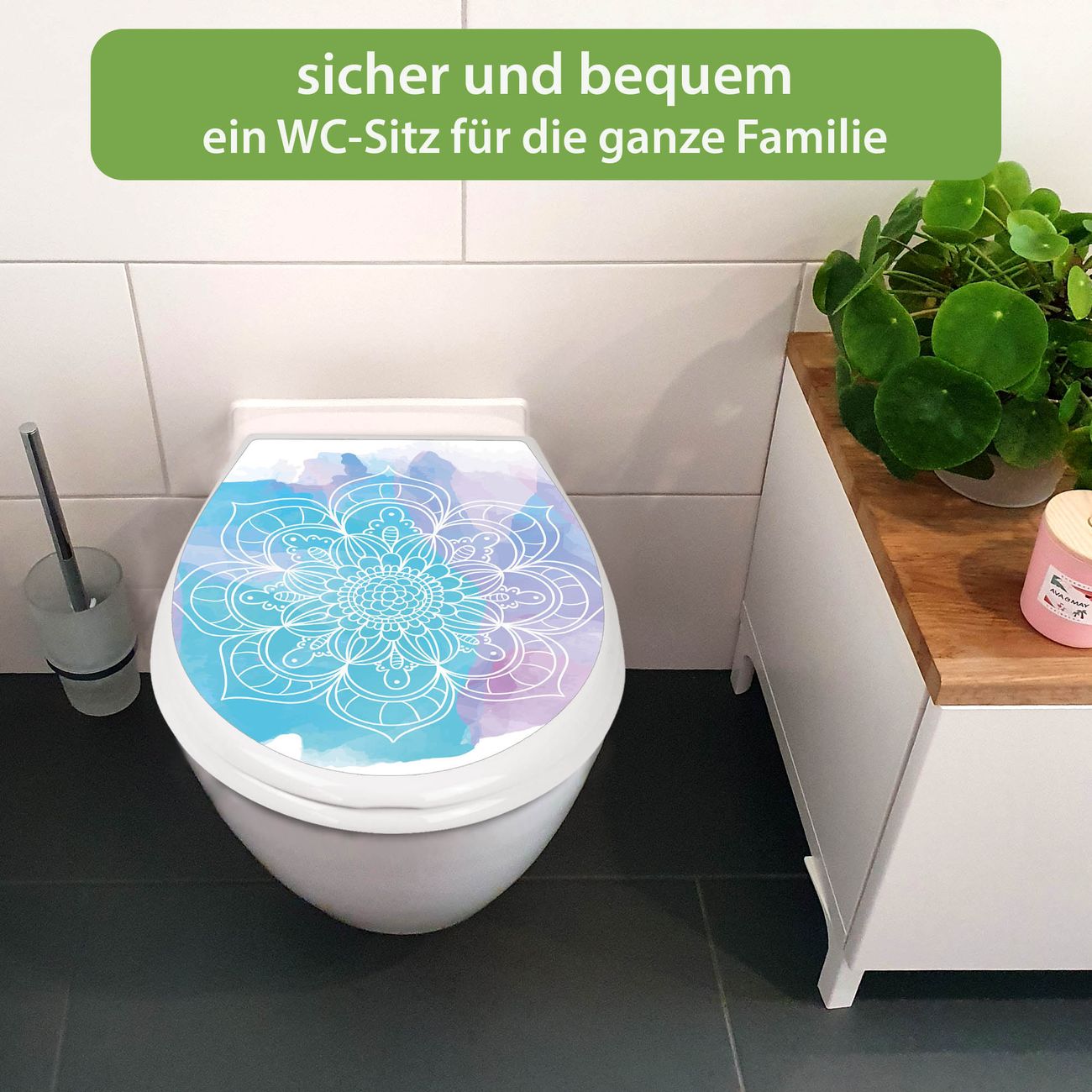 FUNKTION:Mit dem banjado Familien WC Sitz mit Absenkautomatik und dem Motiv Motiv Mandala Tranquility verbinden Sie Design mit Funktionalität. Sie erhalten den Toilettendeckel in bewährt guter Qualität mit Montagematerial passend auf alle Euro-WC-Becken. Die Gesamtgröße beträgt 37,1cm x 44,9cm x 5cm, die Grundfarbe ist weiß.</p> DESIGN:Der Klodeckel in weiß mit Motiv Motiv Mandala Tranquility hat eine ansprechende Optik, eine besondere Form und ist sehr stabil. Das Motiv besteht aus einer farbbrillianten Motivfolie, die durch ein Schutzlaminat zusätzlich vor Kratzern schützt. Der integrierte Kindersitz fügt sich harmonisch ein. DETAILS:Der Toilettensitz mit Soft Close besteht aus hochwertigem Polypropylen, ist geruchlos, ungiftig und kann mit handelsüblicher Seife gereinigt werden. Die Montage kann von von oben oder von unten erfolgen und ist kinderleicht. NUTZEN:Mit Hilfe der detaillierten Aufbauanleitung ermöglichen wir eine schnelle und unkomplizierte Montage. Die banjado Klobrille ist universell geeignet für alle Euro-WC-Schüsseln. Der Kindersitz kann unkompliziert entfernt werden. BANJADO:Ihr WC-Deckel wird in Sachsen in einer kleinen Manufaktur von Hand veredelt. Die Motivfolie ist lösungsmittelfrei und schutzlaminiert für einen langen Halt. Wir wünschen viel Freude bei der Auswahl eines schönen Motivs.