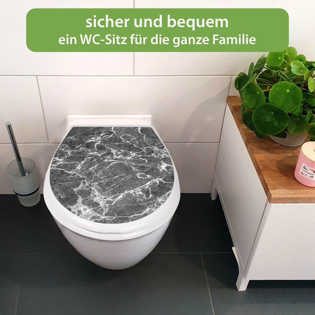 FUNKTION:Mit dem banjado Familien WC Sitz mit Absenkautomatik und dem Motiv Motiv Marmorstein verbinden Sie Design mit Funktionalität. Sie erhalten den Toilettendeckel in bewährt guter Qualität mit Montagematerial passend auf alle Euro-WC-Becken. Die Gesamtgröße beträgt 37,1cm x 44,9cm x 5cm, die Grundfarbe ist weiß.</p> DESIGN:Der Klodeckel in weiß mit Motiv Motiv Marmorstein hat eine ansprechende Optik, eine besondere Form und ist sehr stabil. Das Motiv besteht aus einer farbbrillianten Motivfolie, die durch ein Schutzlaminat zusätzlich vor Kratzern schützt. Der integrierte Kindersitz fügt sich harmonisch ein. DETAILS:Der Toilettensitz mit Soft Close besteht aus hochwertigem Polypropylen, ist geruchlos, ungiftig und kann mit handelsüblicher Seife gereinigt werden. Die Montage kann von von oben oder von unten erfolgen und ist kinderleicht. NUTZEN:Mit Hilfe der detaillierten Aufbauanleitung ermöglichen wir eine schnelle und unkomplizierte Montage. Die banjado Klobrille ist universell geeignet für alle Euro-WC-Schüsseln. Der Kindersitz kann unkompliziert entfernt werden. BANJADO:Ihr WC-Deckel wird in Sachsen in einer kleinen Manufaktur von Hand veredelt. Die Motivfolie ist lösungsmittelfrei und schutzlaminiert für einen langen Halt. Wir wünschen viel Freude bei der Auswahl eines schönen Motivs.