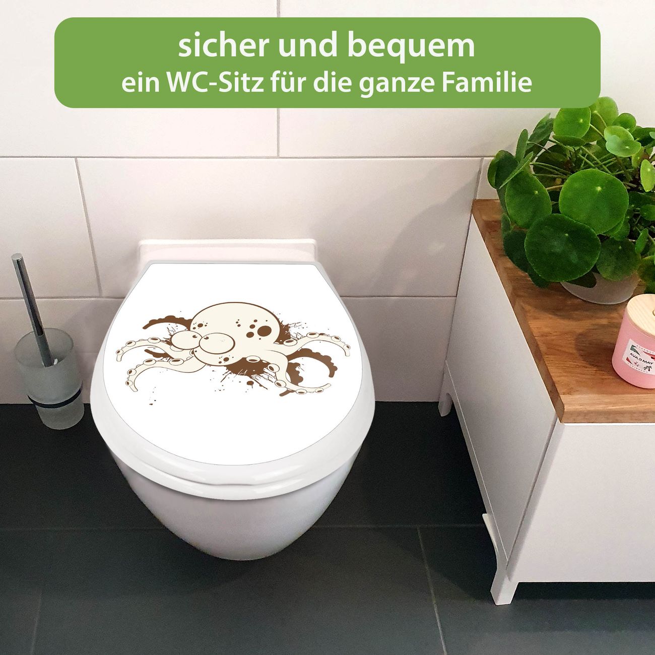 FUNKTION:Mit dem banjado Familien WC Sitz mit Absenkautomatik und dem Motiv Motiv Oktopus Comic 2 verbinden Sie Design mit Funktionalität. Sie erhalten den Toilettendeckel in bewährt guter Qualität mit Montagematerial passend auf alle Euro-WC-Becken. Die Gesamtgröße beträgt 37,1cm x 44,9cm x 5cm, die Grundfarbe ist weiß.</p> DESIGN:Der Klodeckel in weiß mit Motiv Motiv Oktopus Comic 2 hat eine ansprechende Optik, eine besondere Form und ist sehr stabil. Das Motiv besteht aus einer farbbrillianten Motivfolie, die durch ein Schutzlaminat zusätzlich vor Kratzern schützt. Der integrierte Kindersitz fügt sich harmonisch ein. DETAILS:Der Toilettensitz mit Soft Close besteht aus hochwertigem Polypropylen, ist geruchlos, ungiftig und kann mit handelsüblicher Seife gereinigt werden. Die Montage kann von von oben oder von unten erfolgen und ist kinderleicht. NUTZEN:Mit Hilfe der detaillierten Aufbauanleitung ermöglichen wir eine schnelle und unkomplizierte Montage. Die banjado Klobrille ist universell geeignet für alle Euro-WC-Schüsseln. Der Kindersitz kann unkompliziert entfernt werden. BANJADO:Ihr WC-Deckel wird in Sachsen in einer kleinen Manufaktur von Hand veredelt. Die Motivfolie ist lösungsmittelfrei und schutzlaminiert für einen langen Halt. Wir wünschen viel Freude bei der Auswahl eines schönen Motivs.