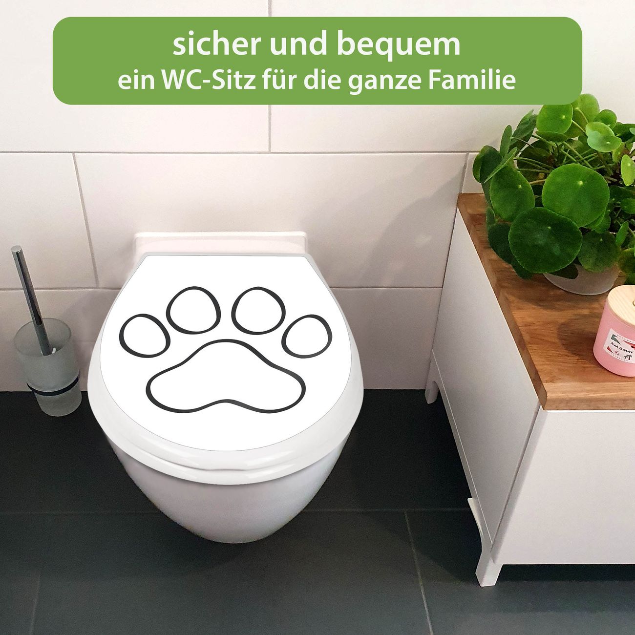 FUNKTION:Mit dem banjado Familien WC Sitz mit Absenkautomatik und dem Motiv Motiv Pfote 2 verbinden Sie Design mit Funktionalität. Sie erhalten den Toilettendeckel in bewährt guter Qualität mit Montagematerial passend auf alle Euro-WC-Becken. Die Gesamtgröße beträgt 37,1cm x 44,9cm x 5cm, die Grundfarbe ist weiß.</p> DESIGN:Der Klodeckel in weiß mit Motiv Motiv Pfote 2 hat eine ansprechende Optik, eine besondere Form und ist sehr stabil. Das Motiv besteht aus einer farbbrillianten Motivfolie, die durch ein Schutzlaminat zusätzlich vor Kratzern schützt. Der integrierte Kindersitz fügt sich harmonisch ein. DETAILS:Der Toilettensitz mit Soft Close besteht aus hochwertigem Polypropylen, ist geruchlos, ungiftig und kann mit handelsüblicher Seife gereinigt werden. Die Montage kann von von oben oder von unten erfolgen und ist kinderleicht. NUTZEN:Mit Hilfe der detaillierten Aufbauanleitung ermöglichen wir eine schnelle und unkomplizierte Montage. Die banjado Klobrille ist universell geeignet für alle Euro-WC-Schüsseln. Der Kindersitz kann unkompliziert entfernt werden. BANJADO:Ihr WC-Deckel wird in Sachsen in einer kleinen Manufaktur von Hand veredelt. Die Motivfolie ist lösungsmittelfrei und schutzlaminiert für einen langen Halt. Wir wünschen viel Freude bei der Auswahl eines schönen Motivs.