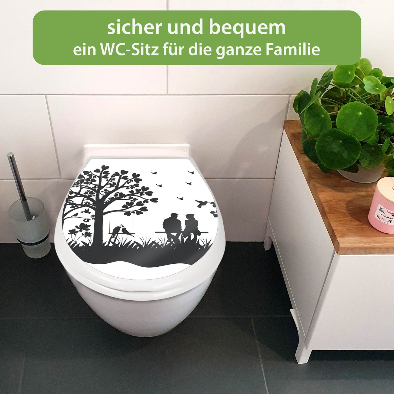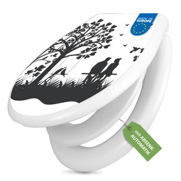 FUNKTION:Mit dem banjado Familien WC Sitz mit Absenkautomatik und dem Motiv Motiv Romantische Silhouette im Park verbinden Sie Design mit Funktionalität. Sie erhalten den Toilettendeckel in bewährt guter Qualität mit Montagematerial passend auf alle Euro-WC-Becken. Die Gesamtgröße beträgt 37,1cm x 44,9cm x 5cm, die Grundfarbe ist weiß.</p> DESIGN:Der Klodeckel in weiß mit Motiv Motiv Romantische Silhouette im Park hat eine ansprechende Optik, eine besondere Form und ist sehr stabil. Das Motiv besteht aus einer farbbrillianten Motivfolie, die durch ein Schutzlaminat zusätzlich vor Kratzern schützt. Der integrierte Kindersitz fügt sich harmonisch ein. DETAILS:Der Toilettensitz mit Soft Close besteht aus hochwertigem Polypropylen, ist geruchlos, ungiftig und kann mit handelsüblicher Seife gereinigt werden. Die Montage kann von von oben oder von unten erfolgen und ist kinderleicht. NUTZEN:Mit Hilfe der detaillierten Aufbauanleitung ermöglichen wir eine schnelle und unkomplizierte Montage. Die banjado Klobrille ist universell geeignet für alle Euro-WC-Schüsseln. Der Kindersitz kann unkompliziert entfernt werden. BANJADO:Ihr WC-Deckel wird in Sachsen in einer kleinen Manufaktur von Hand veredelt. Die Motivfolie ist lösungsmittelfrei und schutzlaminiert für einen langen Halt. Wir wünschen viel Freude bei der Auswahl eines schönen Motivs.