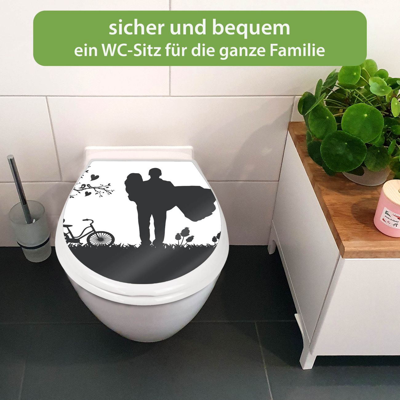 FUNKTION:Mit dem banjado Familien WC Sitz mit Absenkautomatik und dem Motiv Motiv Romantische Silhouette verbinden Sie Design mit Funktionalität. Sie erhalten den Toilettendeckel in bewährt guter Qualität mit Montagematerial passend auf alle Euro-WC-Becken. Die Gesamtgröße beträgt 37,1cm x 44,9cm x 5cm, die Grundfarbe ist weiß.</p> DESIGN:Der Klodeckel in weiß mit Motiv Motiv Romantische Silhouette hat eine ansprechende Optik, eine besondere Form und ist sehr stabil. Das Motiv besteht aus einer farbbrillianten Motivfolie, die durch ein Schutzlaminat zusätzlich vor Kratzern schützt. Der integrierte Kindersitz fügt sich harmonisch ein. DETAILS:Der Toilettensitz mit Soft Close besteht aus hochwertigem Polypropylen, ist geruchlos, ungiftig und kann mit handelsüblicher Seife gereinigt werden. Die Montage kann von von oben oder von unten erfolgen und ist kinderleicht. NUTZEN:Mit Hilfe der detaillierten Aufbauanleitung ermöglichen wir eine schnelle und unkomplizierte Montage. Die banjado Klobrille ist universell geeignet für alle Euro-WC-Schüsseln. Der Kindersitz kann unkompliziert entfernt werden. BANJADO:Ihr WC-Deckel wird in Sachsen in einer kleinen Manufaktur von Hand veredelt. Die Motivfolie ist lösungsmittelfrei und schutzlaminiert für einen langen Halt. Wir wünschen viel Freude bei der Auswahl eines schönen Motivs.