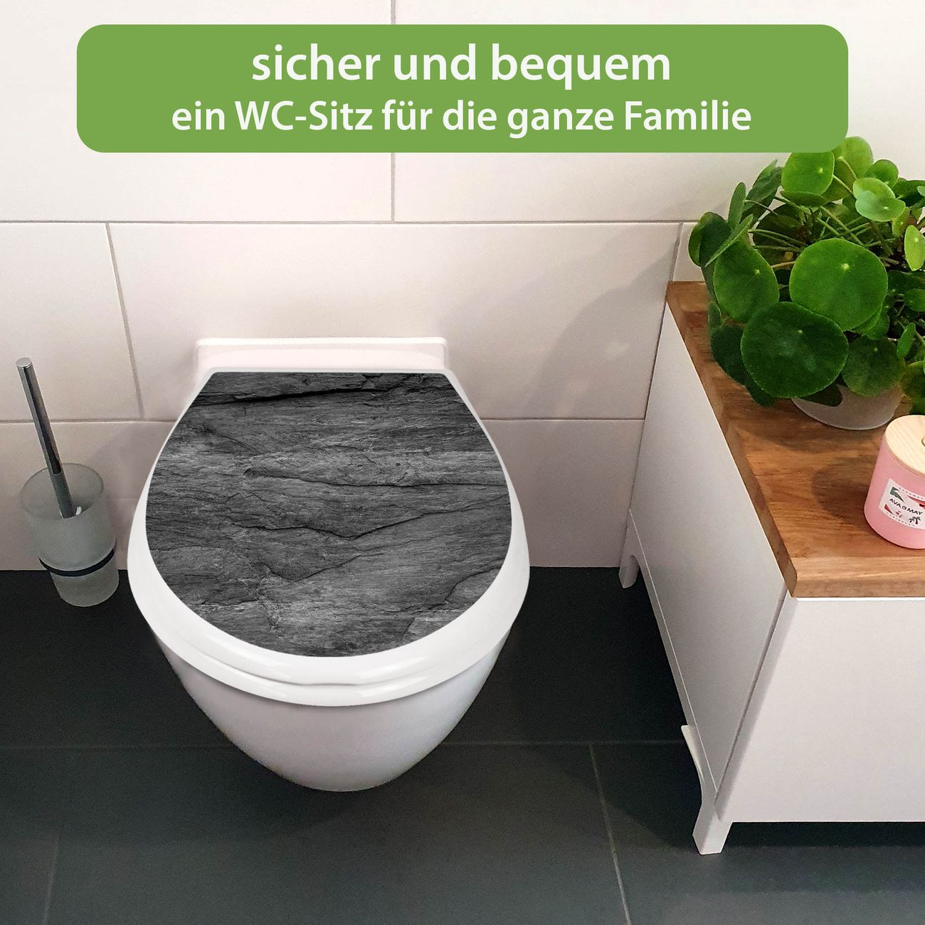 FUNKTION:Mit dem banjado Familien WC Sitz mit Absenkautomatik und dem Motiv Motiv Schiefer Platte 1 verbinden Sie Design mit Funktionalität. Sie erhalten den Toilettendeckel in bewährt guter Qualität mit Montagematerial passend auf alle Euro-WC-Becken. Die Gesamtgröße beträgt 37,1cm x 44,9cm x 5cm, die Grundfarbe ist weiß.</p> DESIGN:Der Klodeckel in weiß mit Motiv Motiv Schiefer Platte 1 hat eine ansprechende Optik, eine besondere Form und ist sehr stabil. Das Motiv besteht aus einer farbbrillianten Motivfolie, die durch ein Schutzlaminat zusätzlich vor Kratzern schützt. Der integrierte Kindersitz fügt sich harmonisch ein. DETAILS:Der Toilettensitz mit Soft Close besteht aus hochwertigem Polypropylen, ist geruchlos, ungiftig und kann mit handelsüblicher Seife gereinigt werden. Die Montage kann von von oben oder von unten erfolgen und ist kinderleicht. NUTZEN:Mit Hilfe der detaillierten Aufbauanleitung ermöglichen wir eine schnelle und unkomplizierte Montage. Die banjado Klobrille ist universell geeignet für alle Euro-WC-Schüsseln. Der Kindersitz kann unkompliziert entfernt werden. BANJADO:Ihr WC-Deckel wird in Sachsen in einer kleinen Manufaktur von Hand veredelt. Die Motivfolie ist lösungsmittelfrei und schutzlaminiert für einen langen Halt. Wir wünschen viel Freude bei der Auswahl eines schönen Motivs.