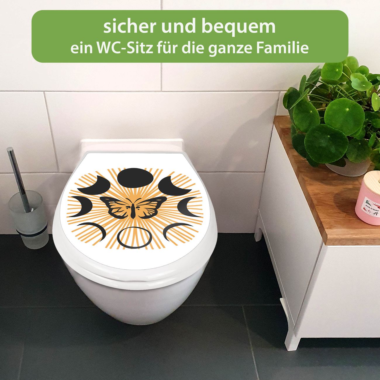 FUNKTION:Mit dem banjado Familien WC Sitz mit Absenkautomatik und dem Motiv Motiv Schmetterlingsmystik verbinden Sie Design mit Funktionalität. Sie erhalten den Toilettendeckel in bewährt guter Qualität mit Montagematerial passend auf alle Euro-WC-Becken. Die Gesamtgröße beträgt 37,1cm x 44,9cm x 5cm, die Grundfarbe ist weiß.</p> DESIGN:Der Klodeckel in weiß mit Motiv Motiv Schmetterlingsmystik hat eine ansprechende Optik, eine besondere Form und ist sehr stabil. Das Motiv besteht aus einer farbbrillianten Motivfolie, die durch ein Schutzlaminat zusätzlich vor Kratzern schützt. Der integrierte Kindersitz fügt sich harmonisch ein. DETAILS:Der Toilettensitz mit Soft Close besteht aus hochwertigem Polypropylen, ist geruchlos, ungiftig und kann mit handelsüblicher Seife gereinigt werden. Die Montage kann von von oben oder von unten erfolgen und ist kinderleicht. NUTZEN:Mit Hilfe der detaillierten Aufbauanleitung ermöglichen wir eine schnelle und unkomplizierte Montage. Die banjado Klobrille ist universell geeignet für alle Euro-WC-Schüsseln. Der Kindersitz kann unkompliziert entfernt werden. BANJADO:Ihr WC-Deckel wird in Sachsen in einer kleinen Manufaktur von Hand veredelt. Die Motivfolie ist lösungsmittelfrei und schutzlaminiert für einen langen Halt. Wir wünschen viel Freude bei der Auswahl eines schönen Motivs.