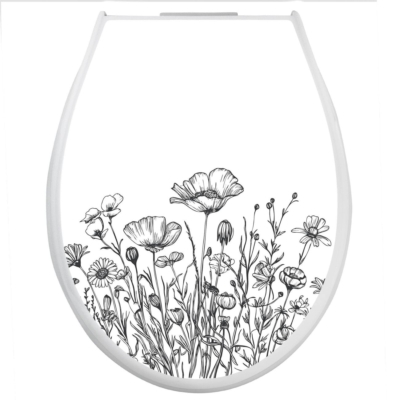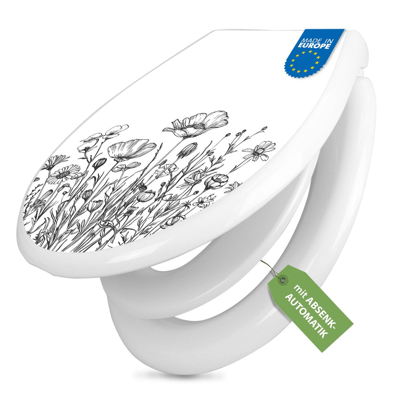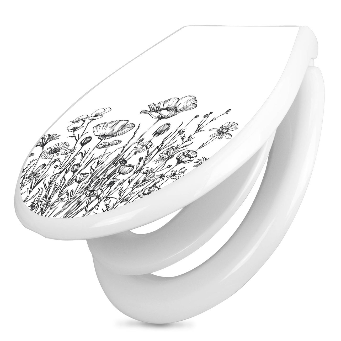 Toilettendeckel weiß mit Absenkautomatik Motiv Schwarz-Weiß Blumenzeichnung