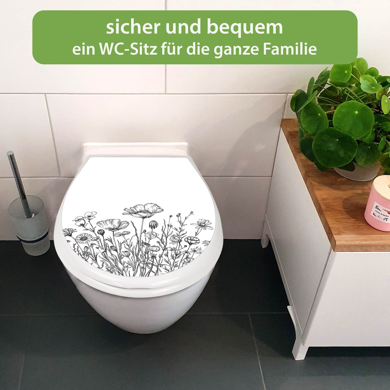 FUNKTION:Mit dem banjado Familien WC Sitz mit Absenkautomatik und dem Motiv Motiv Schwarz-Weiß Blumenzeichnung verbinden Sie Design mit Funktionalität. Sie erhalten den Toilettendeckel in bewährt guter Qualität mit Montagematerial passend auf alle Euro-WC-Becken. Die Gesamtgröße beträgt 37,1cm x 44,9cm x 5cm, die Grundfarbe ist weiß.</p> DESIGN:Der Klodeckel in weiß mit Motiv Motiv Schwarz-Weiß Blumenzeichnung hat eine ansprechende Optik, eine besondere Form und ist sehr stabil. Das Motiv besteht aus einer farbbrillianten Motivfolie, die durch ein Schutzlaminat zusätzlich vor Kratzern schützt. Der integrierte Kindersitz fügt sich harmonisch ein. DETAILS:Der Toilettensitz mit Soft Close besteht aus hochwertigem Polypropylen, ist geruchlos, ungiftig und kann mit handelsüblicher Seife gereinigt werden. Die Montage kann von von oben oder von unten erfolgen und ist kinderleicht. NUTZEN:Mit Hilfe der detaillierten Aufbauanleitung ermöglichen wir eine schnelle und unkomplizierte Montage. Die banjado Klobrille ist universell geeignet für alle Euro-WC-Schüsseln. Der Kindersitz kann unkompliziert entfernt werden. BANJADO:Ihr WC-Deckel wird in Sachsen in einer kleinen Manufaktur von Hand veredelt. Die Motivfolie ist lösungsmittelfrei und schutzlaminiert für einen langen Halt. Wir wünschen viel Freude bei der Auswahl eines schönen Motivs.