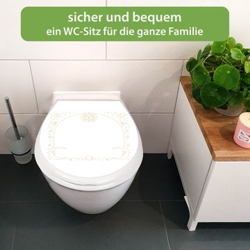 FUNKTION:Mit dem banjado Familien WC Sitz mit Absenkautomatik und dem Motiv Motiv Sonne und Mond Symbole verbinden Sie Design mit Funktionalität. Sie erhalten den Toilettendeckel in bewährt guter Qualität mit Montagematerial passend auf alle Euro-WC-Becken. Die Gesamtgröße beträgt 37,1cm x 44,9cm x 5cm, die Grundfarbe ist weiß.</p> DESIGN:Der Klodeckel in weiß mit Motiv Motiv Sonne und Mond Symbole hat eine ansprechende Optik, eine besondere Form und ist sehr stabil. Das Motiv besteht aus einer farbbrillianten Motivfolie, die durch ein Schutzlaminat zusätzlich vor Kratzern schützt. Der integrierte Kindersitz fügt sich harmonisch ein. DETAILS:Der Toilettensitz mit Soft Close besteht aus hochwertigem Polypropylen, ist geruchlos, ungiftig und kann mit handelsüblicher Seife gereinigt werden. Die Montage kann von von oben oder von unten erfolgen und ist kinderleicht. NUTZEN:Mit Hilfe der detaillierten Aufbauanleitung ermöglichen wir eine schnelle und unkomplizierte Montage. Die banjado Klobrille ist universell geeignet für alle Euro-WC-Schüsseln. Der Kindersitz kann unkompliziert entfernt werden. BANJADO:Ihr WC-Deckel wird in Sachsen in einer kleinen Manufaktur von Hand veredelt. Die Motivfolie ist lösungsmittelfrei und schutzlaminiert für einen langen Halt. Wir wünschen viel Freude bei der Auswahl eines schönen Motivs.