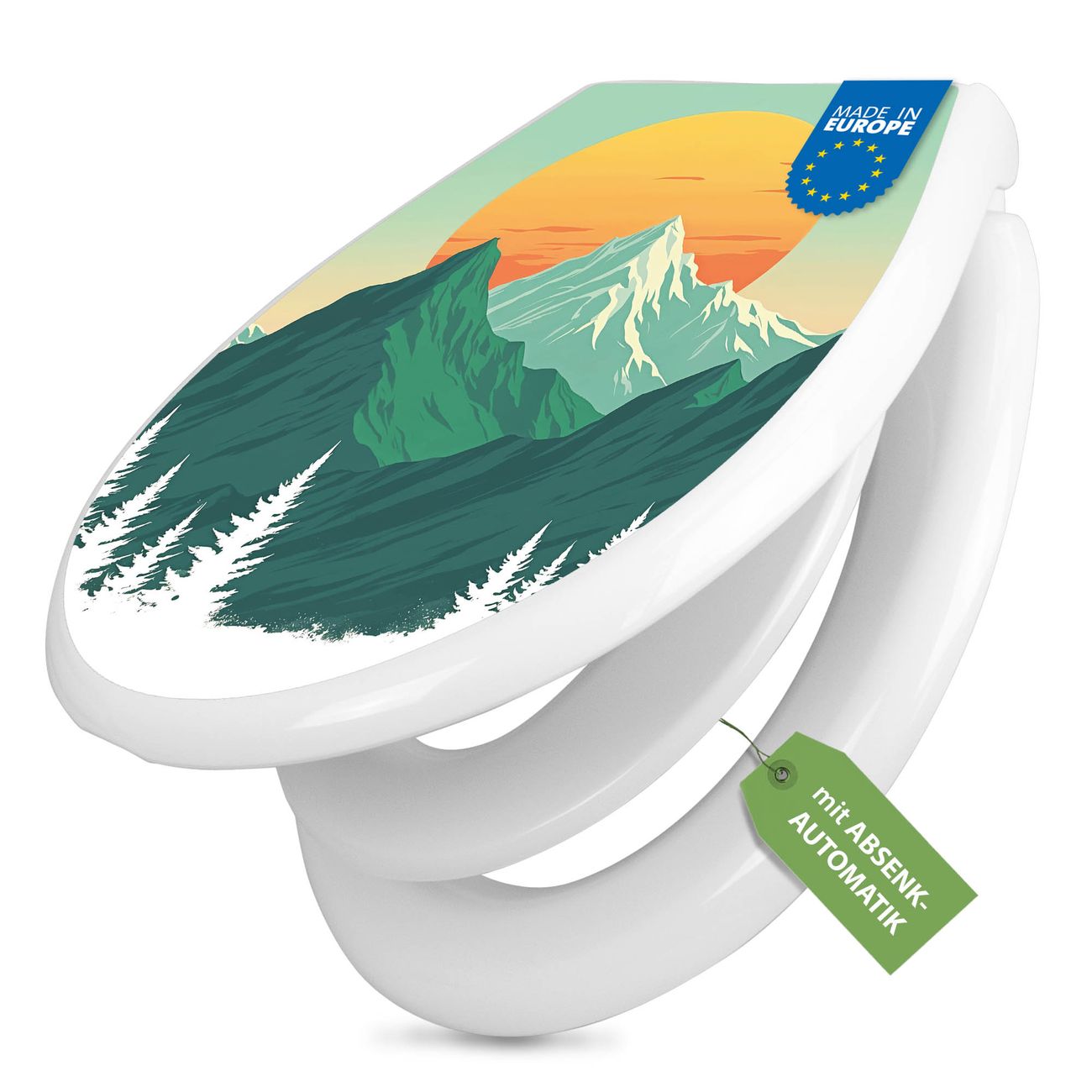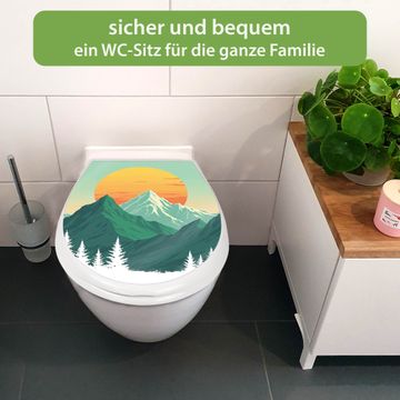 FUNKTION:Mit dem banjado Familien WC Sitz mit Absenkautomatik und dem Motiv Motiv Sonnenaufgang über den Bergen verbinden Sie Design mit Funktionalität. Sie erhalten den Toilettendeckel in bewährt guter Qualität mit Montagematerial passend auf alle Euro-WC-Becken. Die Gesamtgröße beträgt 37,1cm x 44,9cm x 5cm, die Grundfarbe ist weiß.</p> DESIGN:Der Klodeckel in weiß mit Motiv Motiv Sonnenaufgang über den Bergen hat eine ansprechende Optik, eine besondere Form und ist sehr stabil. Das Motiv besteht aus einer farbbrillianten Motivfolie, die durch ein Schutzlaminat zusätzlich vor Kratzern schützt. Der integrierte Kindersitz fügt sich harmonisch ein. DETAILS:Der Toilettensitz mit Soft Close besteht aus hochwertigem Polypropylen, ist geruchlos, ungiftig und kann mit handelsüblicher Seife gereinigt werden. Die Montage kann von von oben oder von unten erfolgen und ist kinderleicht. NUTZEN:Mit Hilfe der detaillierten Aufbauanleitung ermöglichen wir eine schnelle und unkomplizierte Montage. Die banjado Klobrille ist universell geeignet für alle Euro-WC-Schüsseln. Der Kindersitz kann unkompliziert entfernt werden. BANJADO:Ihr WC-Deckel wird in Sachsen in einer kleinen Manufaktur von Hand veredelt. Die Motivfolie ist lösungsmittelfrei und schutzlaminiert für einen langen Halt. Wir wünschen viel Freude bei der Auswahl eines schönen Motivs.