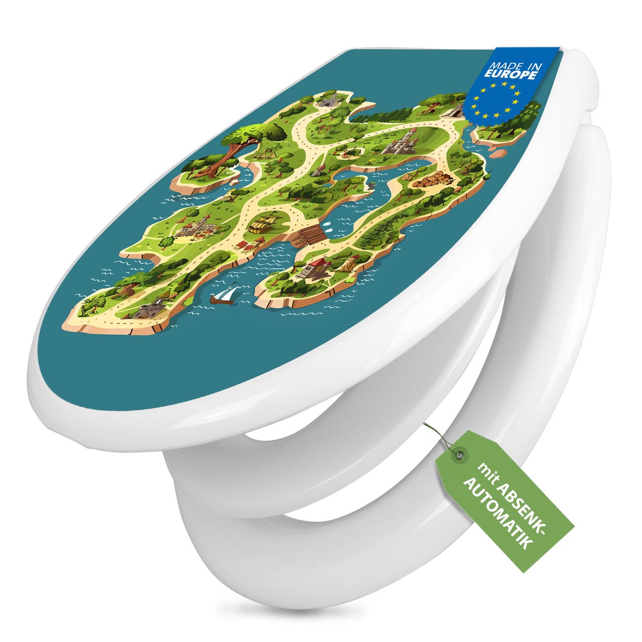 FUNKTION:Mit dem banjado Familien WC Sitz mit Absenkautomatik und dem Motiv Motiv Spielinsel verbinden Sie Design mit Funktionalität. Sie erhalten den Toilettendeckel in bewährt guter Qualität mit Montagematerial passend auf alle Euro-WC-Becken. Die Gesamtgröße beträgt 37,1cm x 44,9cm x 5cm, die Grundfarbe ist weiß.</p> DESIGN:Der Klodeckel in weiß mit Motiv Motiv Spielinsel hat eine ansprechende Optik, eine besondere Form und ist sehr stabil. Das Motiv besteht aus einer farbbrillianten Motivfolie, die durch ein Schutzlaminat zusätzlich vor Kratzern schützt. Der integrierte Kindersitz fügt sich harmonisch ein. DETAILS:Der Toilettensitz mit Soft Close besteht aus hochwertigem Polypropylen, ist geruchlos, ungiftig und kann mit handelsüblicher Seife gereinigt werden. Die Montage kann von von oben oder von unten erfolgen und ist kinderleicht. NUTZEN:Mit Hilfe der detaillierten Aufbauanleitung ermöglichen wir eine schnelle und unkomplizierte Montage. Die banjado Klobrille ist universell geeignet für alle Euro-WC-Schüsseln. Der Kindersitz kann unkompliziert entfernt werden. BANJADO:Ihr WC-Deckel wird in Sachsen in einer kleinen Manufaktur von Hand veredelt. Die Motivfolie ist lösungsmittelfrei und schutzlaminiert für einen langen Halt. Wir wünschen viel Freude bei der Auswahl eines schönen Motivs.