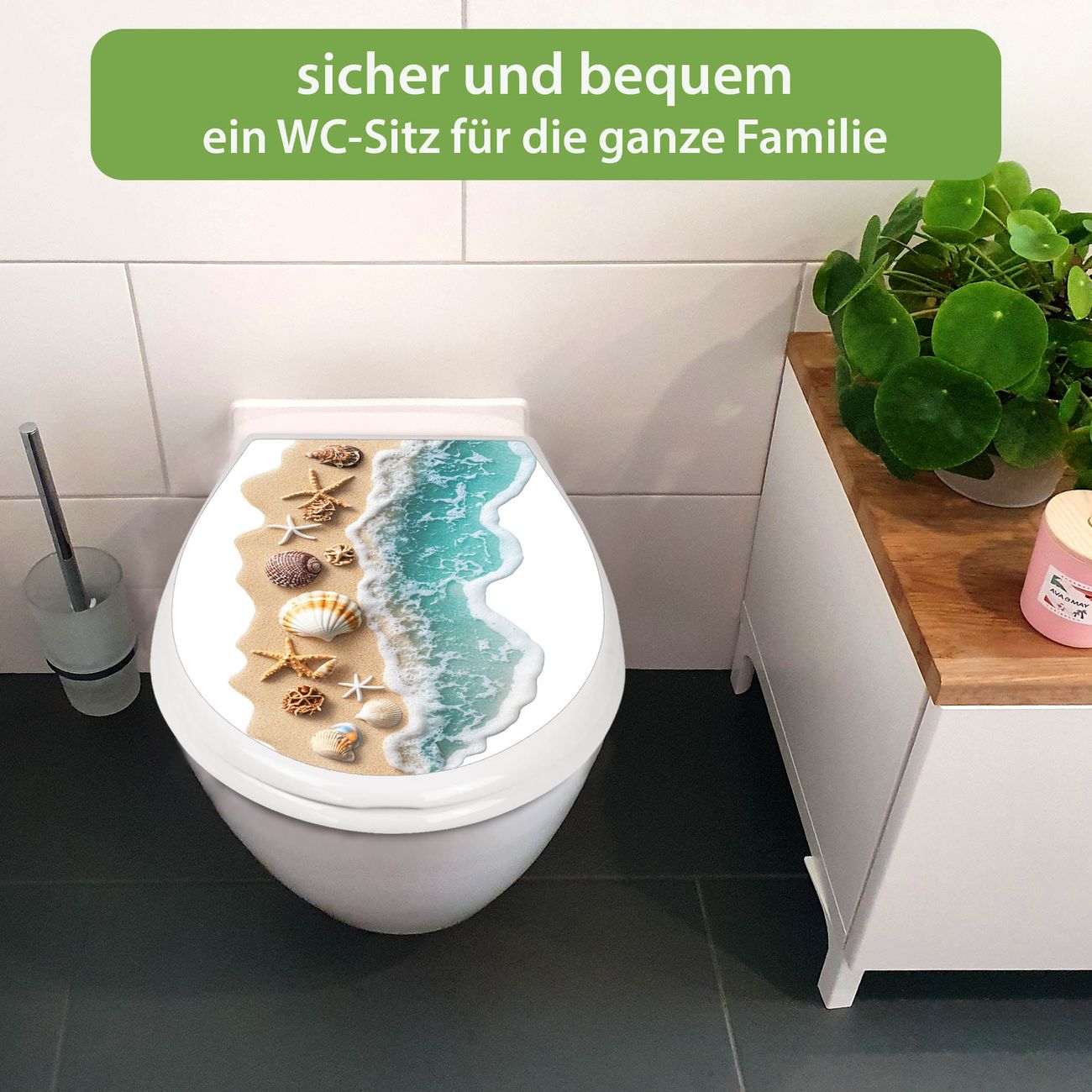FUNKTION:Mit dem banjado Familien WC Sitz mit Absenkautomatik und dem Motiv Motiv Strandparadies verbinden Sie Design mit Funktionalität. Sie erhalten den Toilettendeckel in bewährt guter Qualität mit Montagematerial passend auf alle Euro-WC-Becken. Die Gesamtgröße beträgt 37,1cm x 44,9cm x 5cm, die Grundfarbe ist weiß.</p> DESIGN:Der Klodeckel in weiß mit Motiv Motiv Strandparadies hat eine ansprechende Optik, eine besondere Form und ist sehr stabil. Das Motiv besteht aus einer farbbrillianten Motivfolie, die durch ein Schutzlaminat zusätzlich vor Kratzern schützt. Der integrierte Kindersitz fügt sich harmonisch ein. DETAILS:Der Toilettensitz mit Soft Close besteht aus hochwertigem Polypropylen, ist geruchlos, ungiftig und kann mit handelsüblicher Seife gereinigt werden. Die Montage kann von von oben oder von unten erfolgen und ist kinderleicht. NUTZEN:Mit Hilfe der detaillierten Aufbauanleitung ermöglichen wir eine schnelle und unkomplizierte Montage. Die banjado Klobrille ist universell geeignet für alle Euro-WC-Schüsseln. Der Kindersitz kann unkompliziert entfernt werden. BANJADO:Ihr WC-Deckel wird in Sachsen in einer kleinen Manufaktur von Hand veredelt. Die Motivfolie ist lösungsmittelfrei und schutzlaminiert für einen langen Halt. Wir wünschen viel Freude bei der Auswahl eines schönen Motivs.