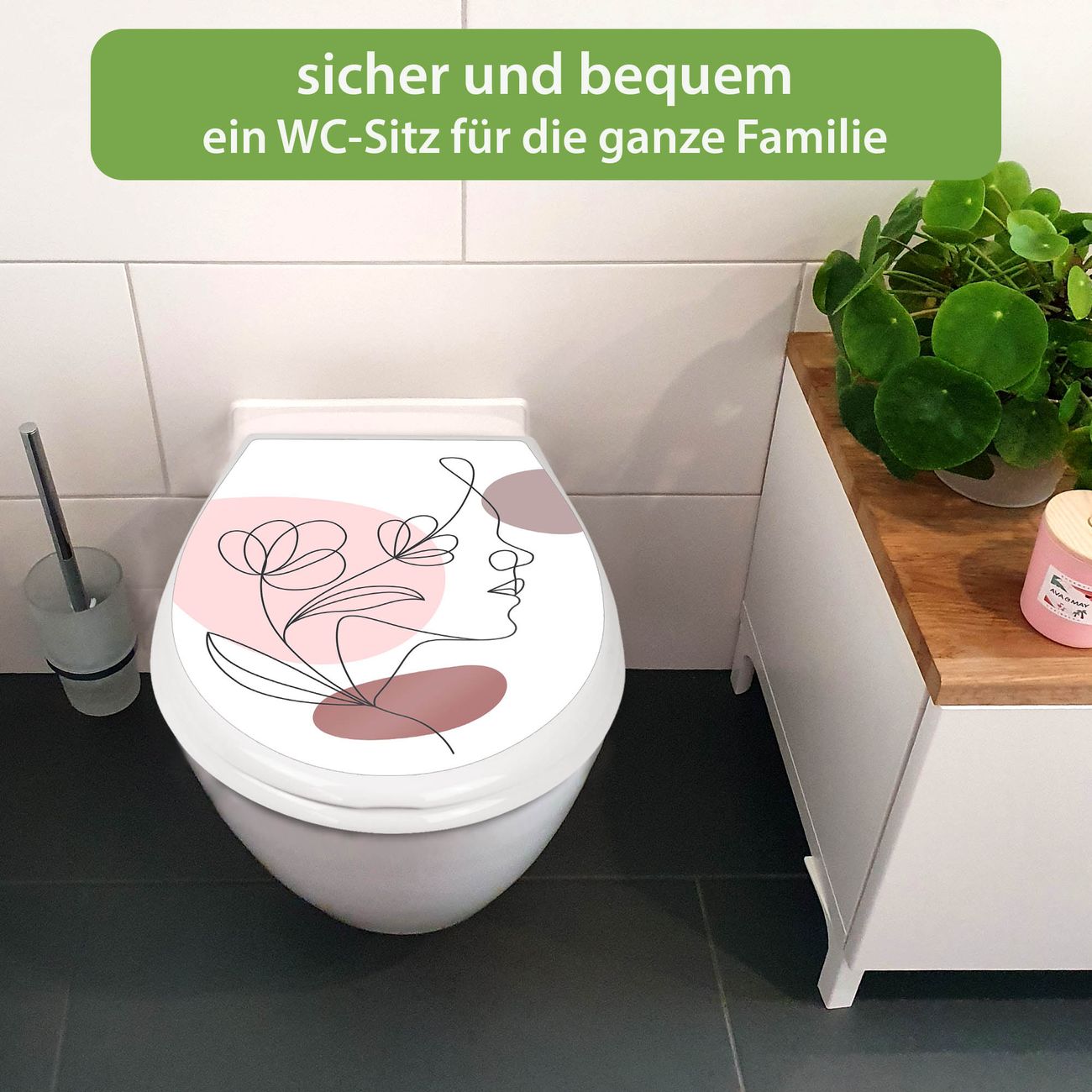 FUNKTION:Mit dem banjado Familien WC Sitz mit Absenkautomatik und dem Motiv Motiv Weibliche Lineart verbinden Sie Design mit Funktionalität. Sie erhalten den Toilettendeckel in bewährt guter Qualität mit Montagematerial passend auf alle Euro-WC-Becken. Die Gesamtgröße beträgt 37,1cm x 44,9cm x 5cm, die Grundfarbe ist weiß.</p> DESIGN:Der Klodeckel in weiß mit Motiv Motiv Weibliche Lineart hat eine ansprechende Optik, eine besondere Form und ist sehr stabil. Das Motiv besteht aus einer farbbrillianten Motivfolie, die durch ein Schutzlaminat zusätzlich vor Kratzern schützt. Der integrierte Kindersitz fügt sich harmonisch ein. DETAILS:Der Toilettensitz mit Soft Close besteht aus hochwertigem Polypropylen, ist geruchlos, ungiftig und kann mit handelsüblicher Seife gereinigt werden. Die Montage kann von von oben oder von unten erfolgen und ist kinderleicht. NUTZEN:Mit Hilfe der detaillierten Aufbauanleitung ermöglichen wir eine schnelle und unkomplizierte Montage. Die banjado Klobrille ist universell geeignet für alle Euro-WC-Schüsseln. Der Kindersitz kann unkompliziert entfernt werden. BANJADO:Ihr WC-Deckel wird in Sachsen in einer kleinen Manufaktur von Hand veredelt. Die Motivfolie ist lösungsmittelfrei und schutzlaminiert für einen langen Halt. Wir wünschen viel Freude bei der Auswahl eines schönen Motivs.