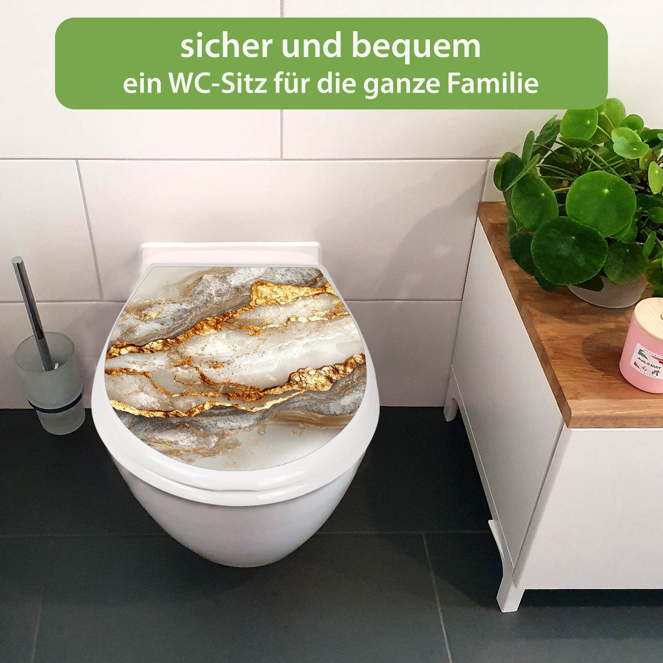 FUNKTION:Mit dem banjado Familien WC Sitz mit Absenkautomatik und dem Motiv Motiv Weißer Marmor mit Gold 2 verbinden Sie Design mit Funktionalität. Sie erhalten den Toilettendeckel in bewährt guter Qualität mit Montagematerial passend auf alle Euro-WC-Becken. Die Gesamtgröße beträgt 37,1cm x 44,9cm x 5cm, die Grundfarbe ist weiß.</p> DESIGN:Der Klodeckel in weiß mit Motiv Motiv Weißer Marmor mit Gold 2 hat eine ansprechende Optik, eine besondere Form und ist sehr stabil. Das Motiv besteht aus einer farbbrillianten Motivfolie, die durch ein Schutzlaminat zusätzlich vor Kratzern schützt. Der integrierte Kindersitz fügt sich harmonisch ein. DETAILS:Der Toilettensitz mit Soft Close besteht aus hochwertigem Polypropylen, ist geruchlos, ungiftig und kann mit handelsüblicher Seife gereinigt werden. Die Montage kann von von oben oder von unten erfolgen und ist kinderleicht. NUTZEN:Mit Hilfe der detaillierten Aufbauanleitung ermöglichen wir eine schnelle und unkomplizierte Montage. Die banjado Klobrille ist universell geeignet für alle Euro-WC-Schüsseln. Der Kindersitz kann unkompliziert entfernt werden. BANJADO:Ihr WC-Deckel wird in Sachsen in einer kleinen Manufaktur von Hand veredelt. Die Motivfolie ist lösungsmittelfrei und schutzlaminiert für einen langen Halt. Wir wünschen viel Freude bei der Auswahl eines schönen Motivs.