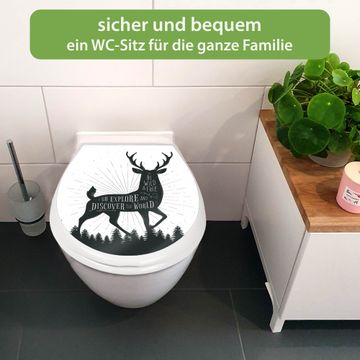 FUNKTION:Mit dem banjado Familien WC Sitz mit Absenkautomatik und dem Motiv Motiv Wilder Hirsch verbinden Sie Design mit Funktionalität. Sie erhalten den Toilettendeckel in bewährt guter Qualität mit Montagematerial passend auf alle Euro-WC-Becken. Die Gesamtgröße beträgt 37,1cm x 44,9cm x 5cm, die Grundfarbe ist weiß.</p> DESIGN:Der Klodeckel in weiß mit Motiv Motiv Wilder Hirsch hat eine ansprechende Optik, eine besondere Form und ist sehr stabil. Das Motiv besteht aus einer farbbrillianten Motivfolie, die durch ein Schutzlaminat zusätzlich vor Kratzern schützt. Der integrierte Kindersitz fügt sich harmonisch ein. DETAILS:Der Toilettensitz mit Soft Close besteht aus hochwertigem Polypropylen, ist geruchlos, ungiftig und kann mit handelsüblicher Seife gereinigt werden. Die Montage kann von von oben oder von unten erfolgen und ist kinderleicht. NUTZEN:Mit Hilfe der detaillierten Aufbauanleitung ermöglichen wir eine schnelle und unkomplizierte Montage. Die banjado Klobrille ist universell geeignet für alle Euro-WC-Schüsseln. Der Kindersitz kann unkompliziert entfernt werden. BANJADO:Ihr WC-Deckel wird in Sachsen in einer kleinen Manufaktur von Hand veredelt. Die Motivfolie ist lösungsmittelfrei und schutzlaminiert für einen langen Halt. Wir wünschen viel Freude bei der Auswahl eines schönen Motivs.