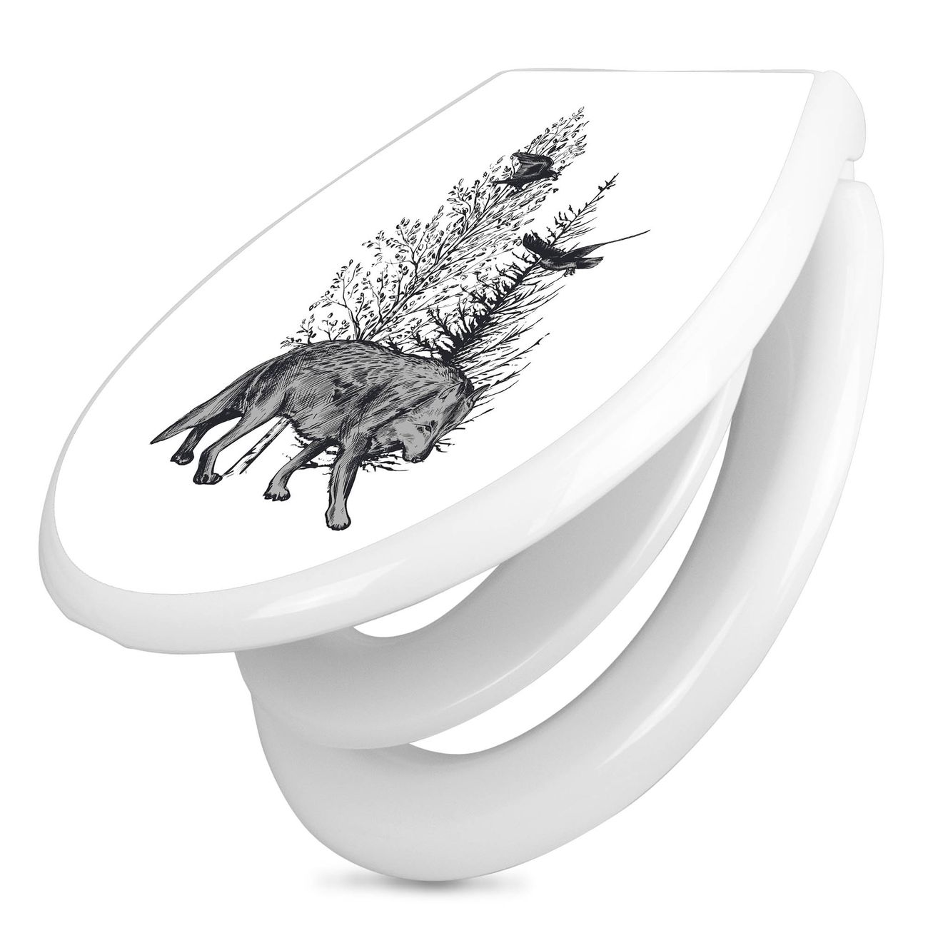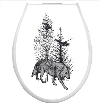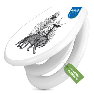 Toilettendeckel weiß mit Absenkautomatik Motiv Wolf in Schwarz-Weiß