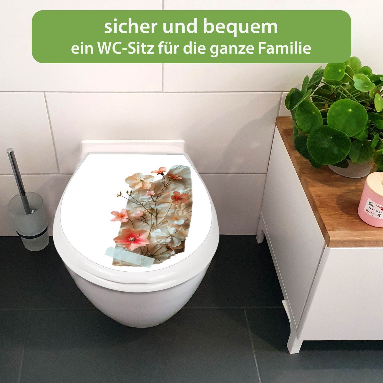 FUNKTION:Mit dem banjado Familien WC Sitz mit Absenkautomatik und dem Motiv Motiv Zarte Blütenkomposition Vintage verbinden Sie Design mit Funktionalität. Sie erhalten den Toilettendeckel in bewährt guter Qualität mit Montagematerial passend auf alle Euro-WC-Becken. Die Gesamtgröße beträgt 37,1cm x 44,9cm x 5cm, die Grundfarbe ist weiß.</p> DESIGN:Der Klodeckel in weiß mit Motiv Motiv Zarte Blütenkomposition Vintage hat eine ansprechende Optik, eine besondere Form und ist sehr stabil. Das Motiv besteht aus einer farbbrillianten Motivfolie, die durch ein Schutzlaminat zusätzlich vor Kratzern schützt. Der integrierte Kindersitz fügt sich harmonisch ein. DETAILS:Der Toilettensitz mit Soft Close besteht aus hochwertigem Polypropylen, ist geruchlos, ungiftig und kann mit handelsüblicher Seife gereinigt werden. Die Montage kann von von oben oder von unten erfolgen und ist kinderleicht. NUTZEN:Mit Hilfe der detaillierten Aufbauanleitung ermöglichen wir eine schnelle und unkomplizierte Montage. Die banjado Klobrille ist universell geeignet für alle Euro-WC-Schüsseln. Der Kindersitz kann unkompliziert entfernt werden. BANJADO:Ihr WC-Deckel wird in Sachsen in einer kleinen Manufaktur von Hand veredelt. Die Motivfolie ist lösungsmittelfrei und schutzlaminiert für einen langen Halt. Wir wünschen viel Freude bei der Auswahl eines schönen Motivs.