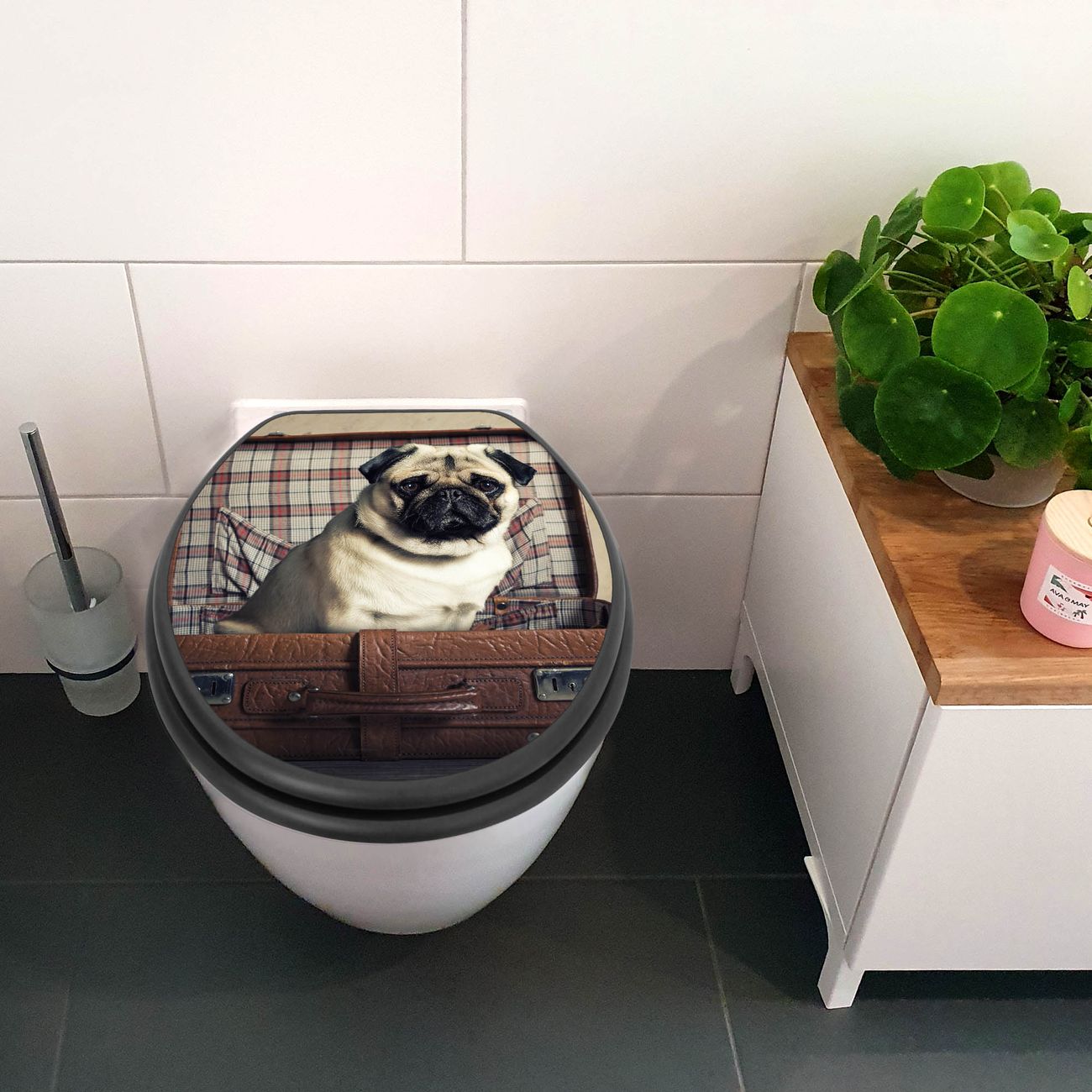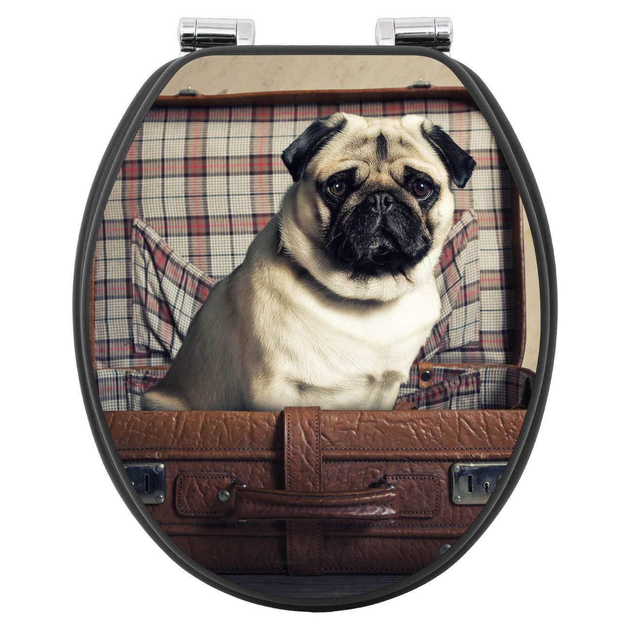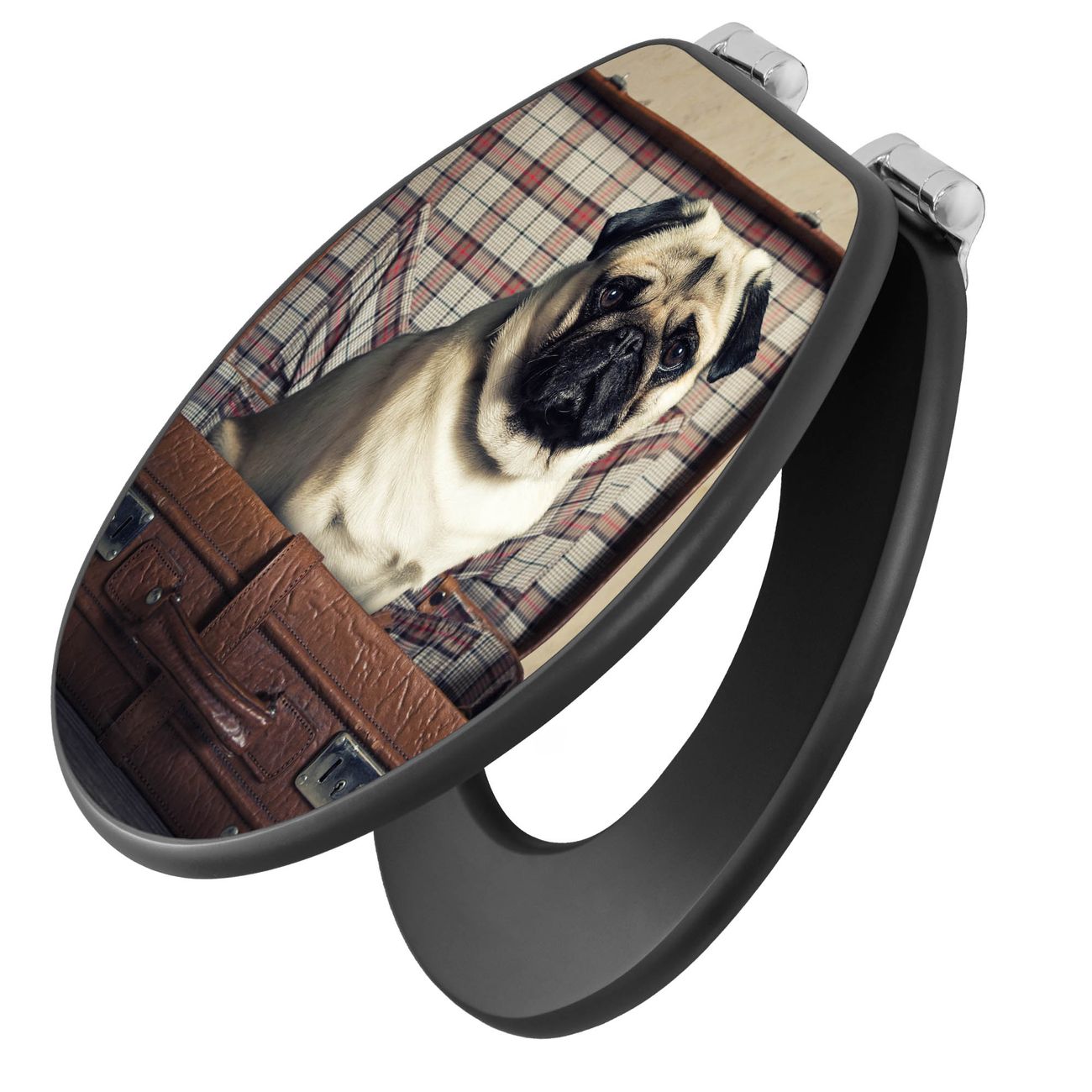 WC Sitz Anthrazit mit Absenkautomatik Motiv Mops im Koffer