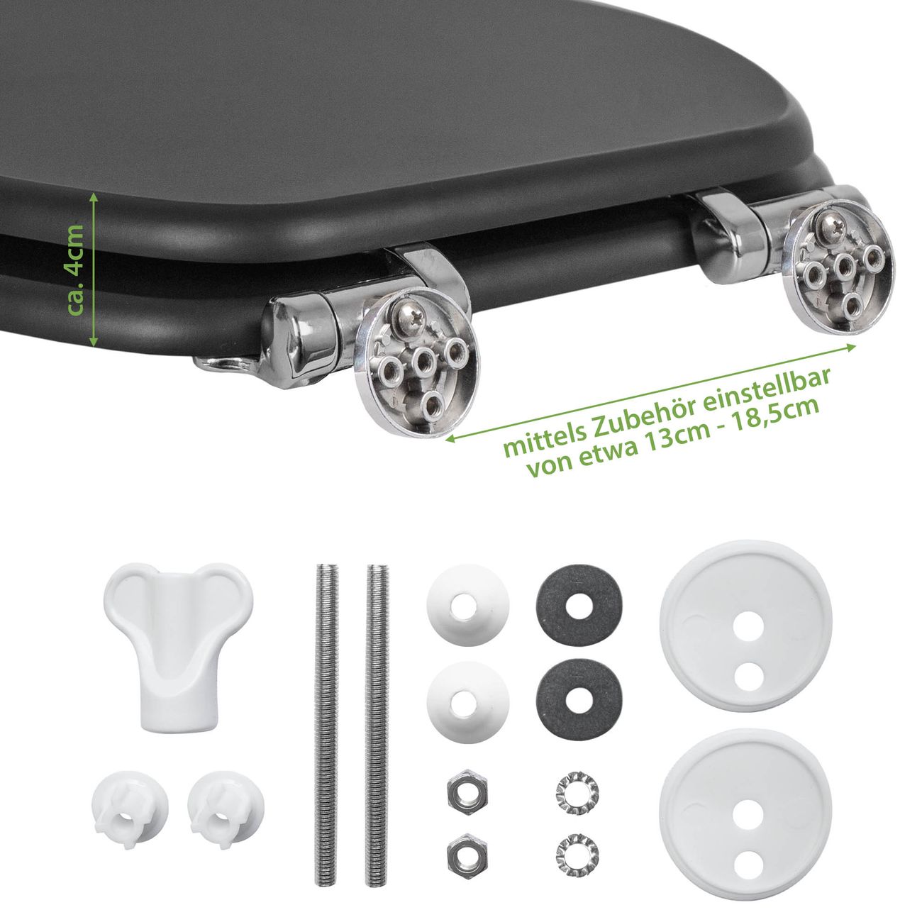 FUNKTION: Der banjado Holzkern WC-Sitz Anthrazit vereint höchsten Komfort, langlebige Qualität und modernes Design. DESIGN: Der WC-Sitz überzeugt durch sein stilvolles Anthrazit-Design, das Ihrem Badezimmer eine moderne Note verleiht. DETAILS: Der hochwertige MDF-Kern mit harter, porenglatter Oberfläche macht den WC-Sitz besonders bruchsicher und kratzfest. EINFACHE MONTAGE: Die unterseitige Befestigungstechnik sowie eine bebilderte Anleitung ermöglichen eine mühelose Installation. Mit dem banjado Holzkern WC-Sitz Anthrazit entscheiden Sie sich für ein robustes, langlebiges, komfortables und hygienisches Produkt.