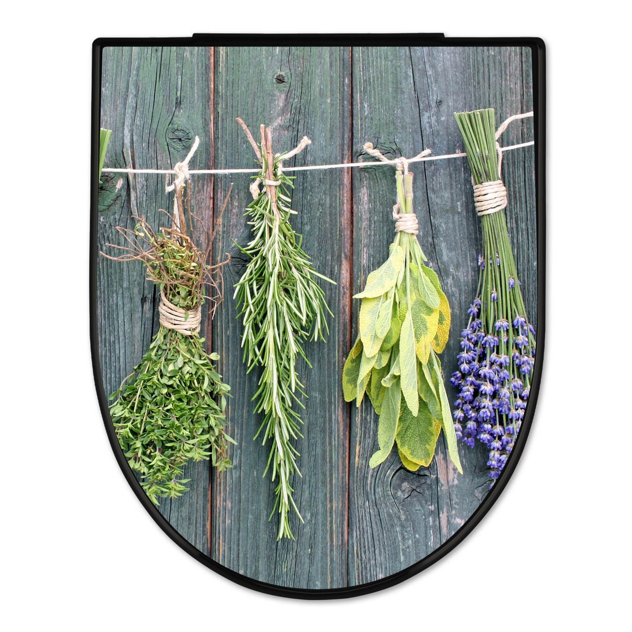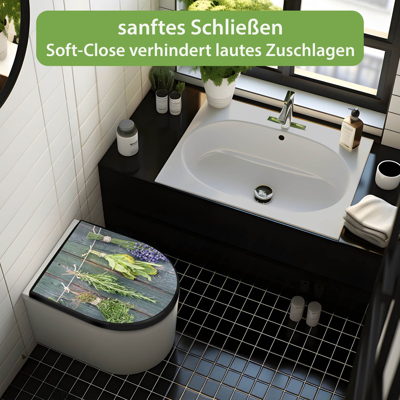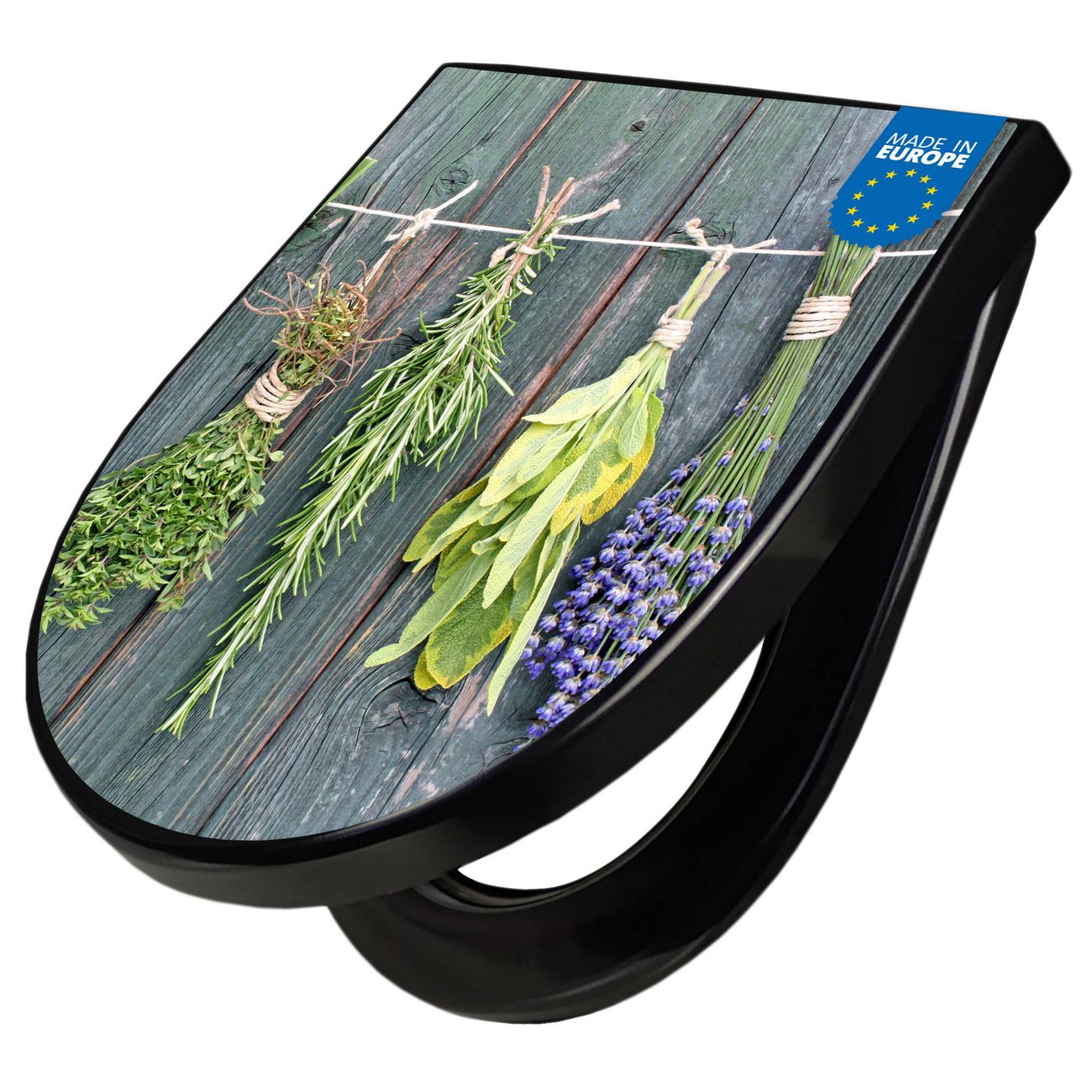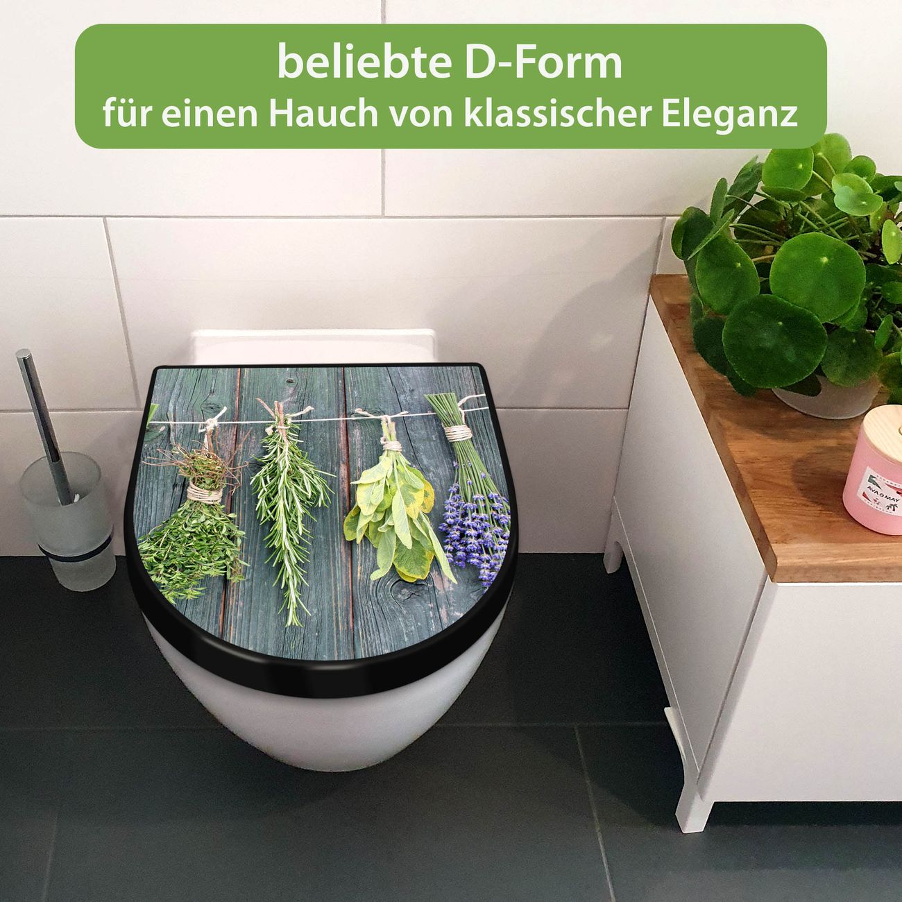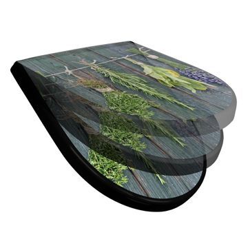 WC Sitz D-Form Schwarz mit Absenkautomatik Motiv Acht Kräuter