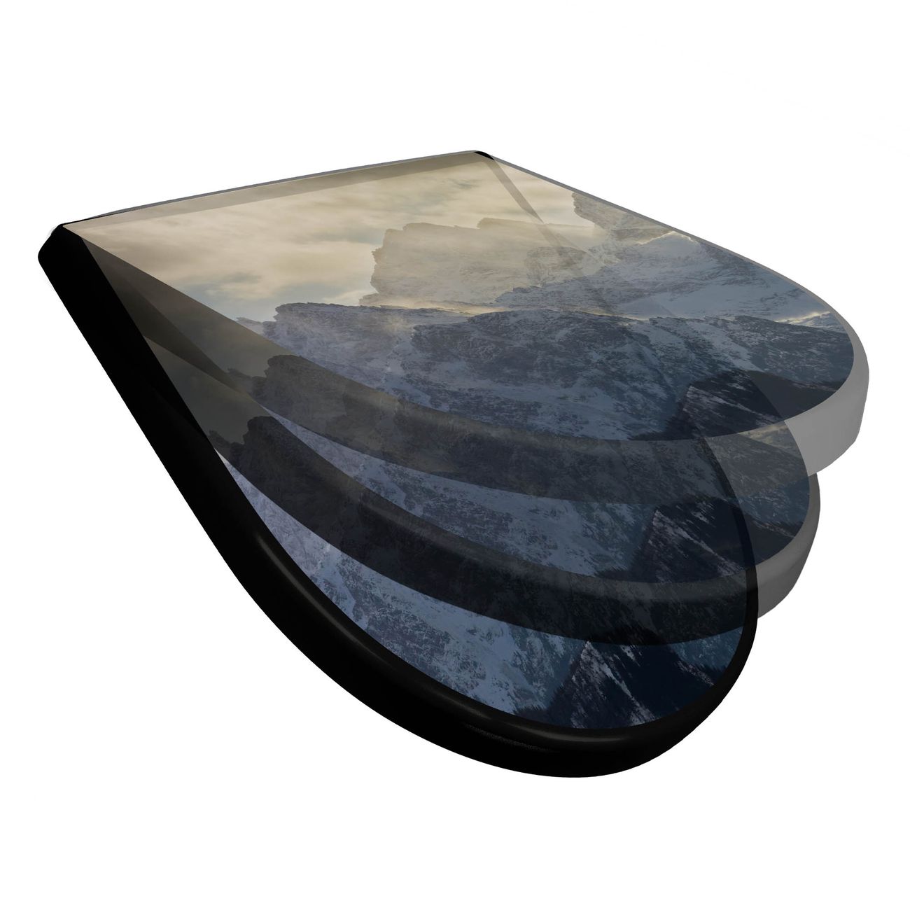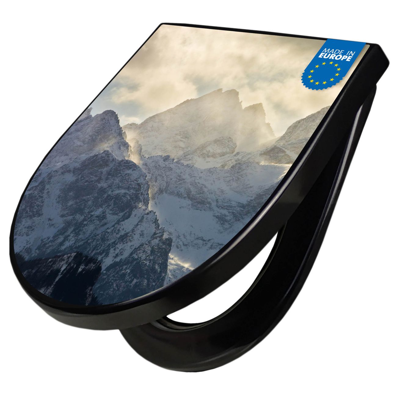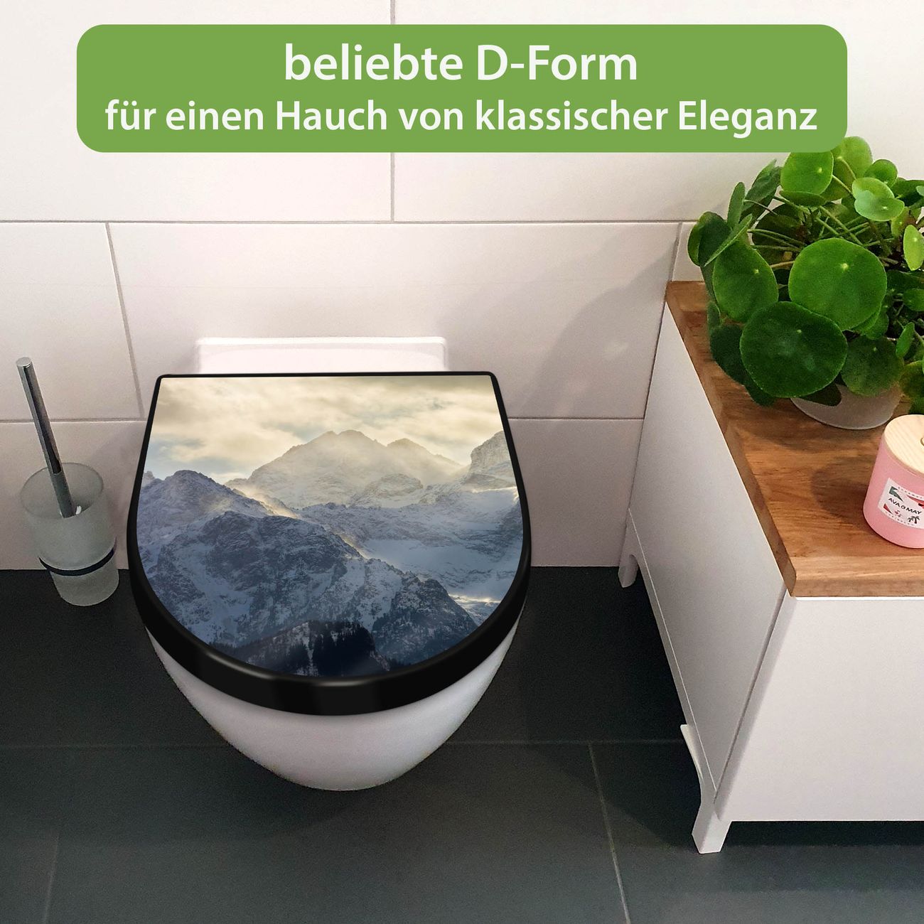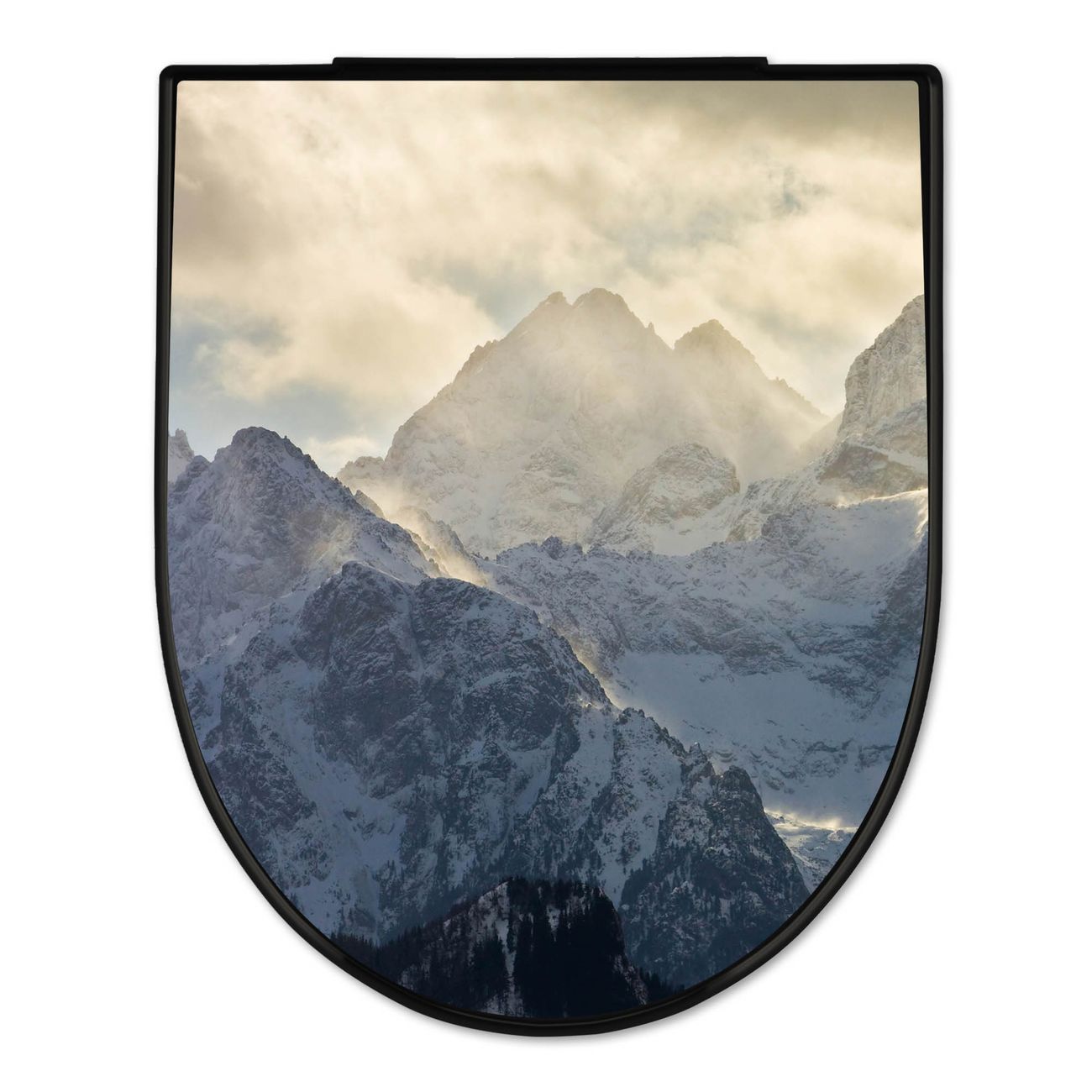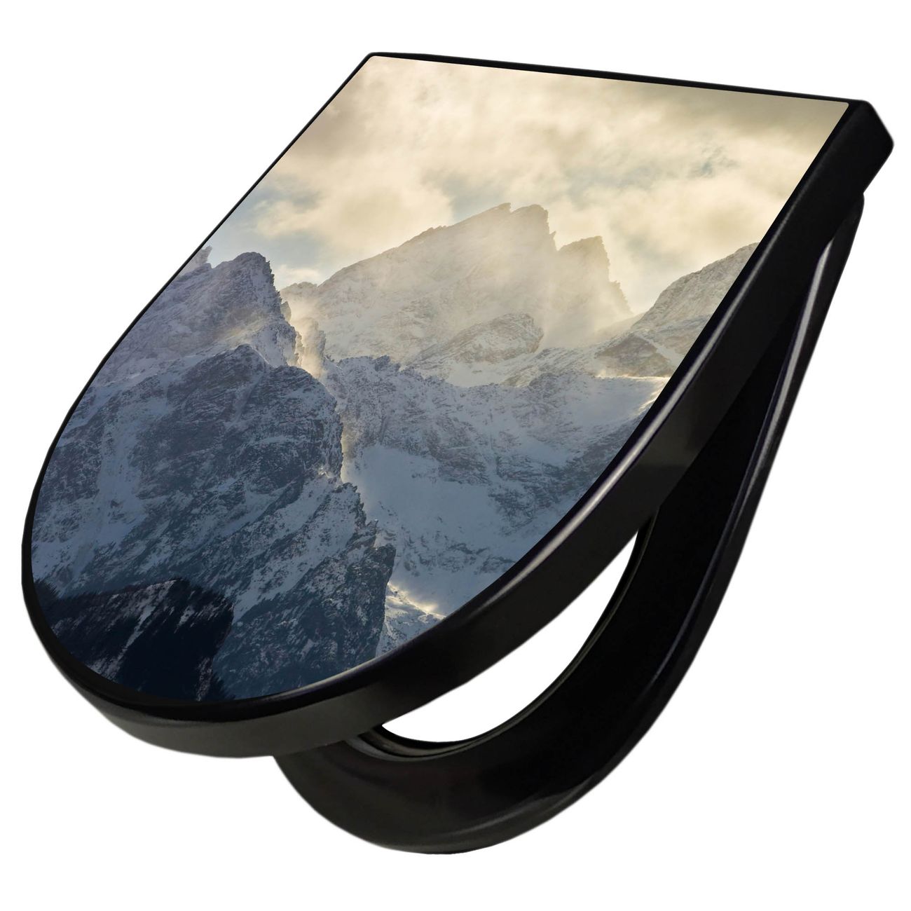 WC Sitz D-Form Schwarz mit Absenkautomatik Motiv Alpen im Sonnenschein
