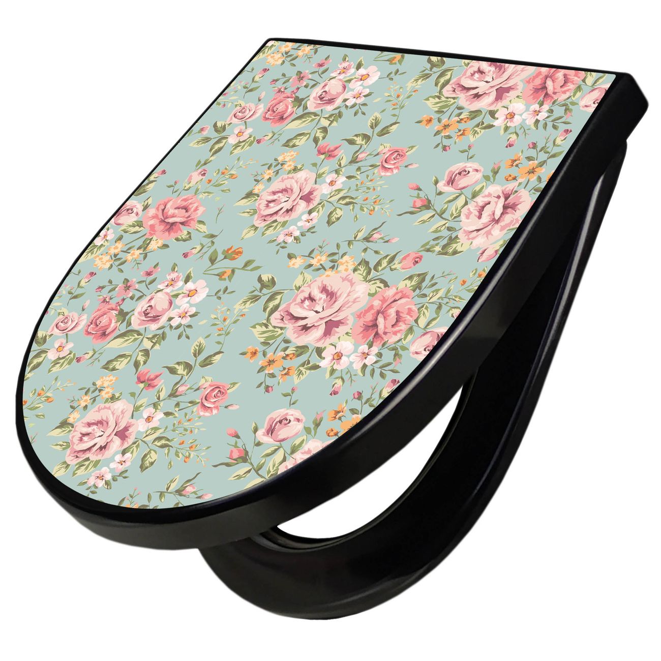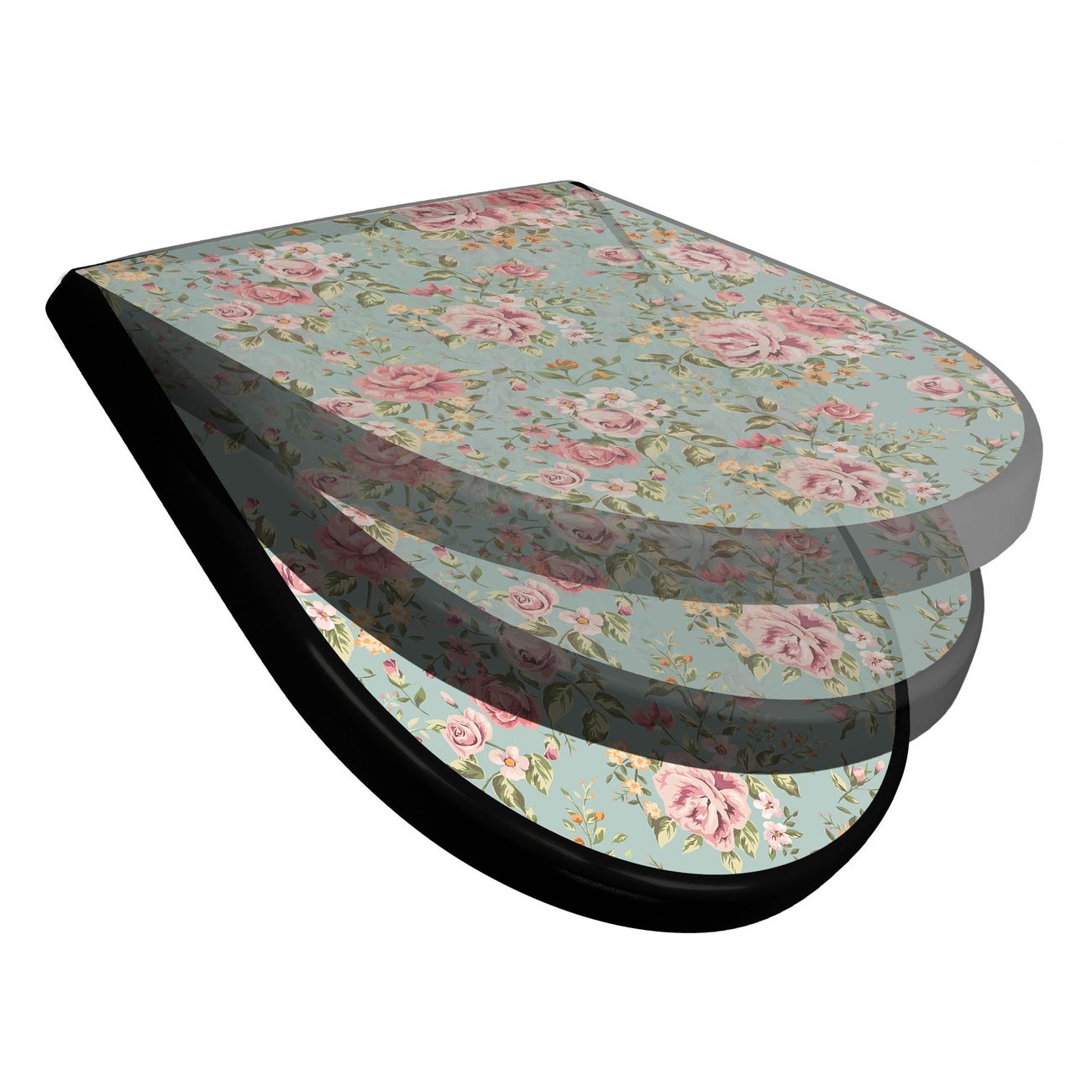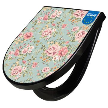WC Sitz D-Form Schwarz mit Absenkautomatik Motiv Altrosa Blume