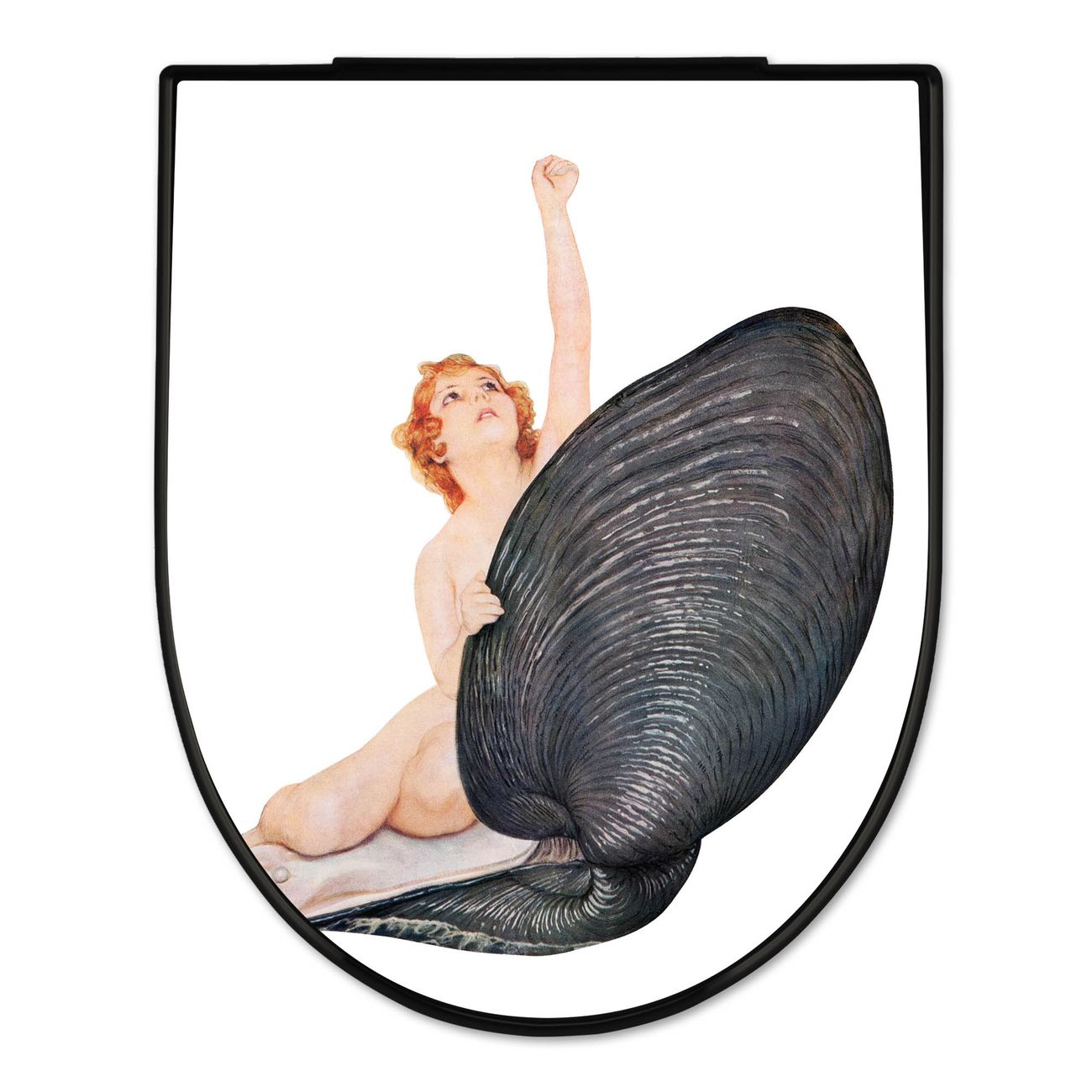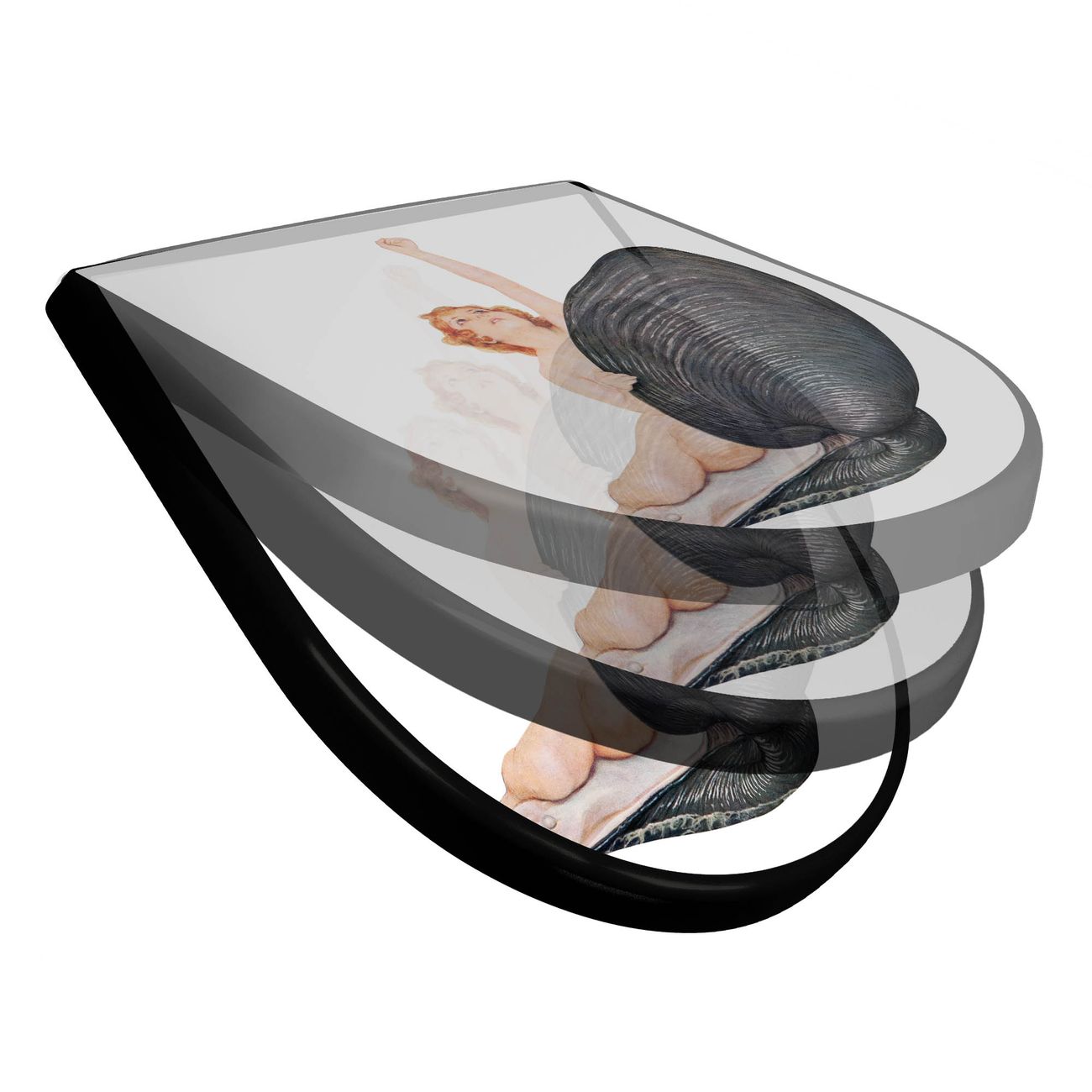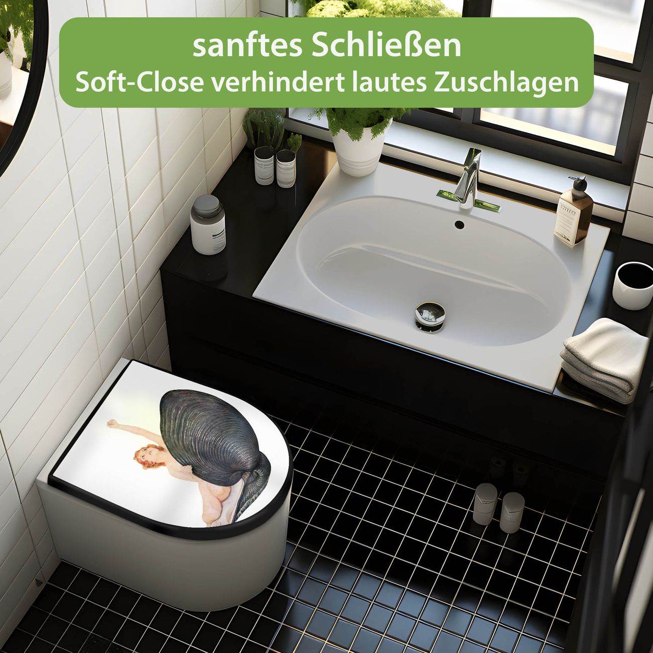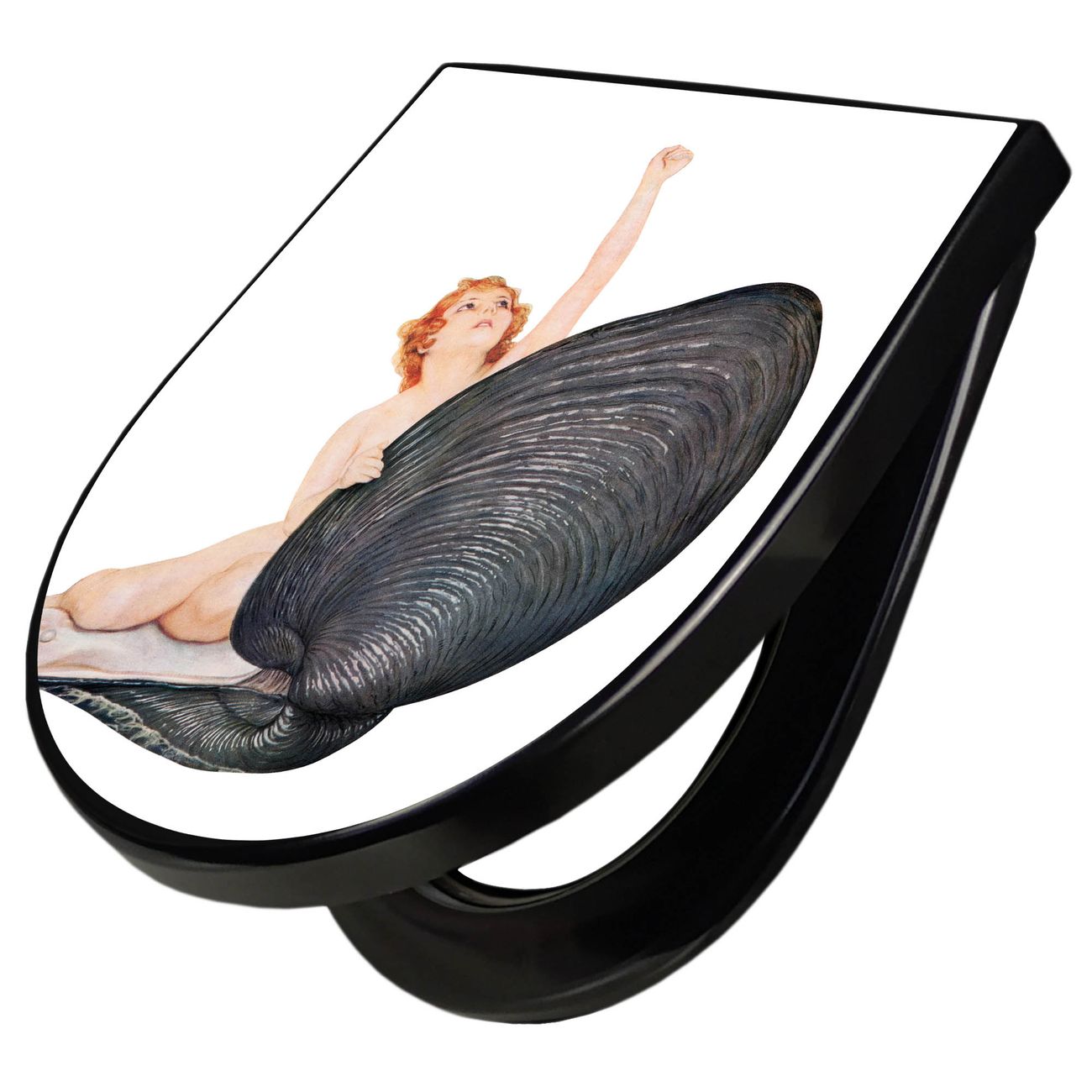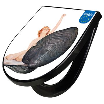 WC Sitz D-Form Schwarz mit Absenkautomatik Motiv Aufbruch aus der Muschel Vintage