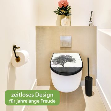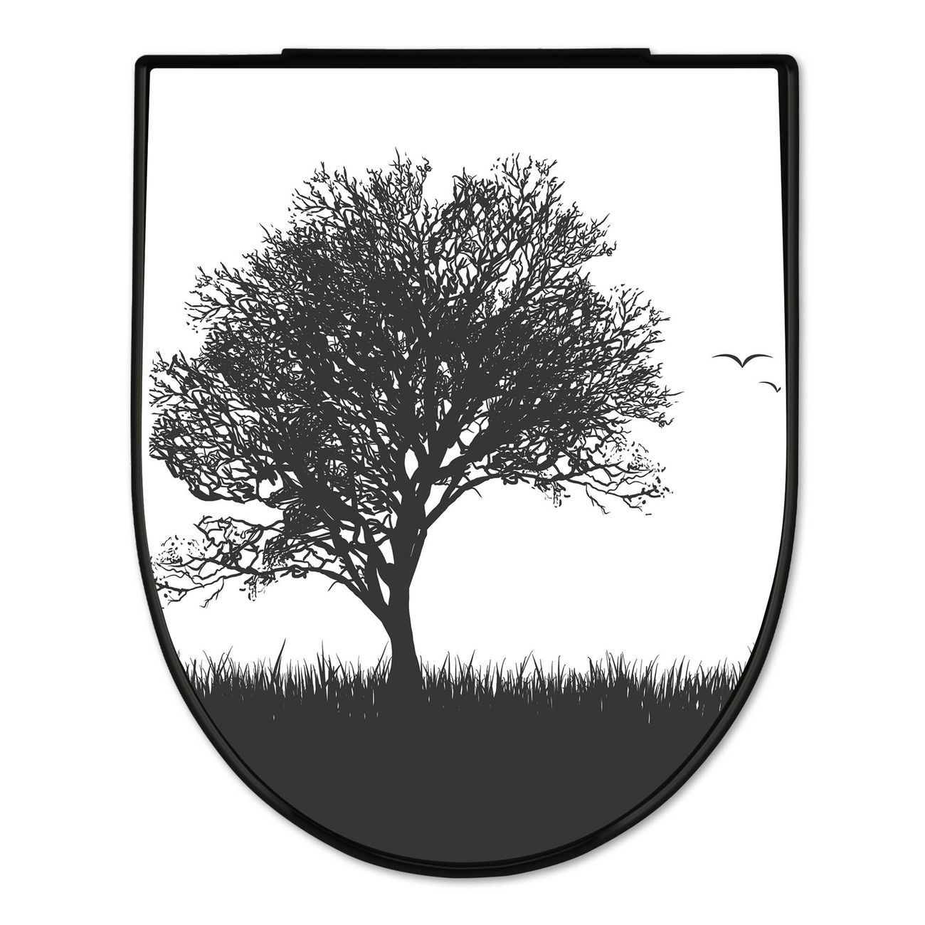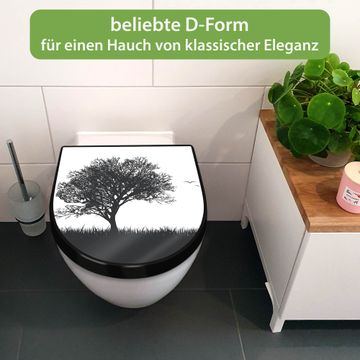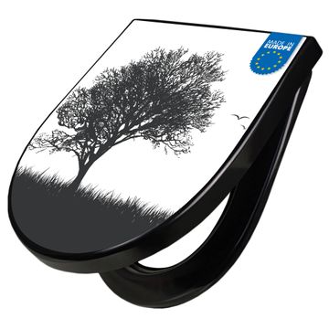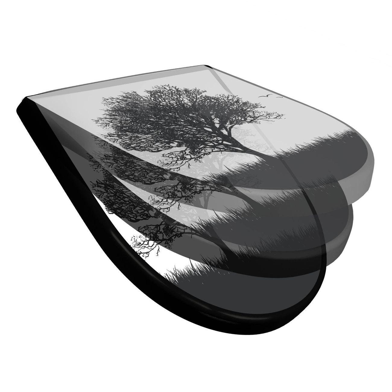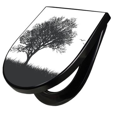 WC Sitz D-Form Schwarz mit Absenkautomatik Motiv Baum und Vögel Silhouette
