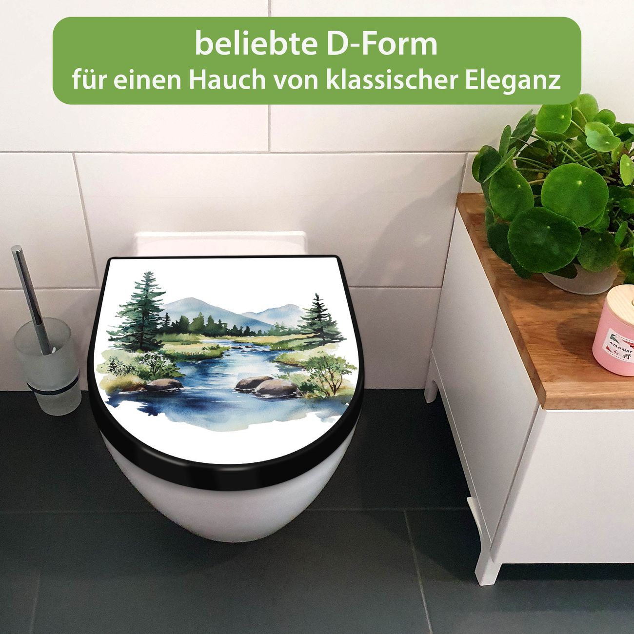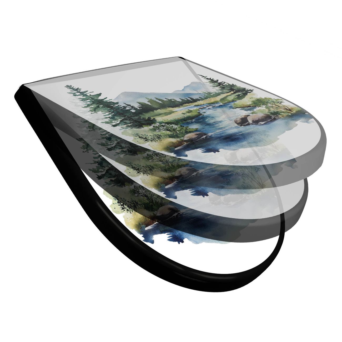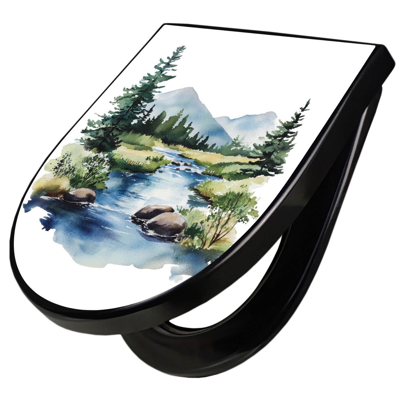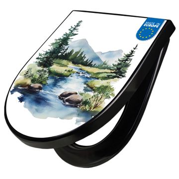WC Sitz D-Form Schwarz mit Absenkautomatik Motiv Bergfluss in der Natur