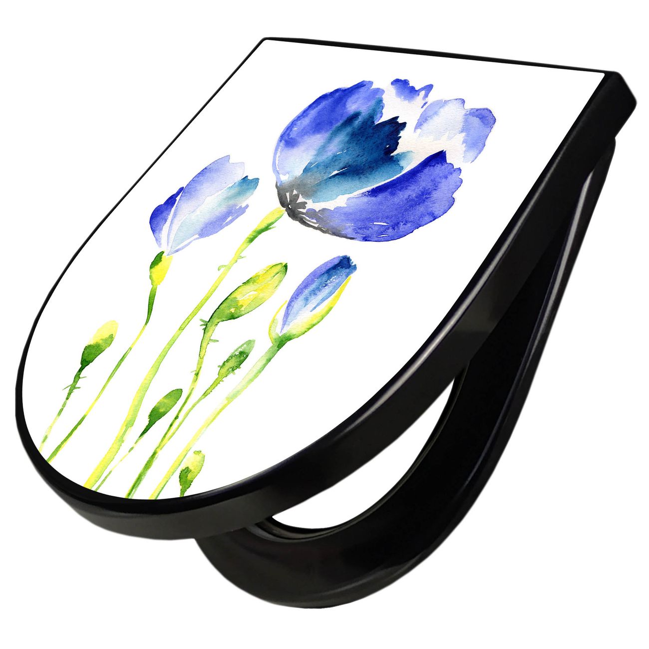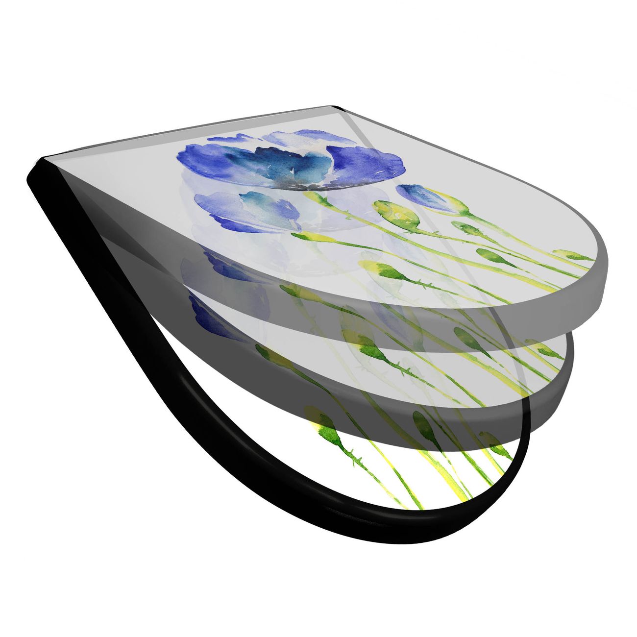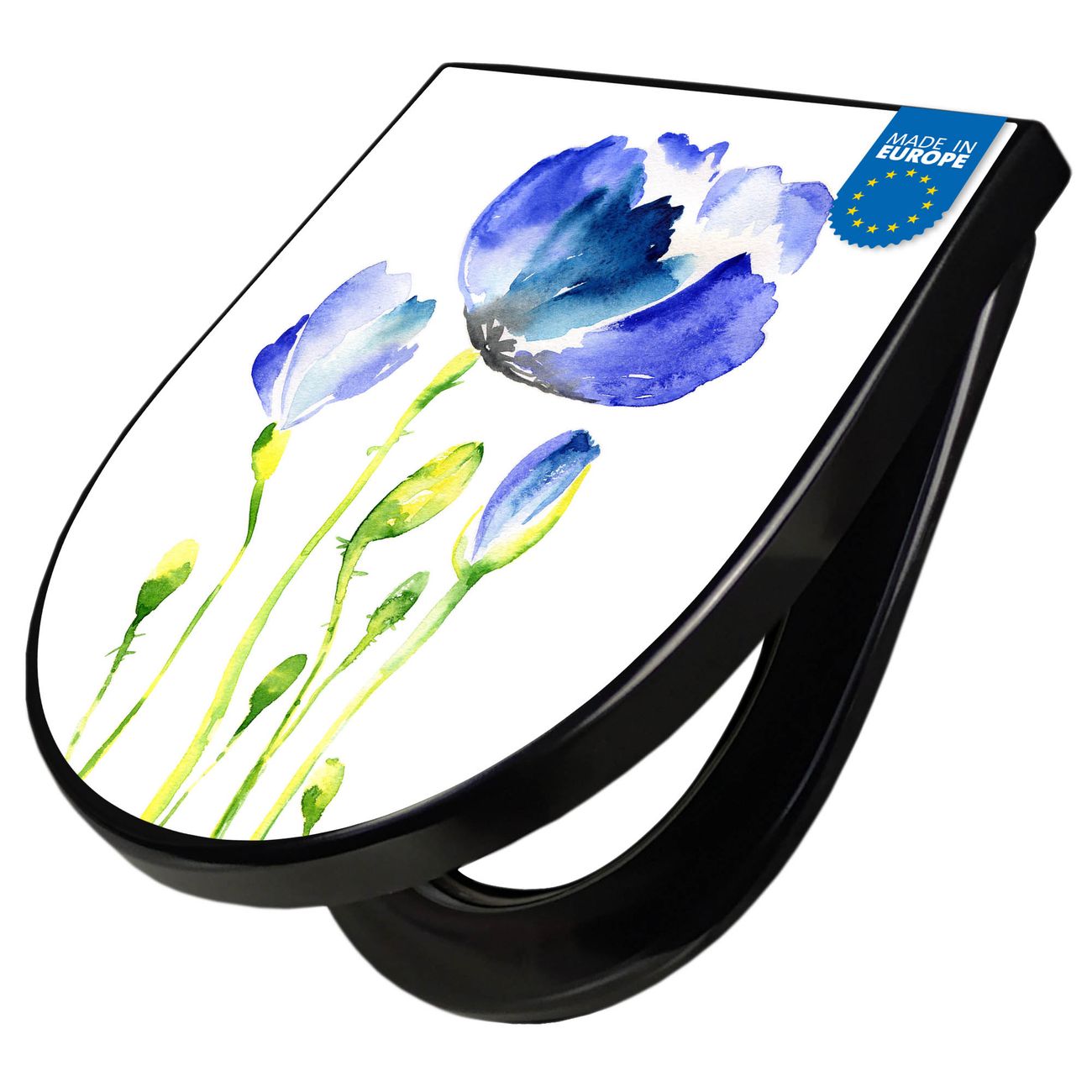 WC Sitz D-Form Schwarz mit Absenkautomatik Motiv Blauer Mohn