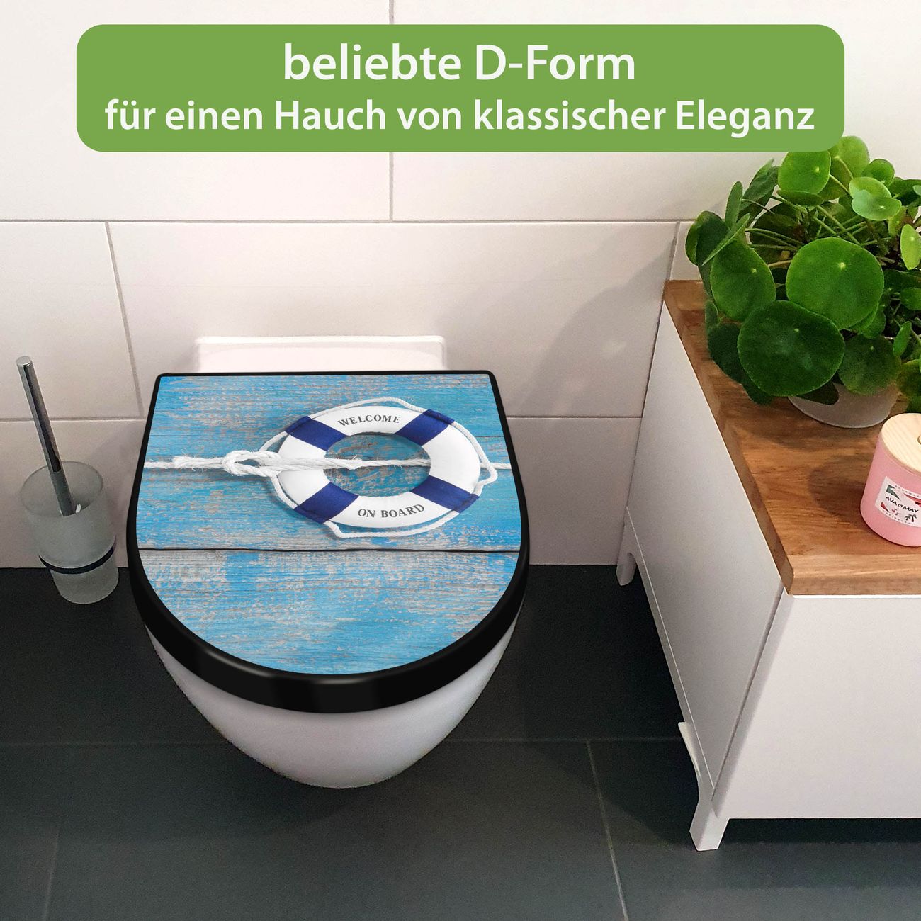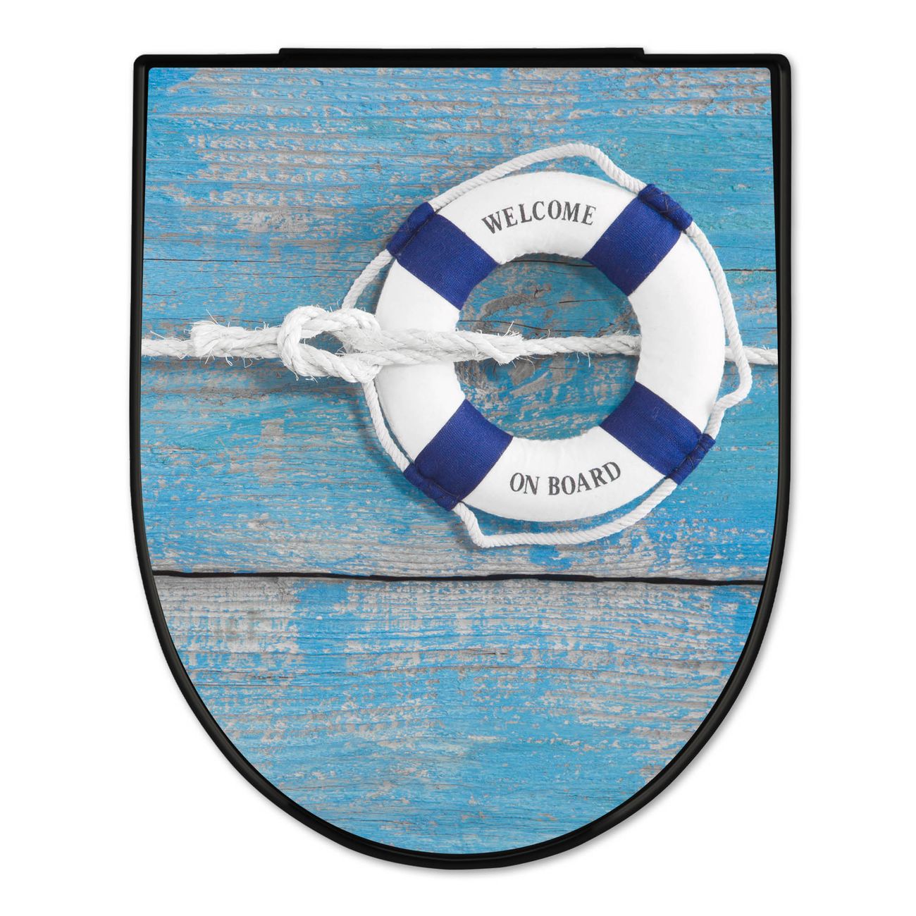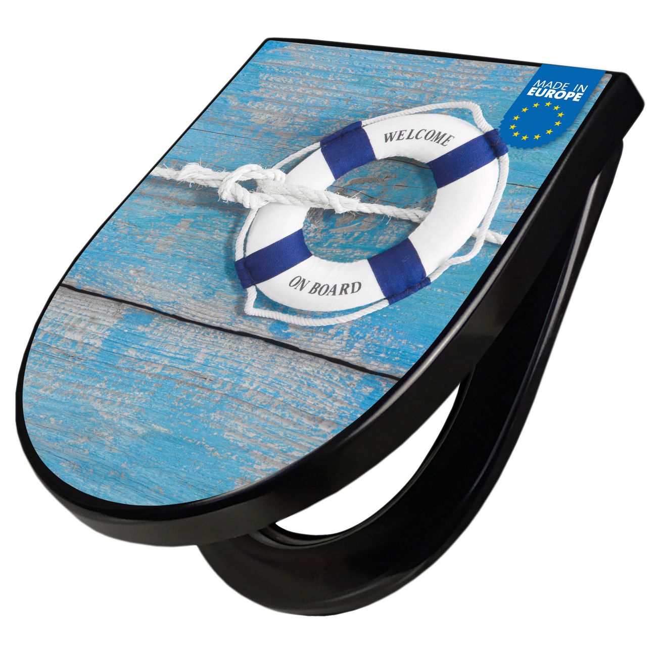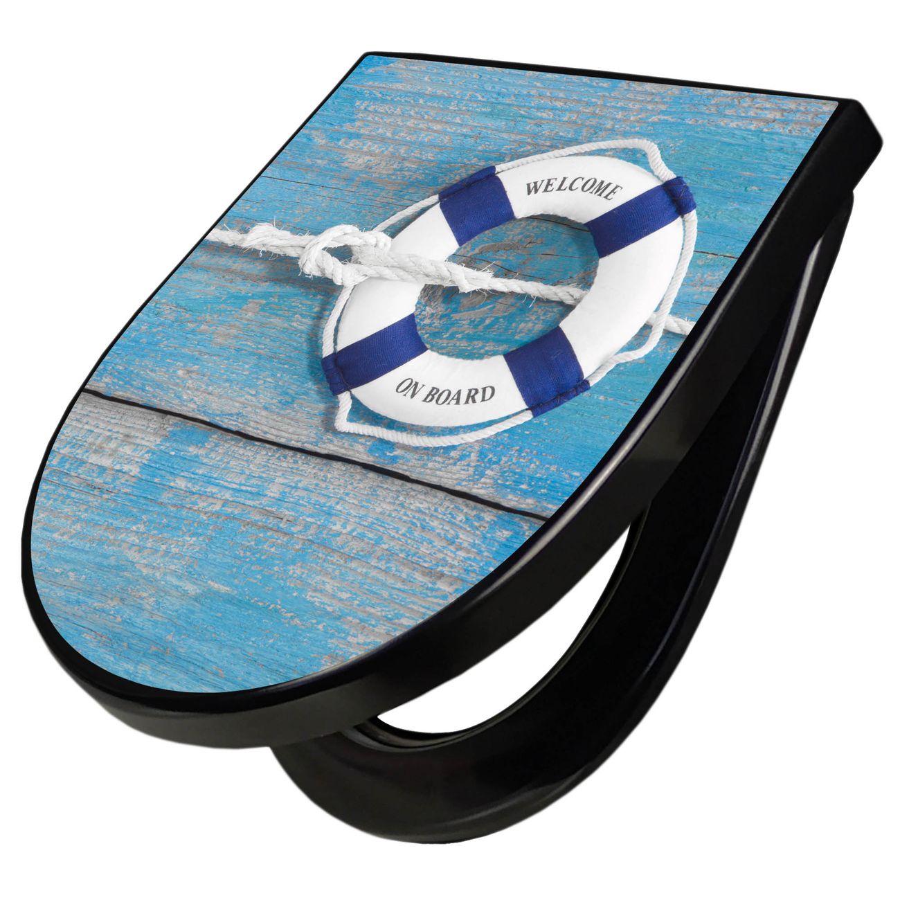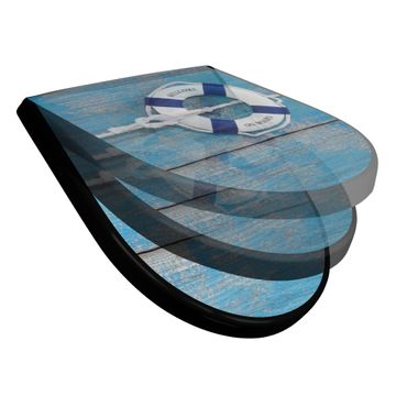 WC Sitz D-Form Schwarz mit Absenkautomatik Motiv Blauer Rettungsring