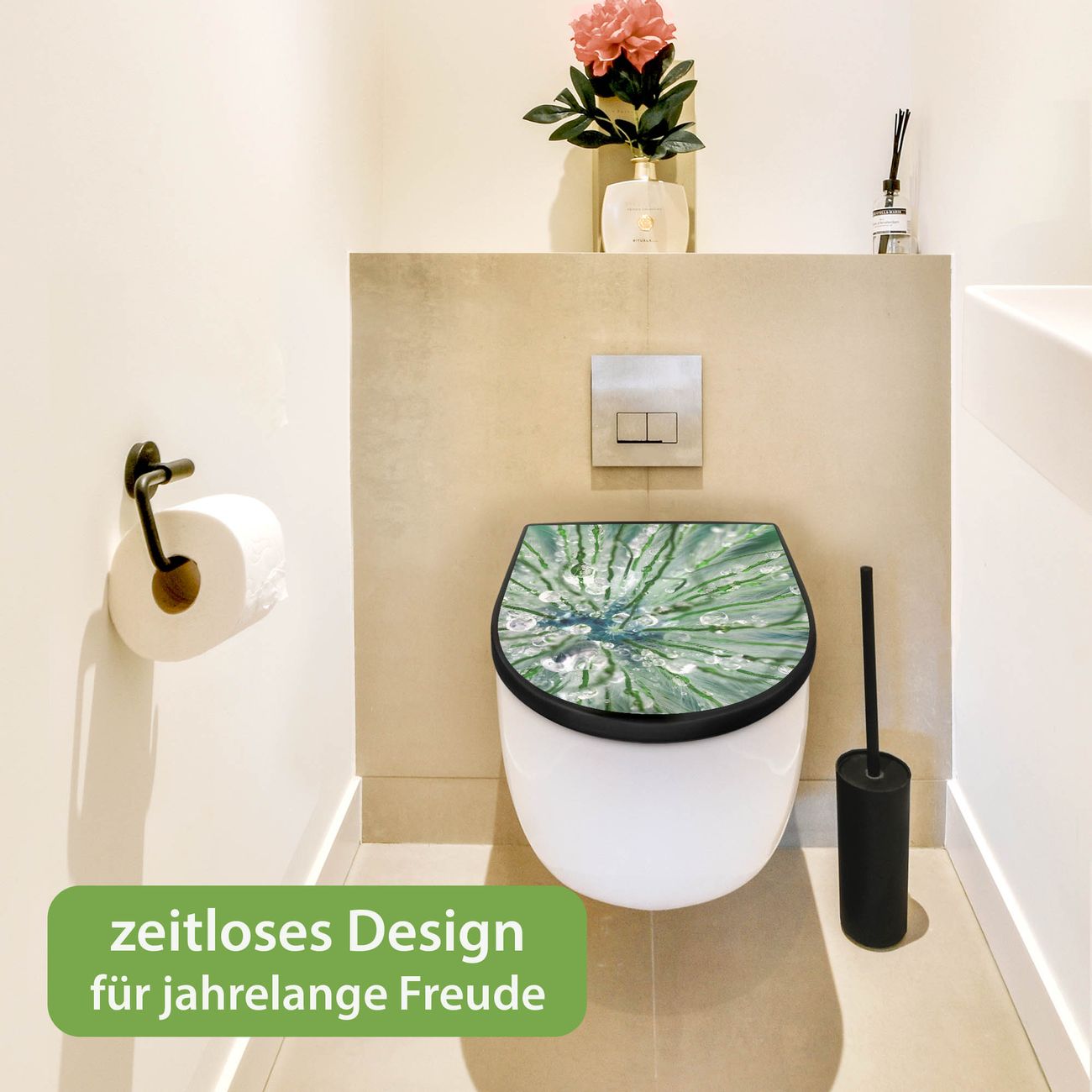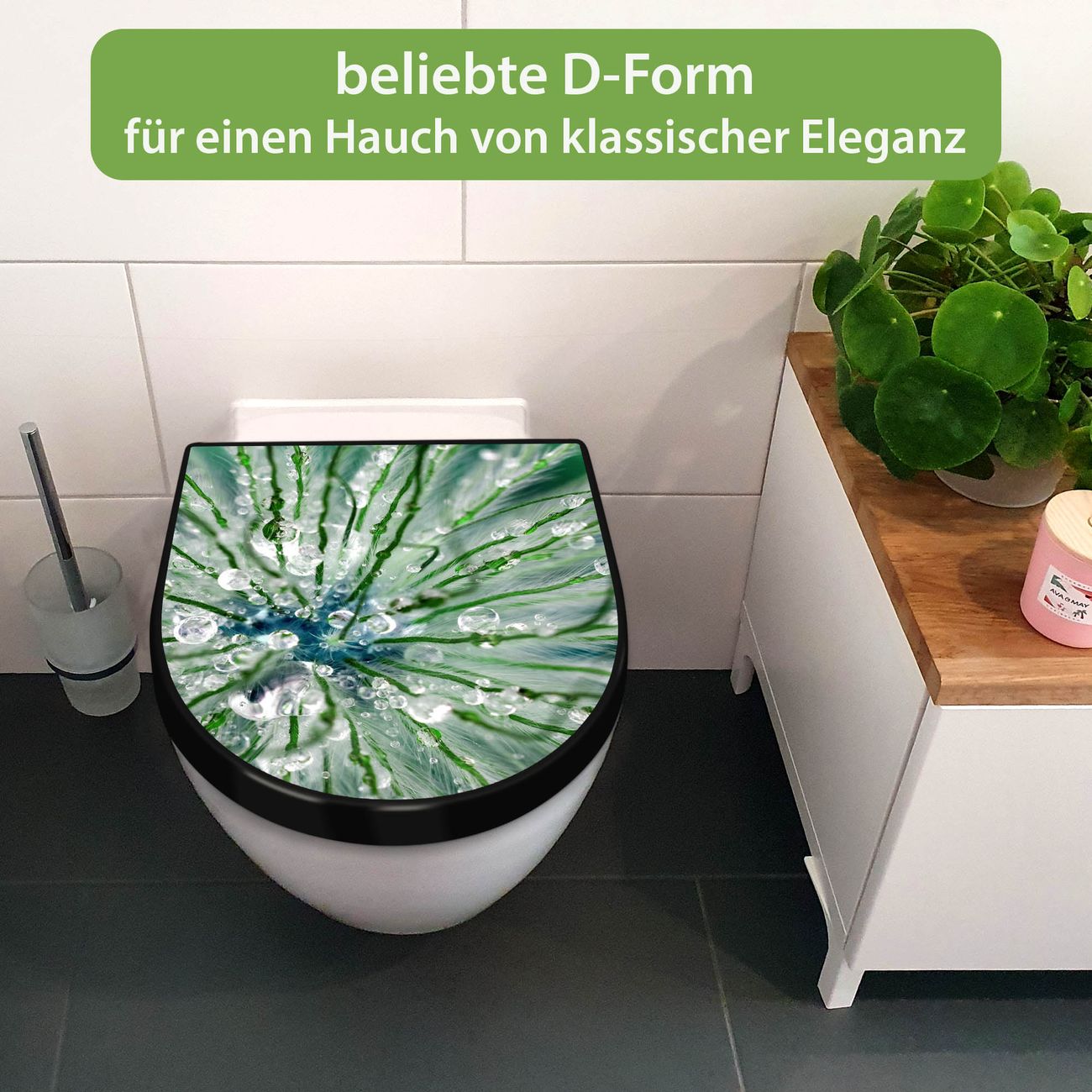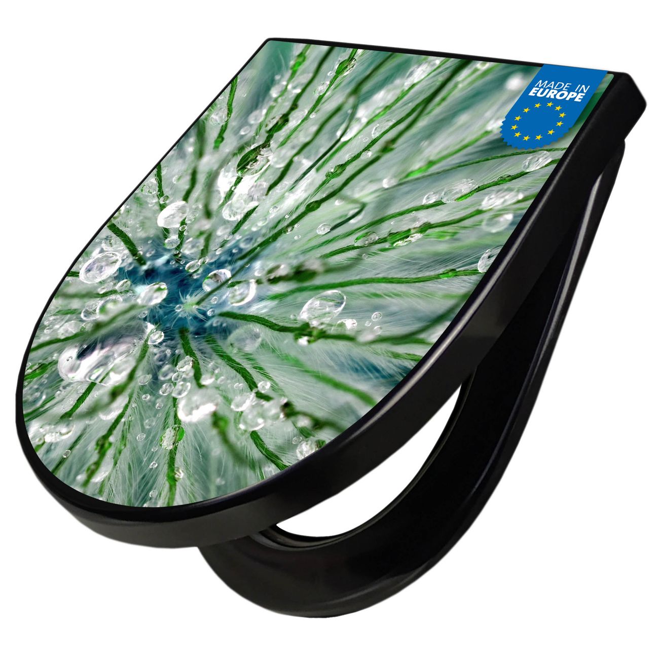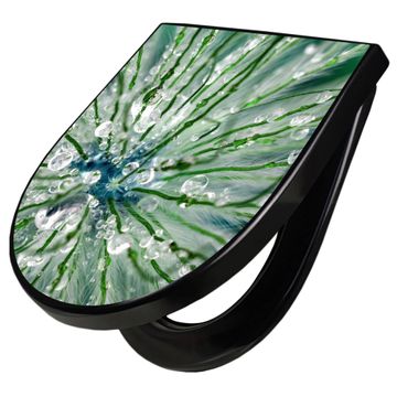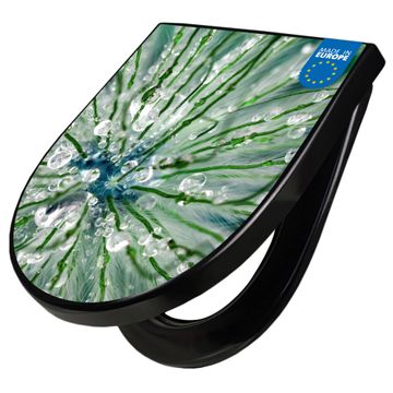 WC Sitz D-Form Schwarz mit Absenkautomatik Motiv Blüte Mit Tautropfen