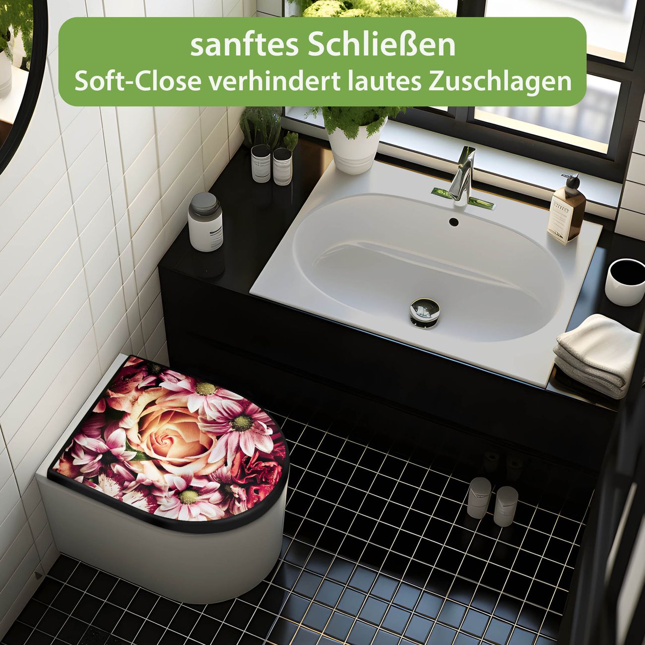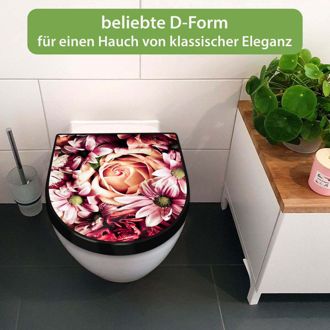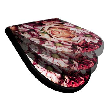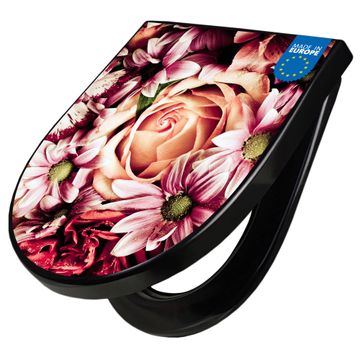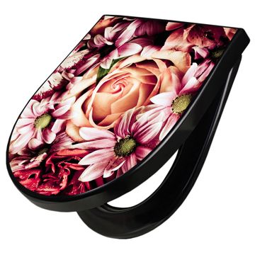 WC Sitz D-Form Schwarz mit Absenkautomatik Motiv Brautstrauss