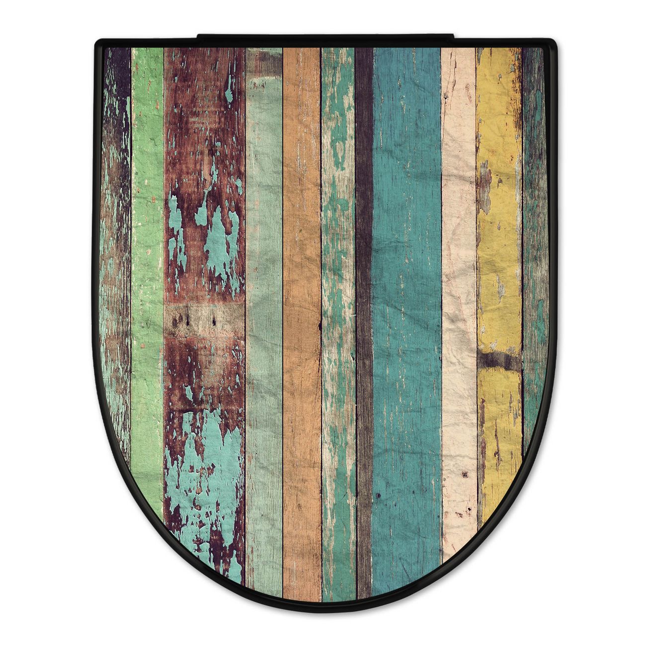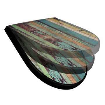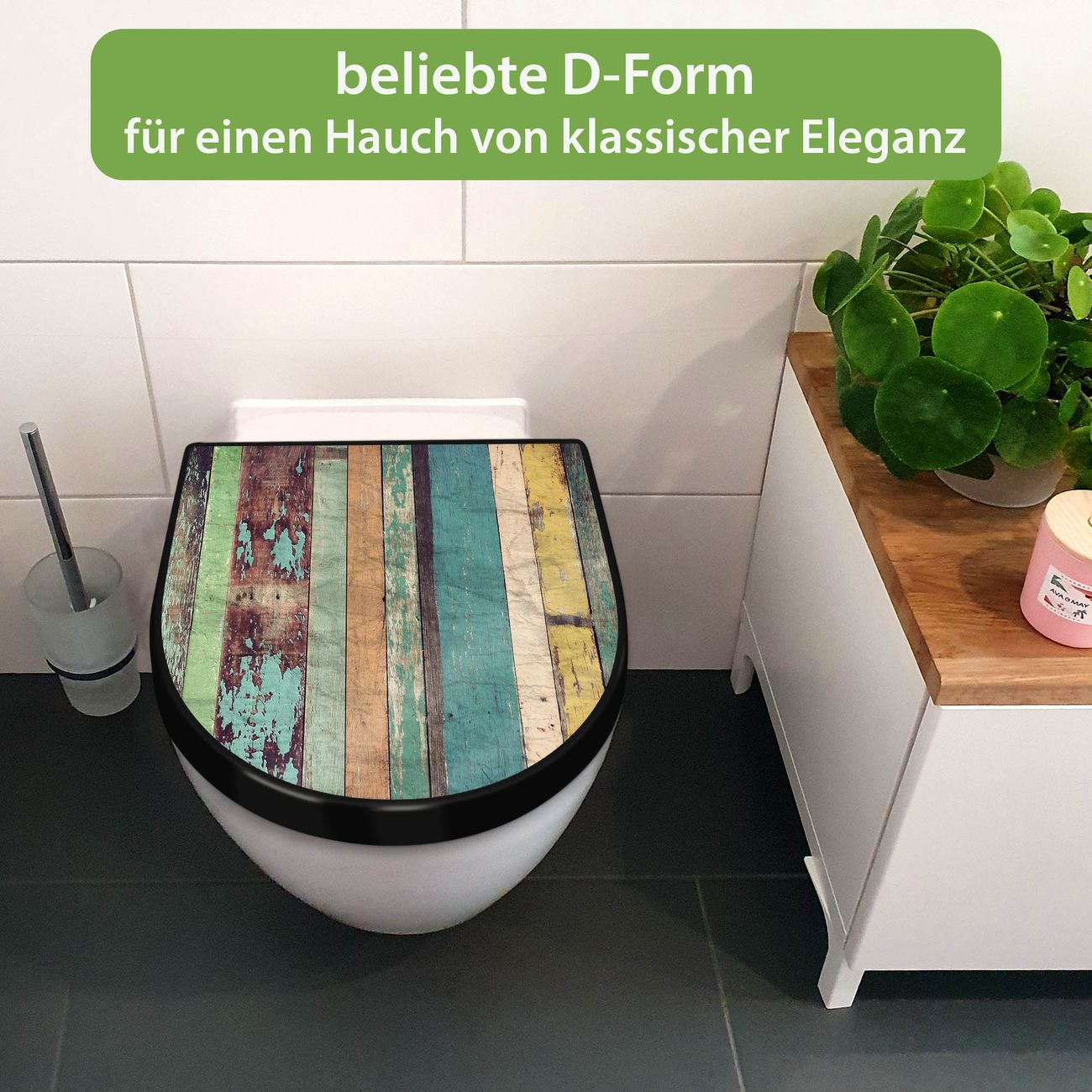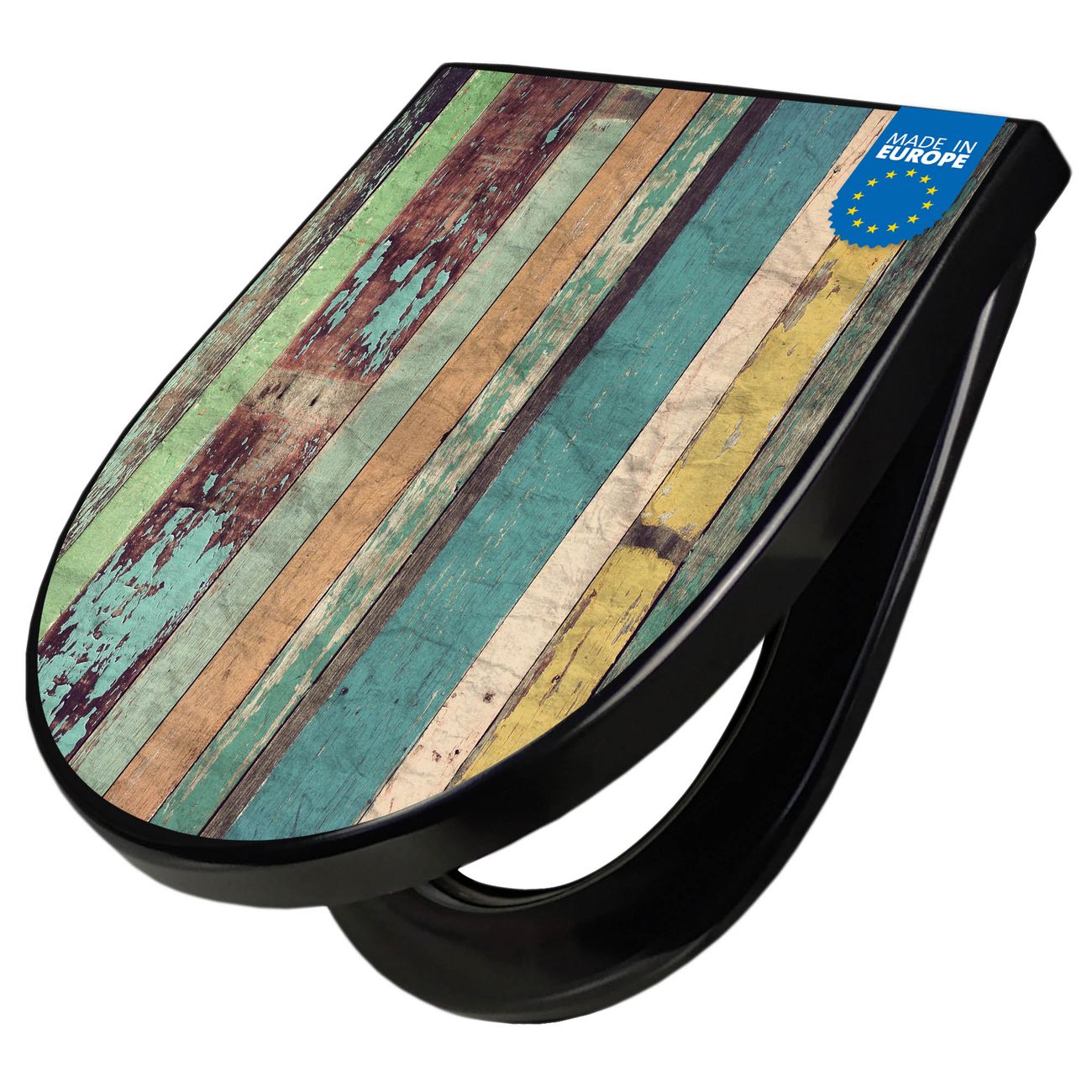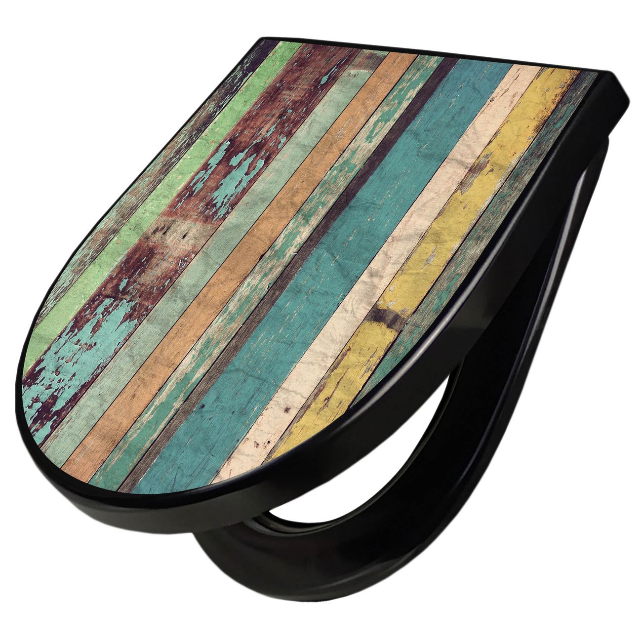 WC Sitz D-Form Schwarz mit Absenkautomatik Motiv Bunte Bretterwand