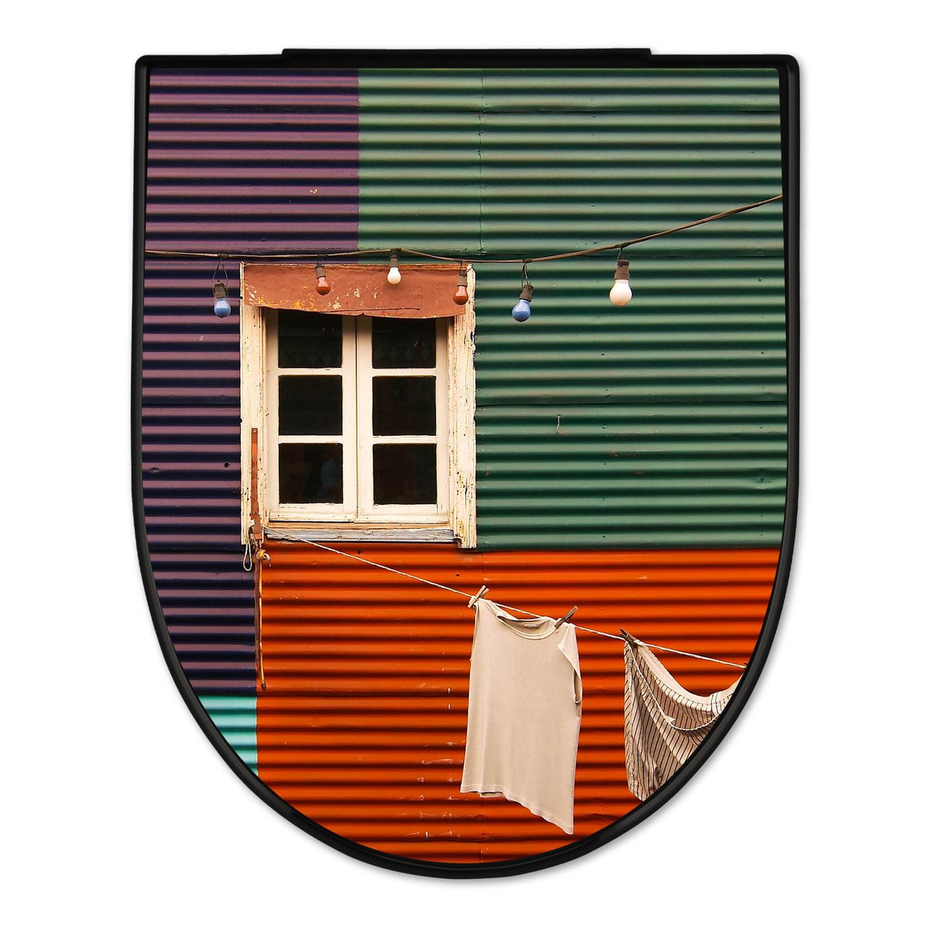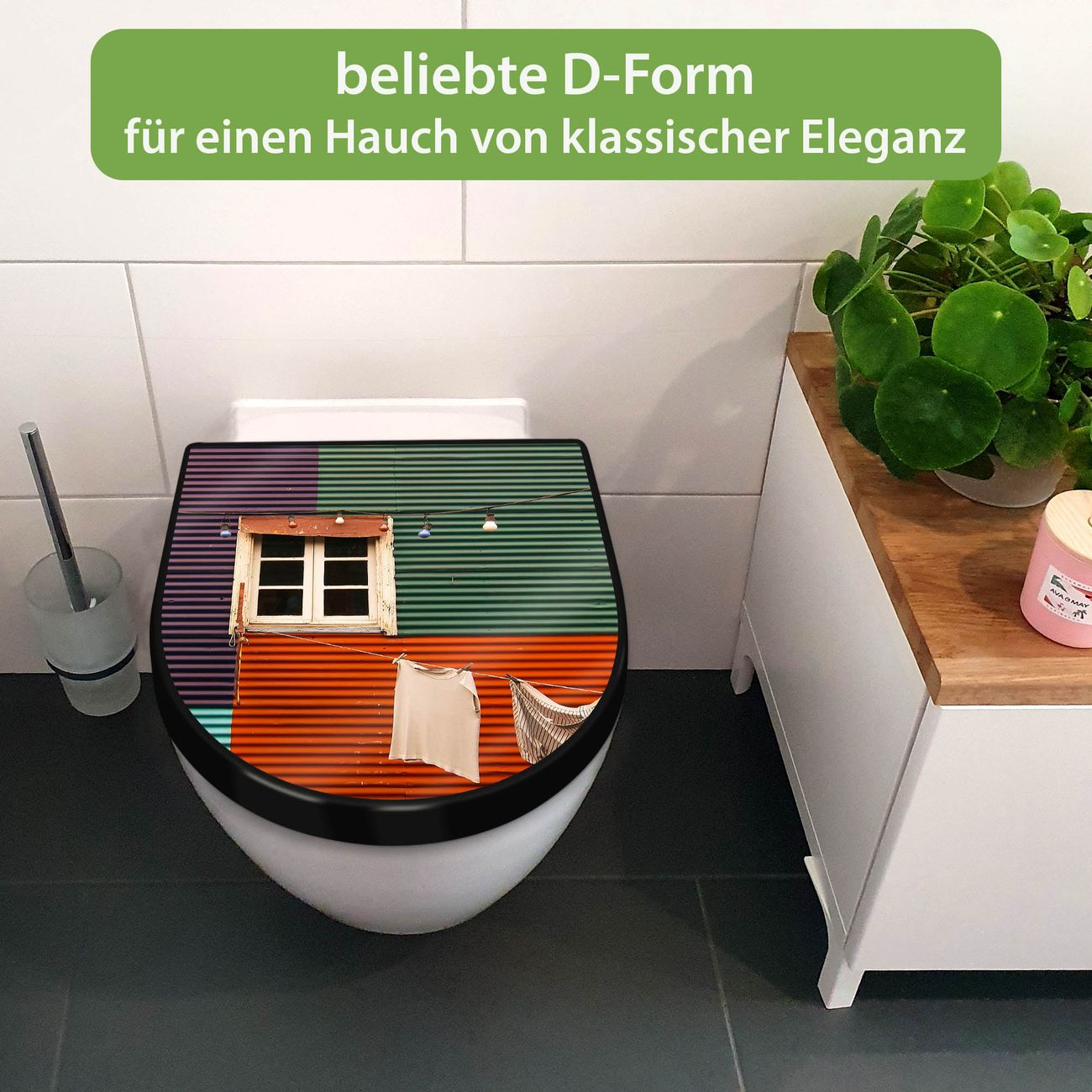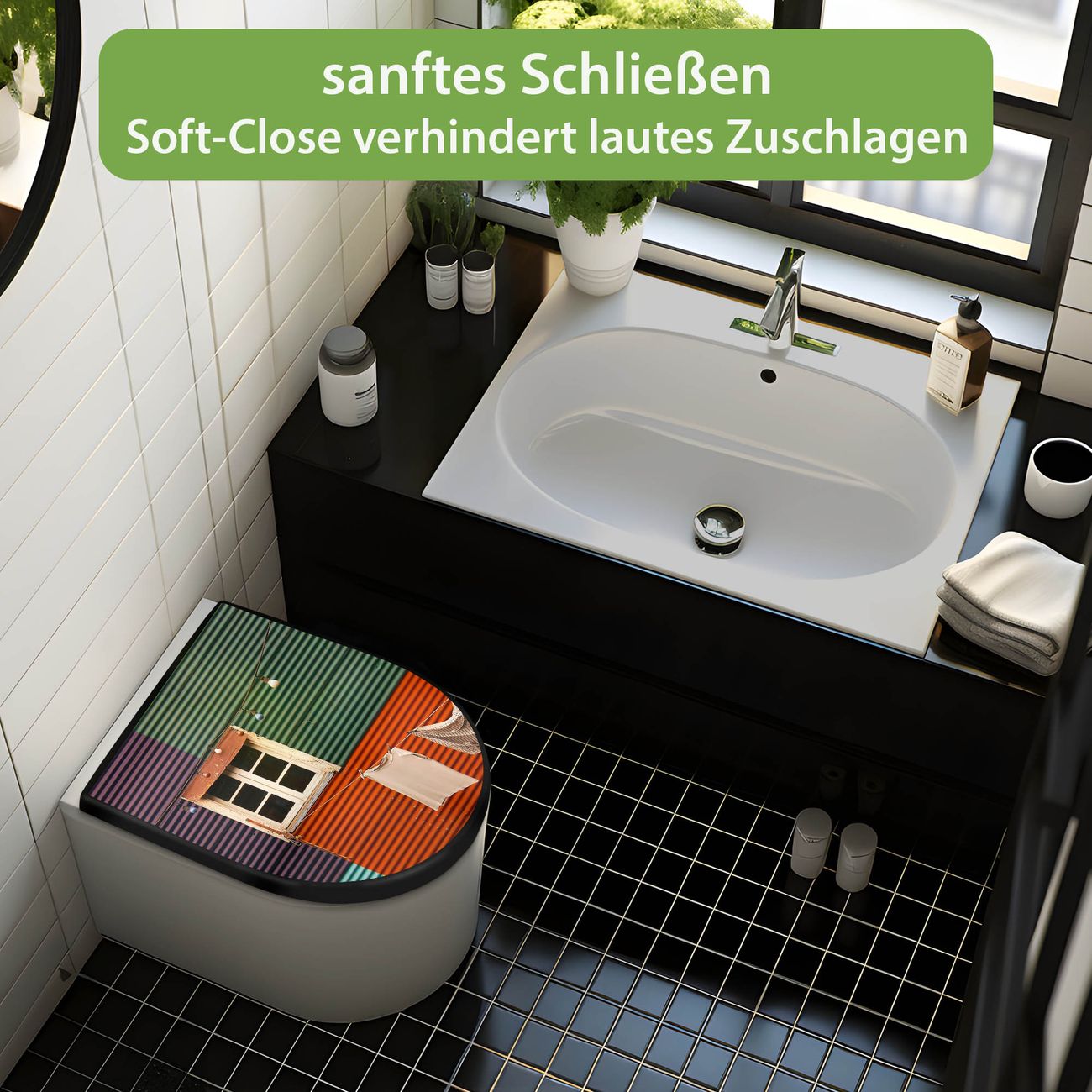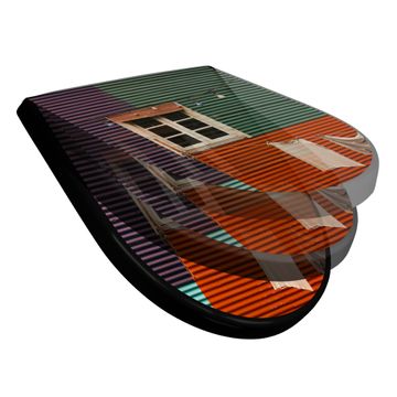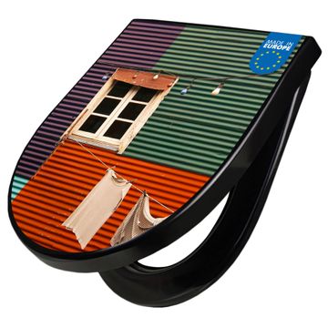 WC Sitz D-Form Schwarz mit Absenkautomatik Motiv Buntes Haus