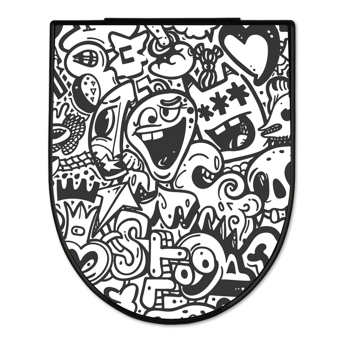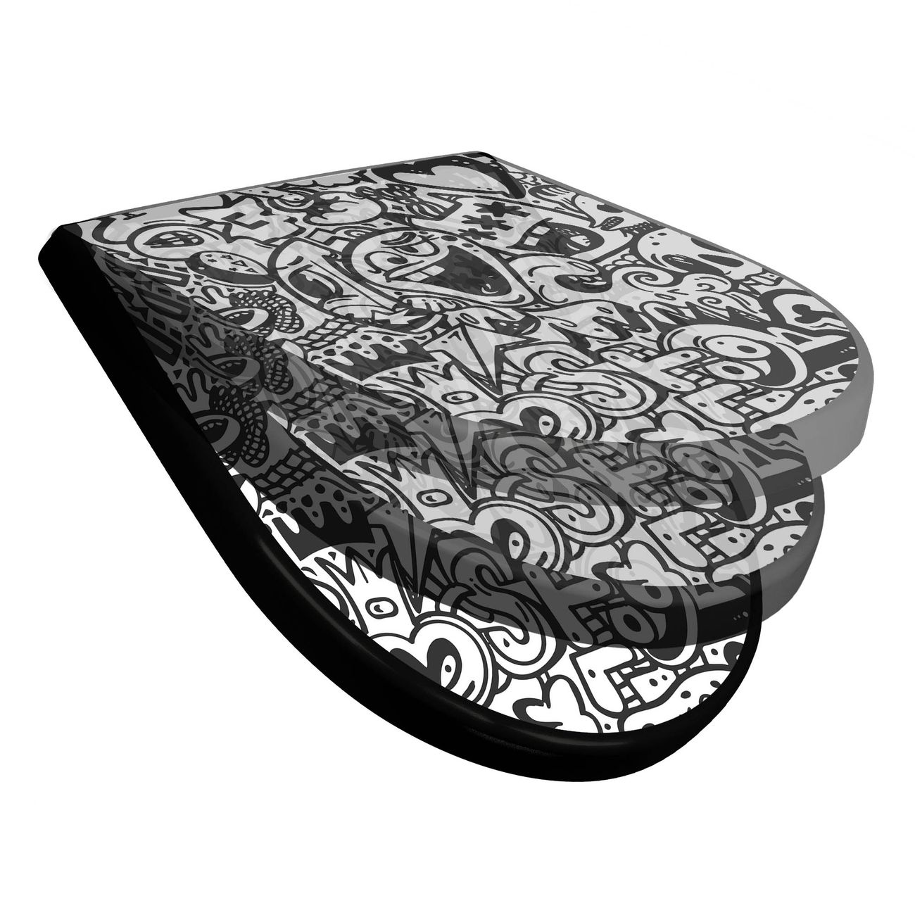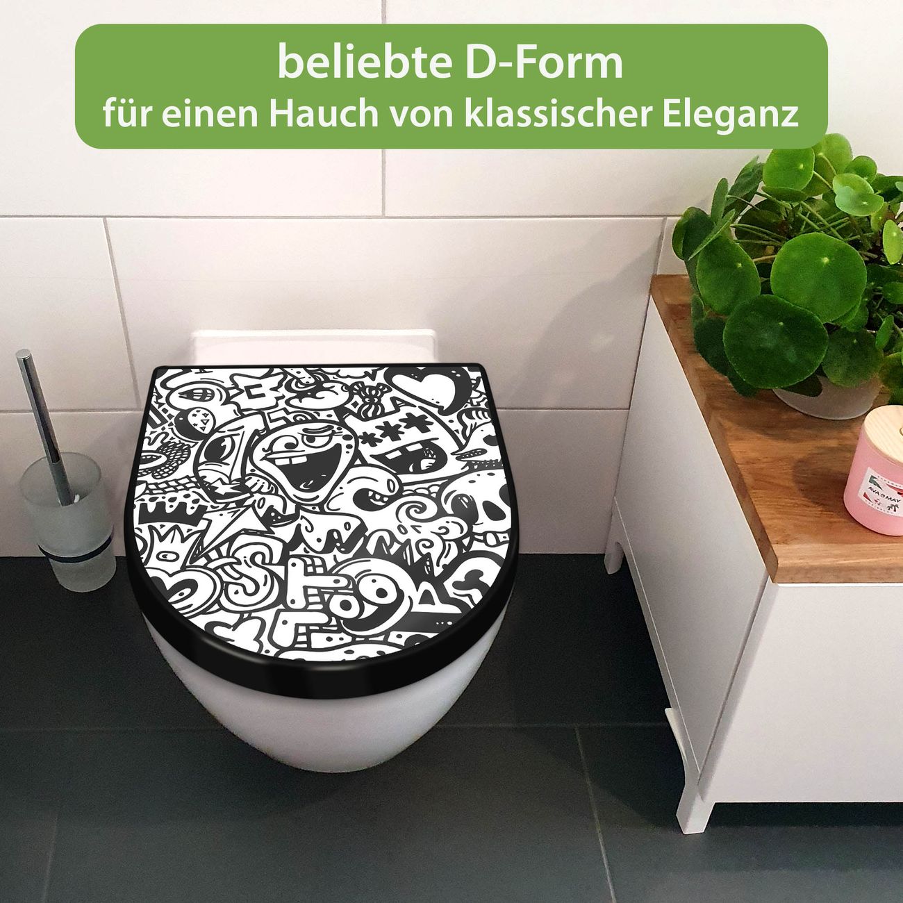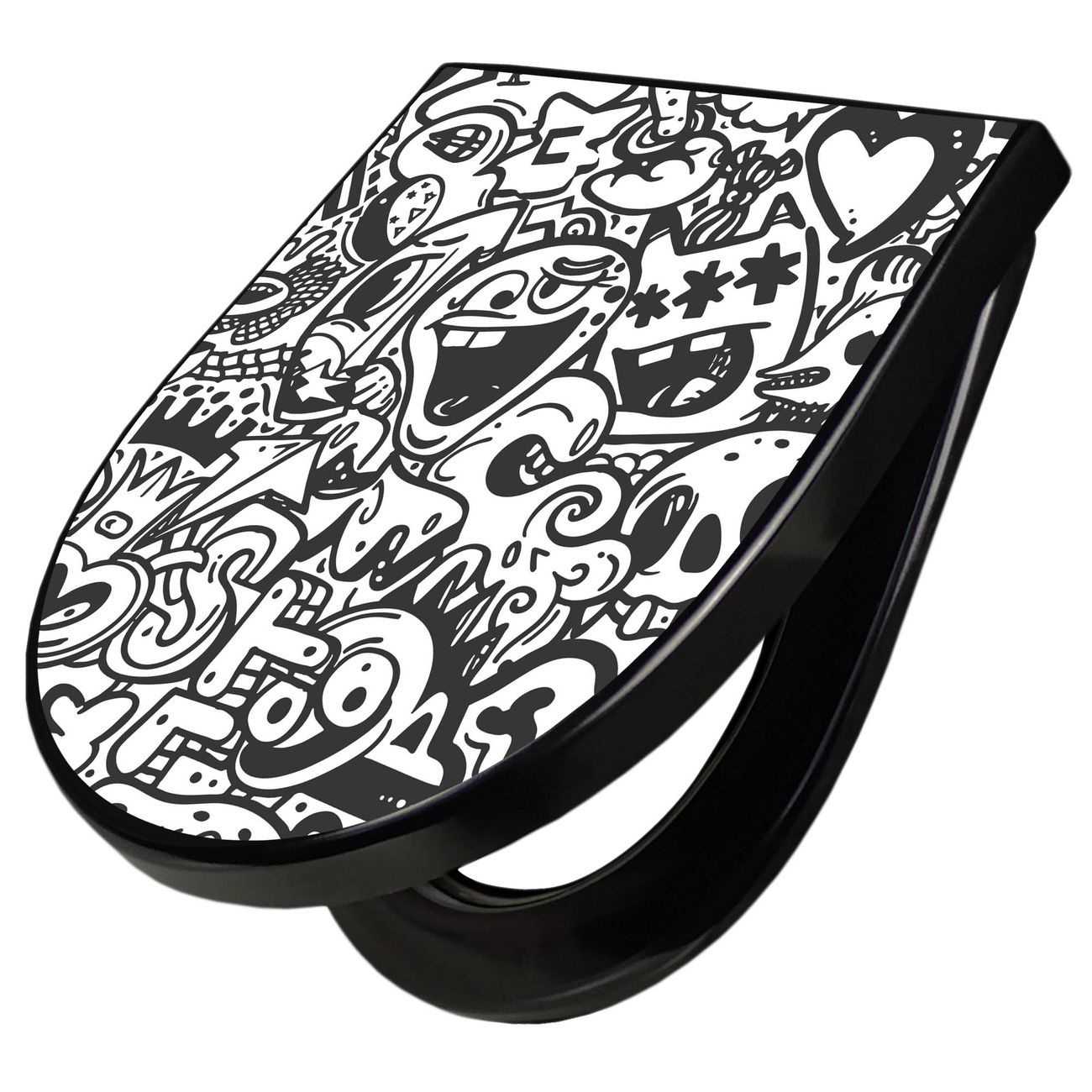 WC Sitz D-Form Schwarz mit Absenkautomatik Motiv Doodle Verrückt