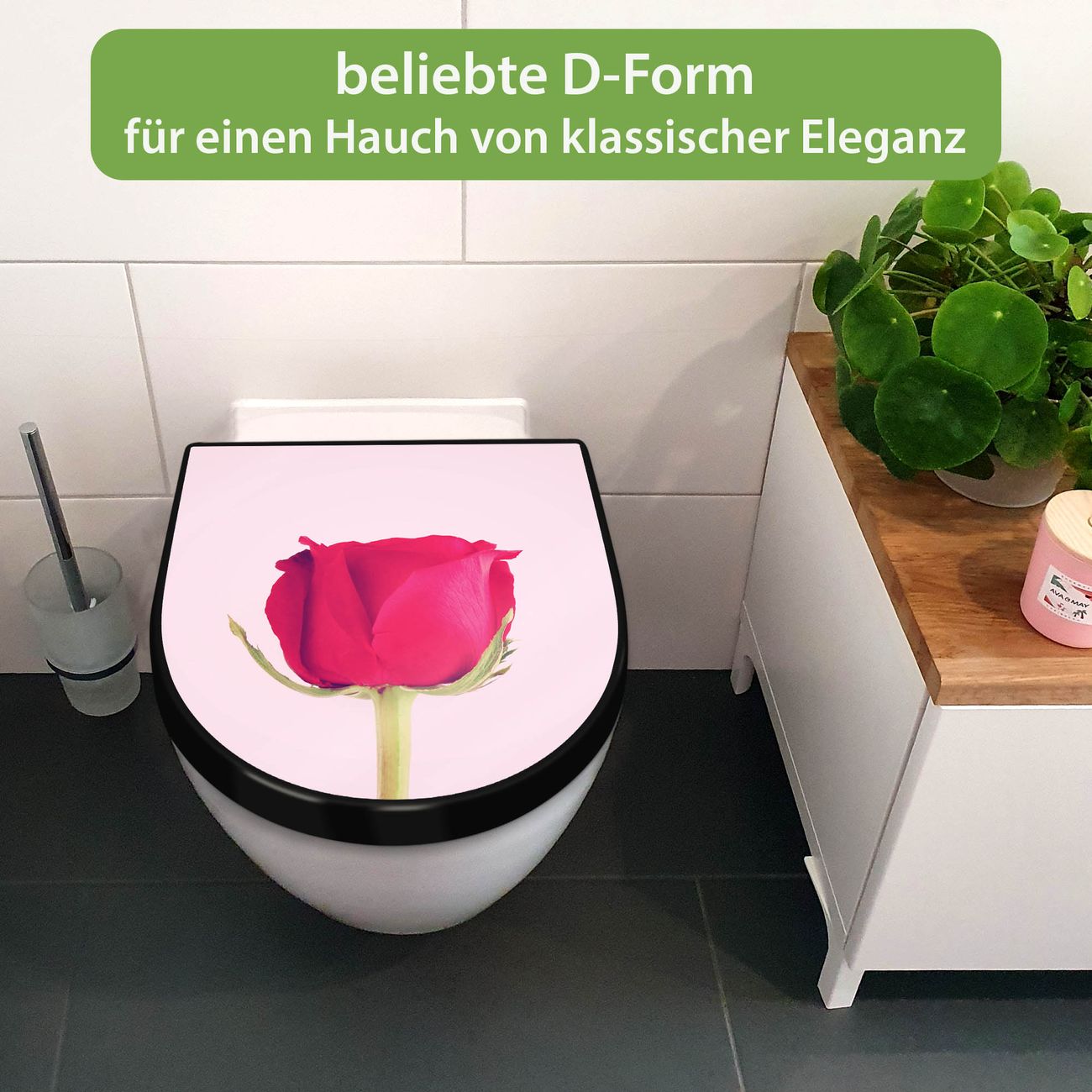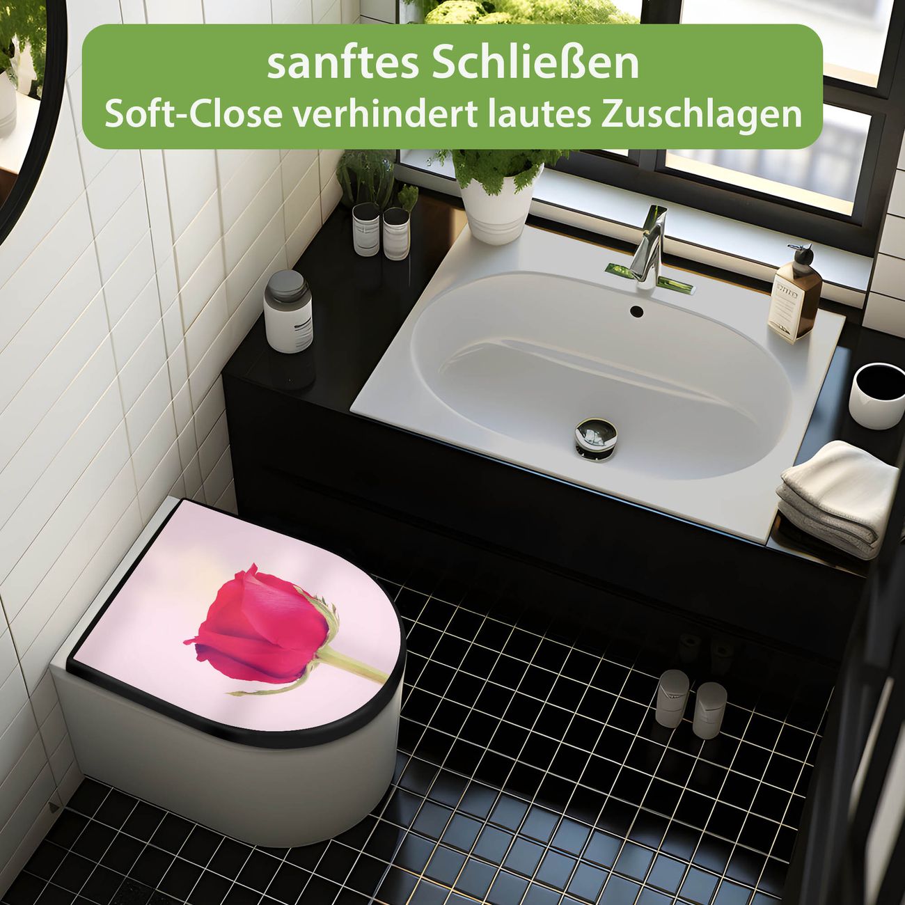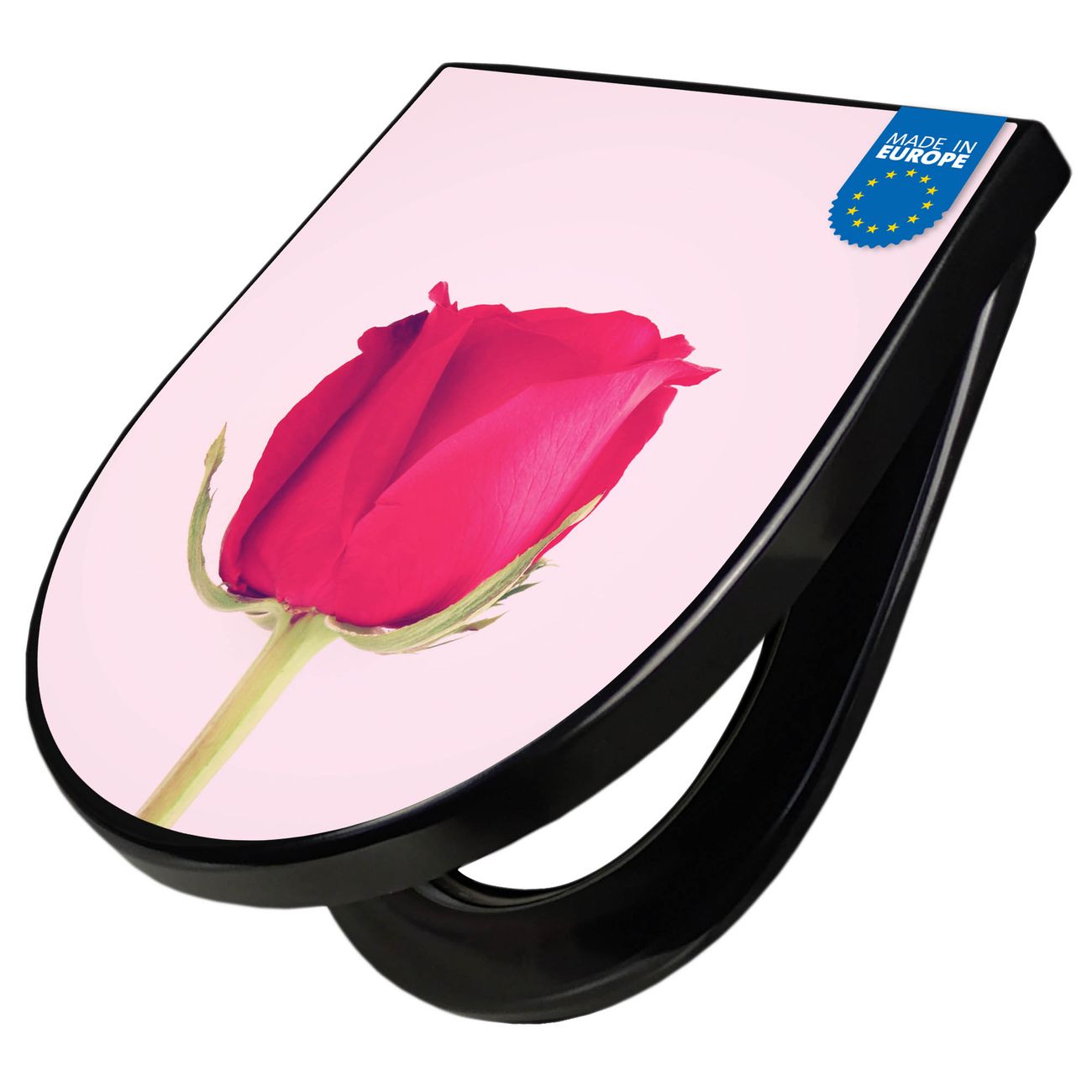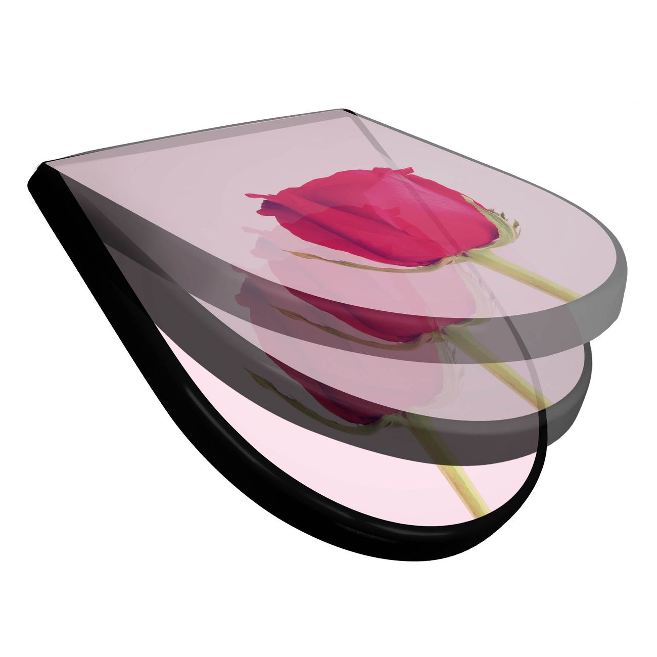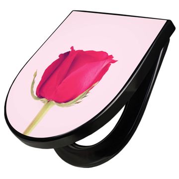 WC Sitz D-Form Schwarz mit Absenkautomatik Motiv Einzelne Rose